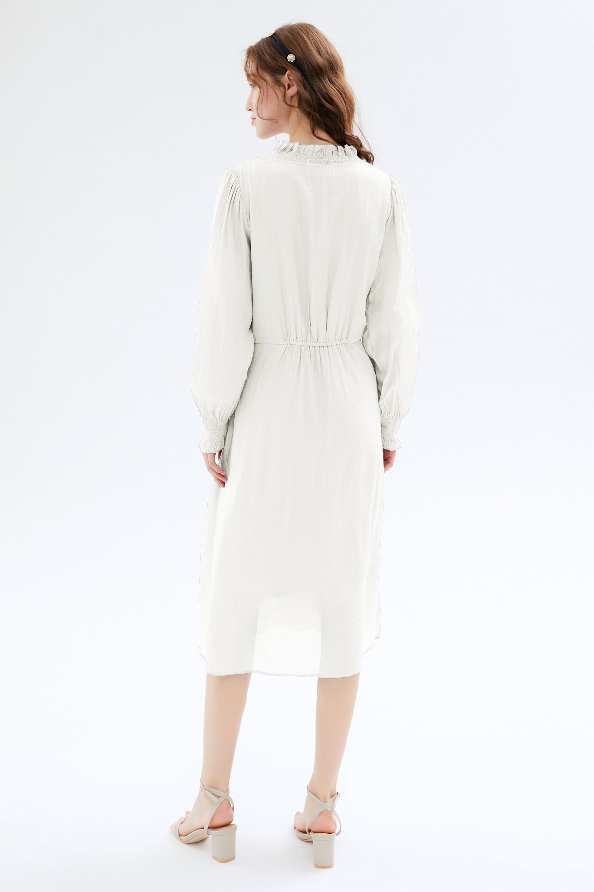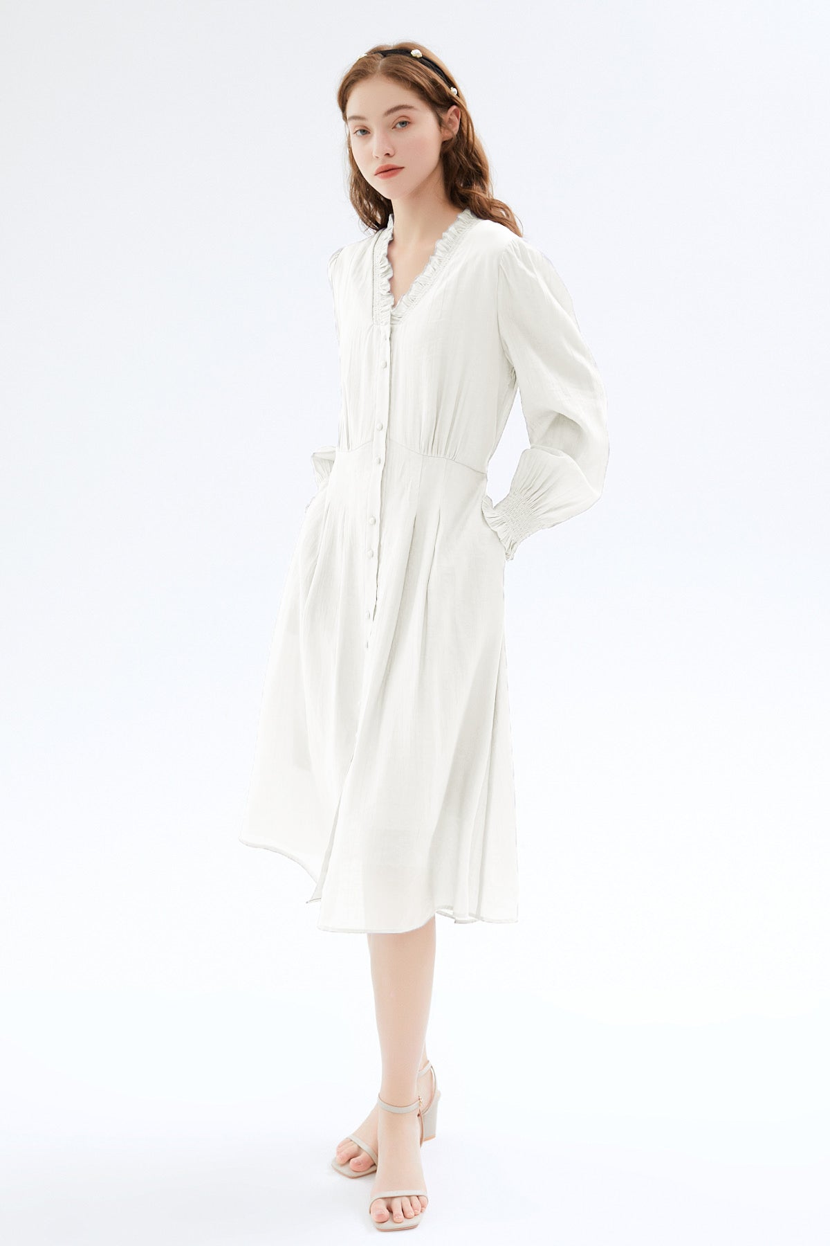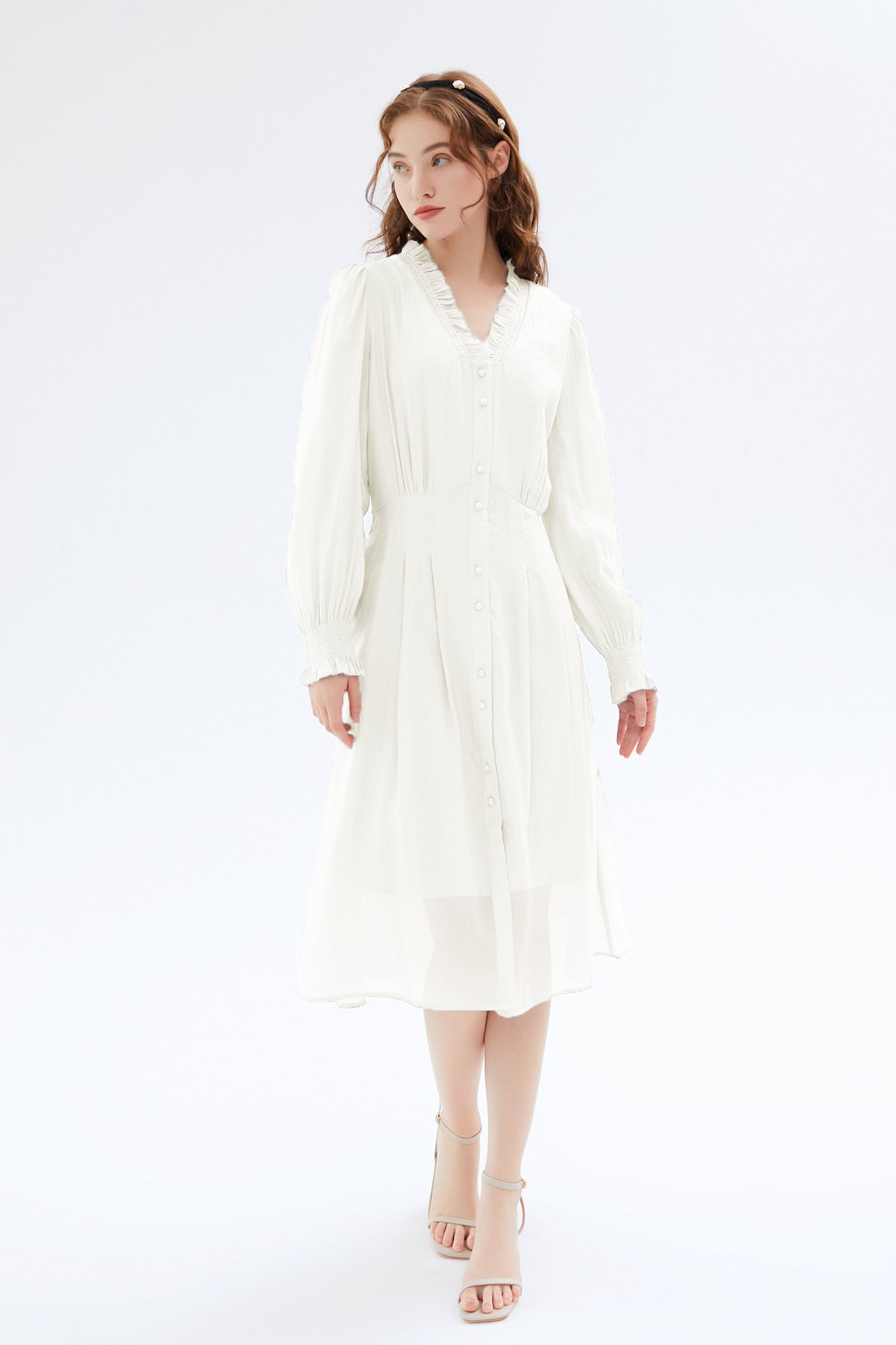 Create an airy and alluring silhouette with our beautiful dress, featuring a flattering ruffled V-neck and charming puff sleeves for effortless feminine style.