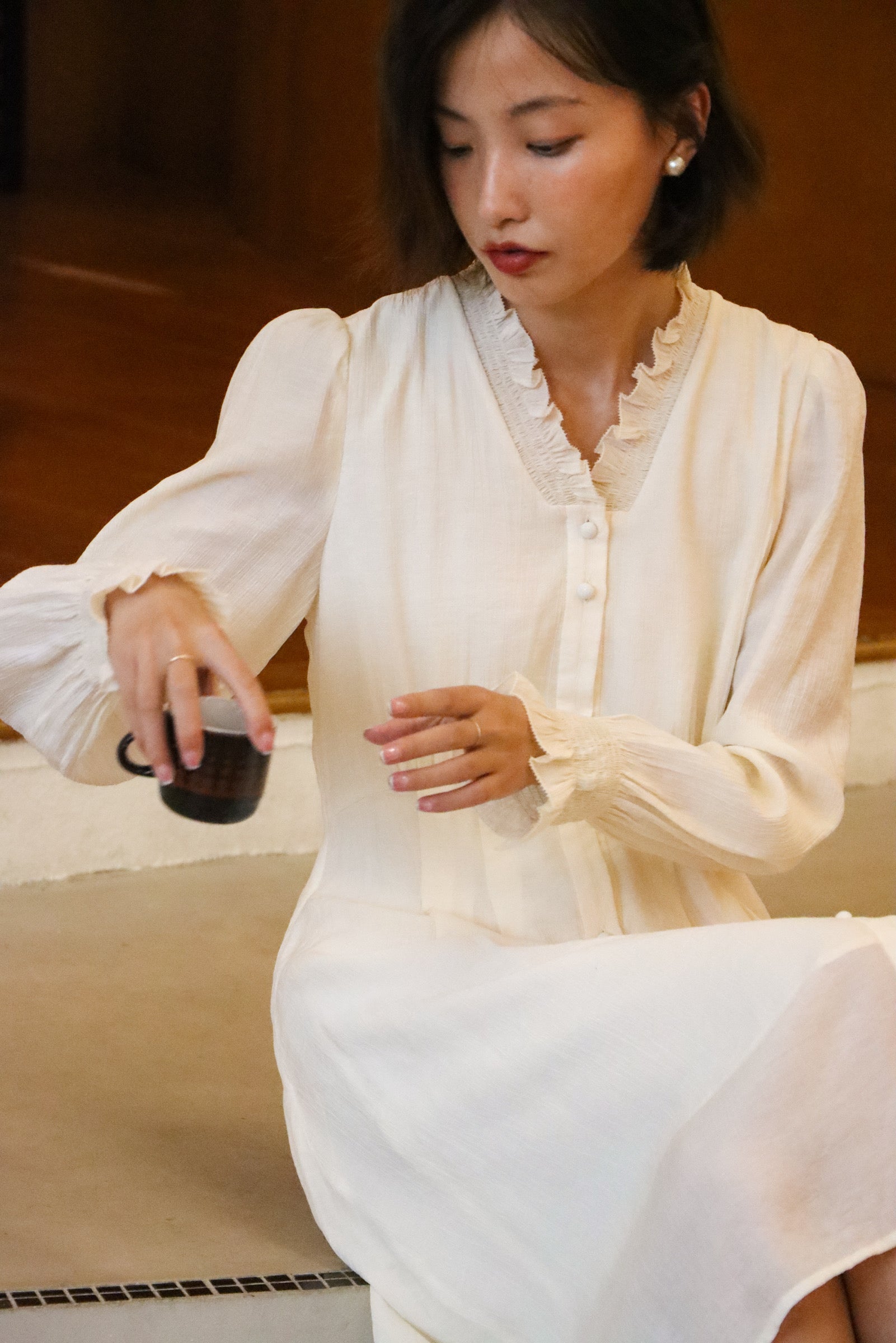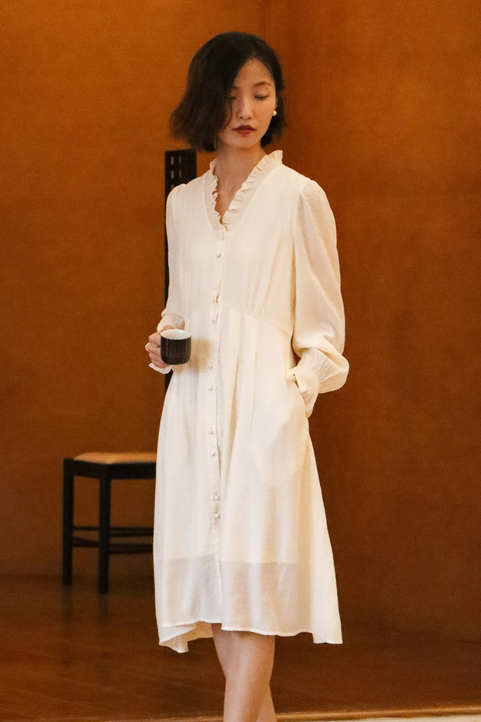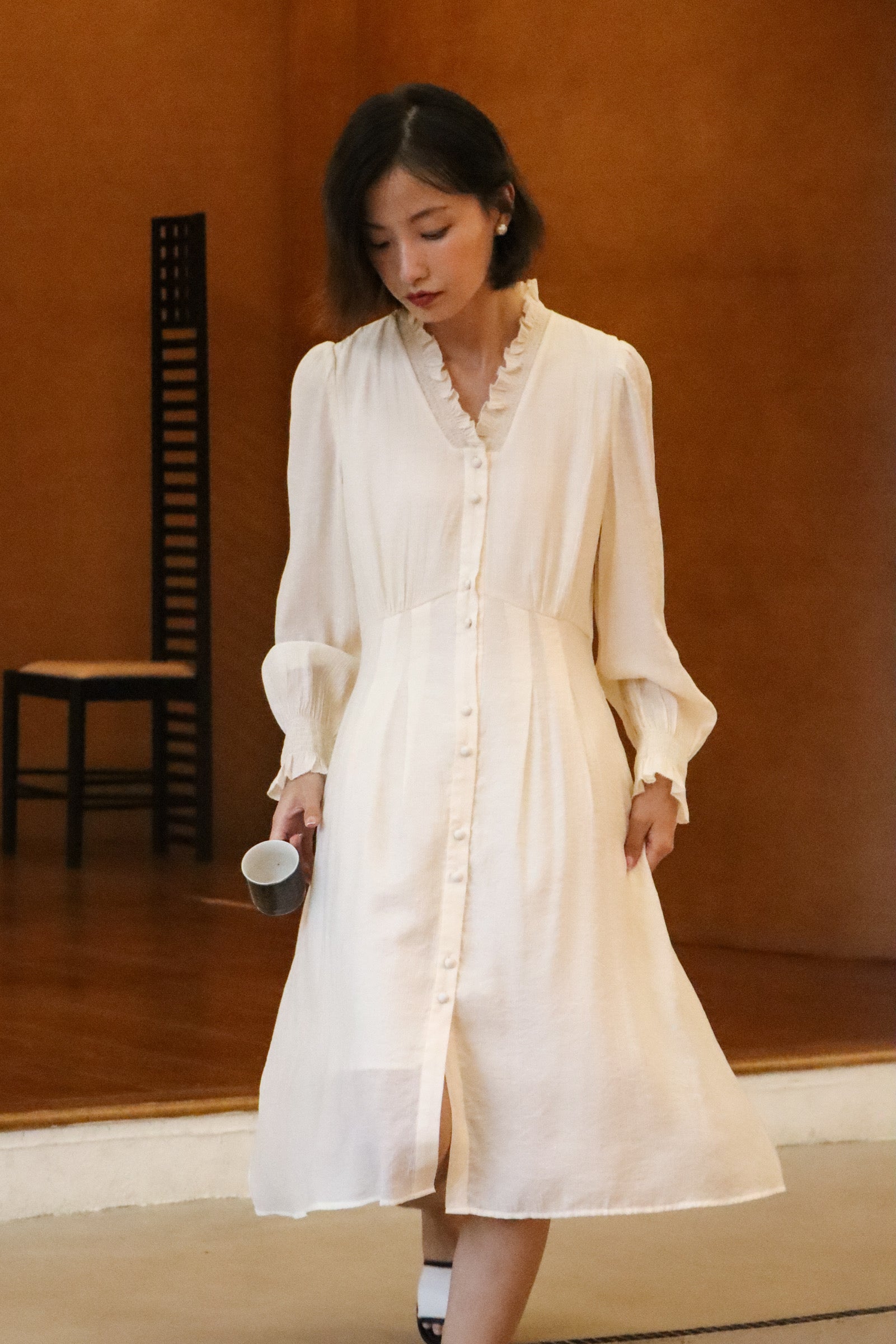 Create an airy and alluring silhouette with our beautiful dress, featuring a flattering ruffled V-neck and charming puff sleeves for effortless feminine style.
