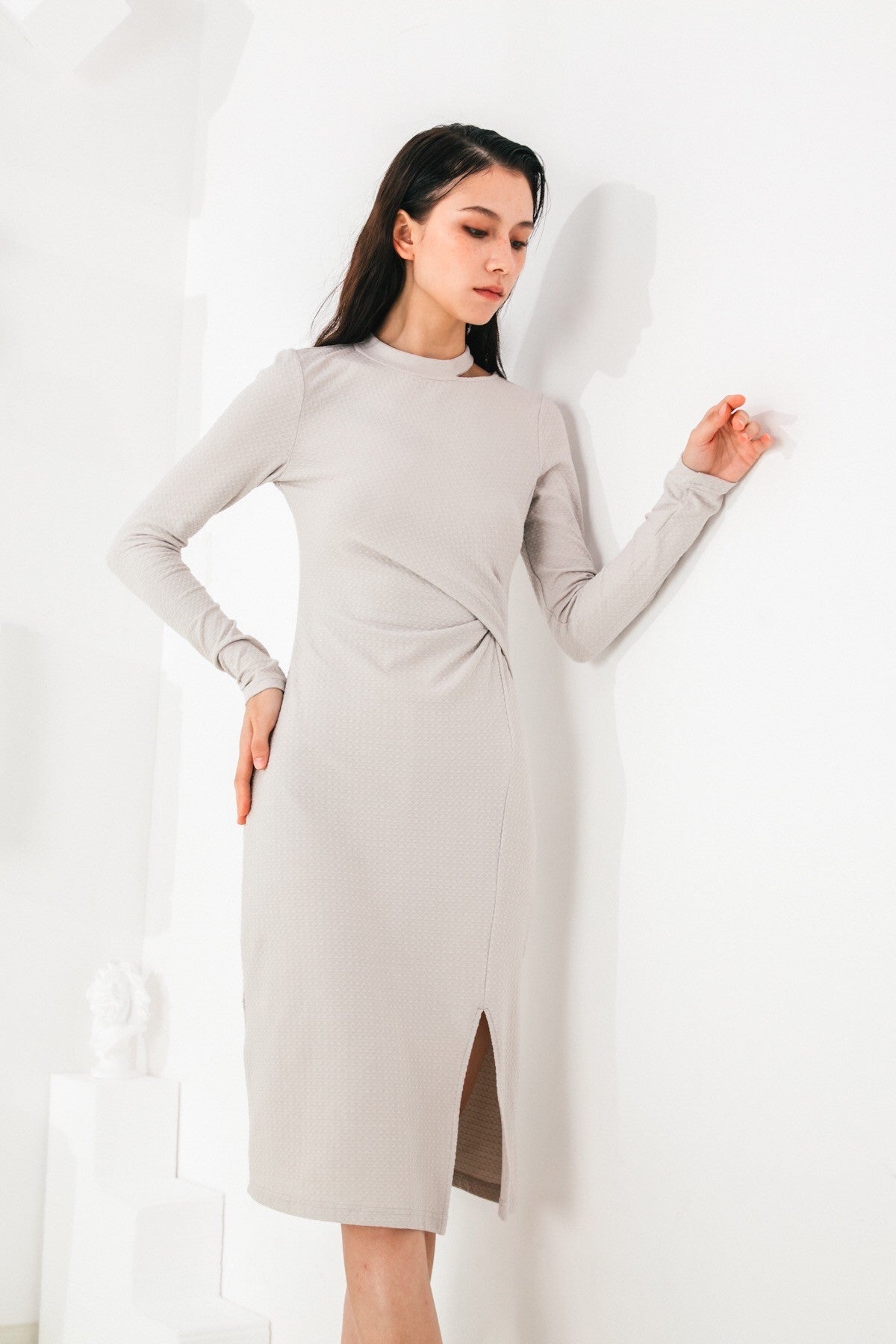 A modern and chic addition to your minimalist wardrobe, our beautiful Dress features a fitted design with a sophisticated asymmetrical neckline, criss-cross front, and an alluring side slit. Wear yours under a sleek blazer for easy, elevated styling.