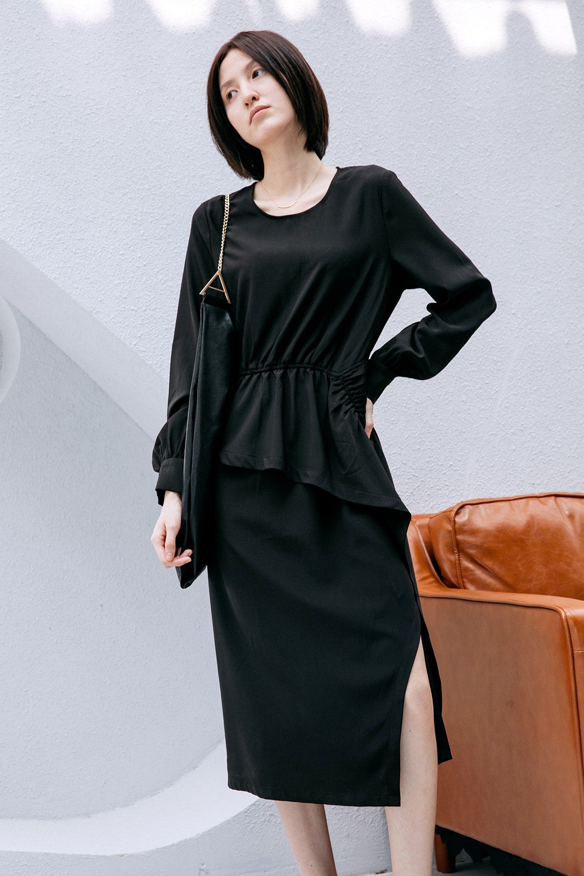 Paint a picture of sophisticated grace with our Dress, featuring a feminine peplum design and sensual side slit. Elevate the look with your favorite pearl jewels.