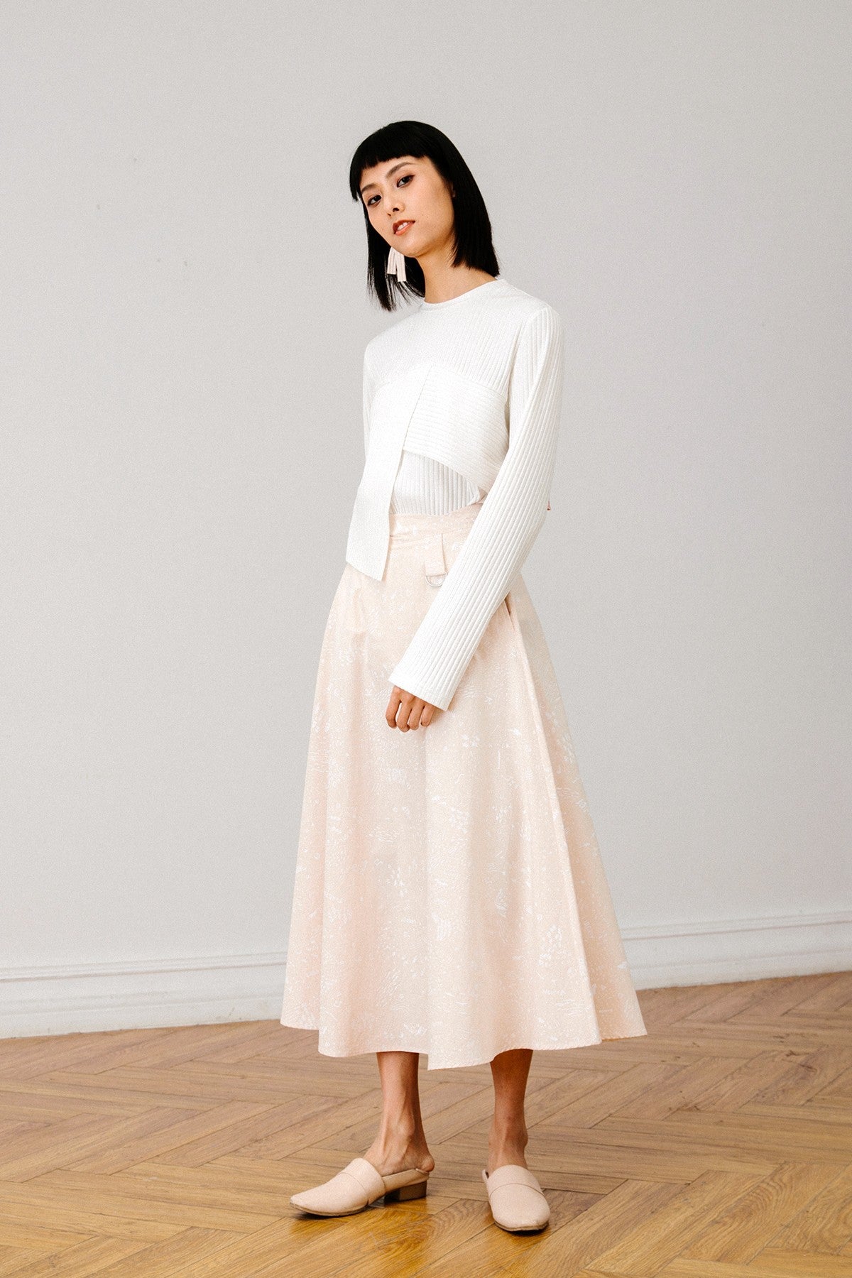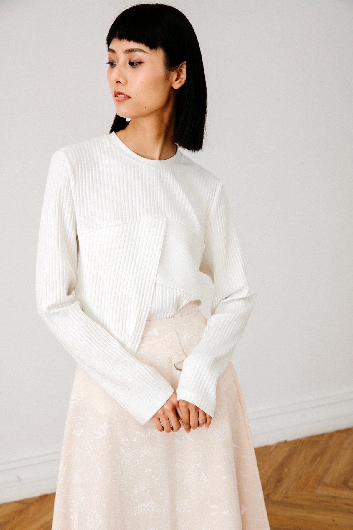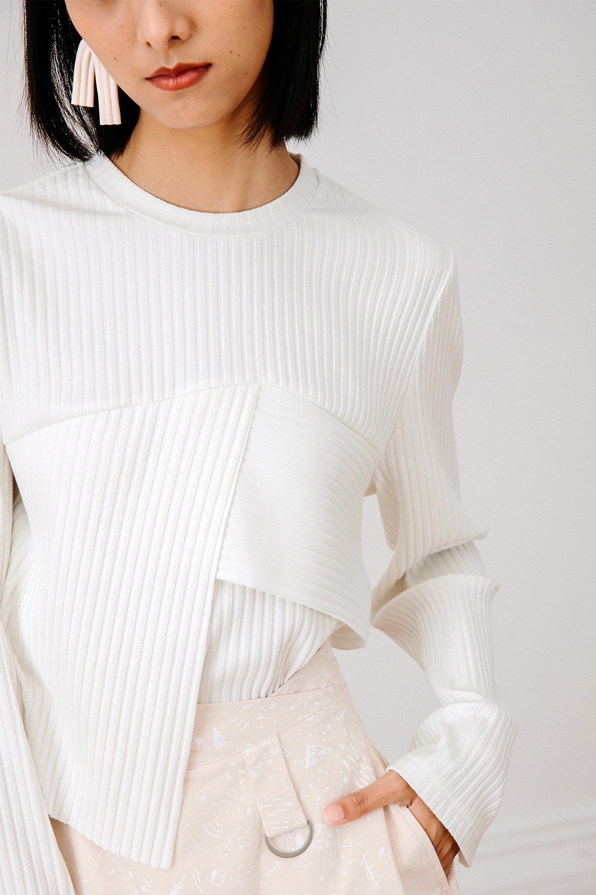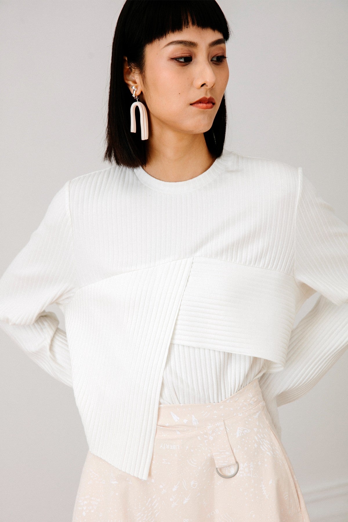 Channel your inner It girl with our Top, featuring sleek lines and front asymmetric panels. Complete the look with soft-colored separates for understated glamour.