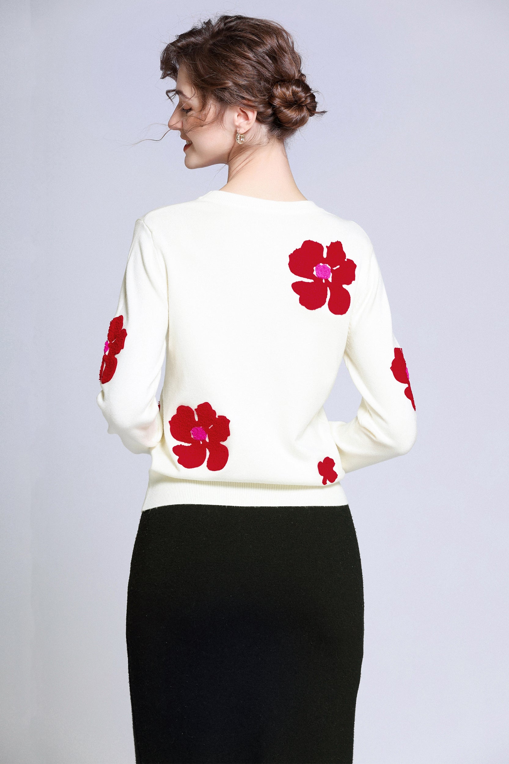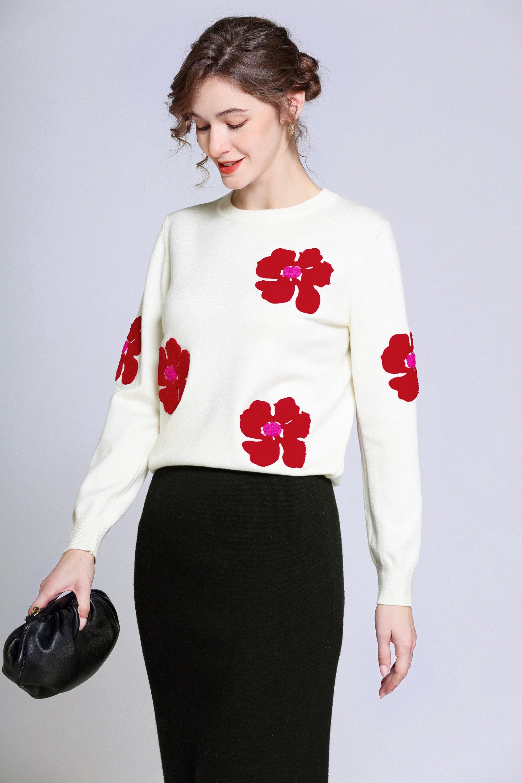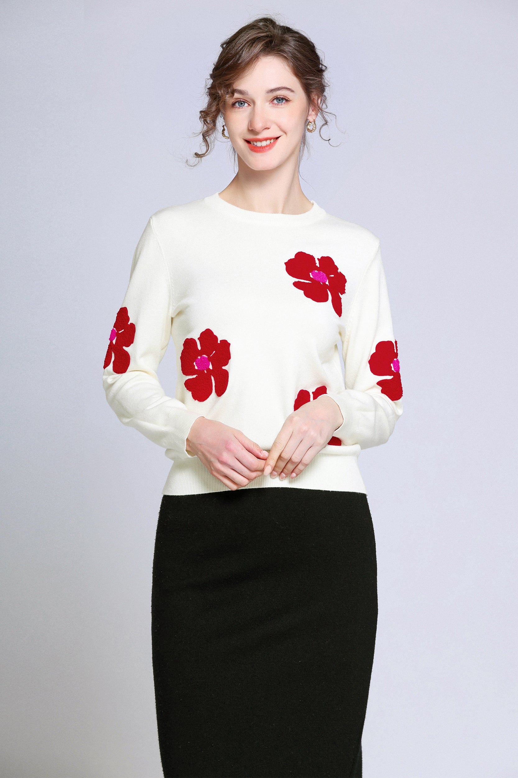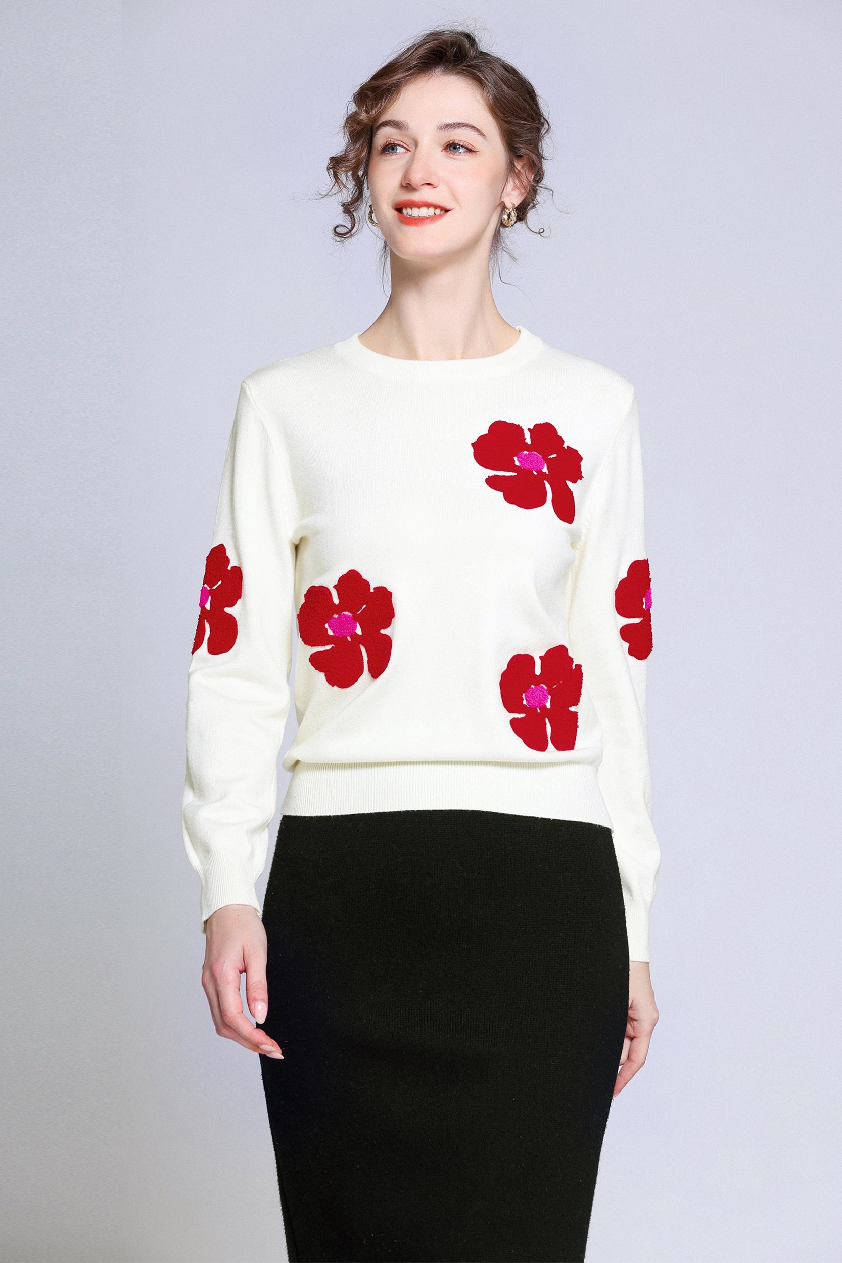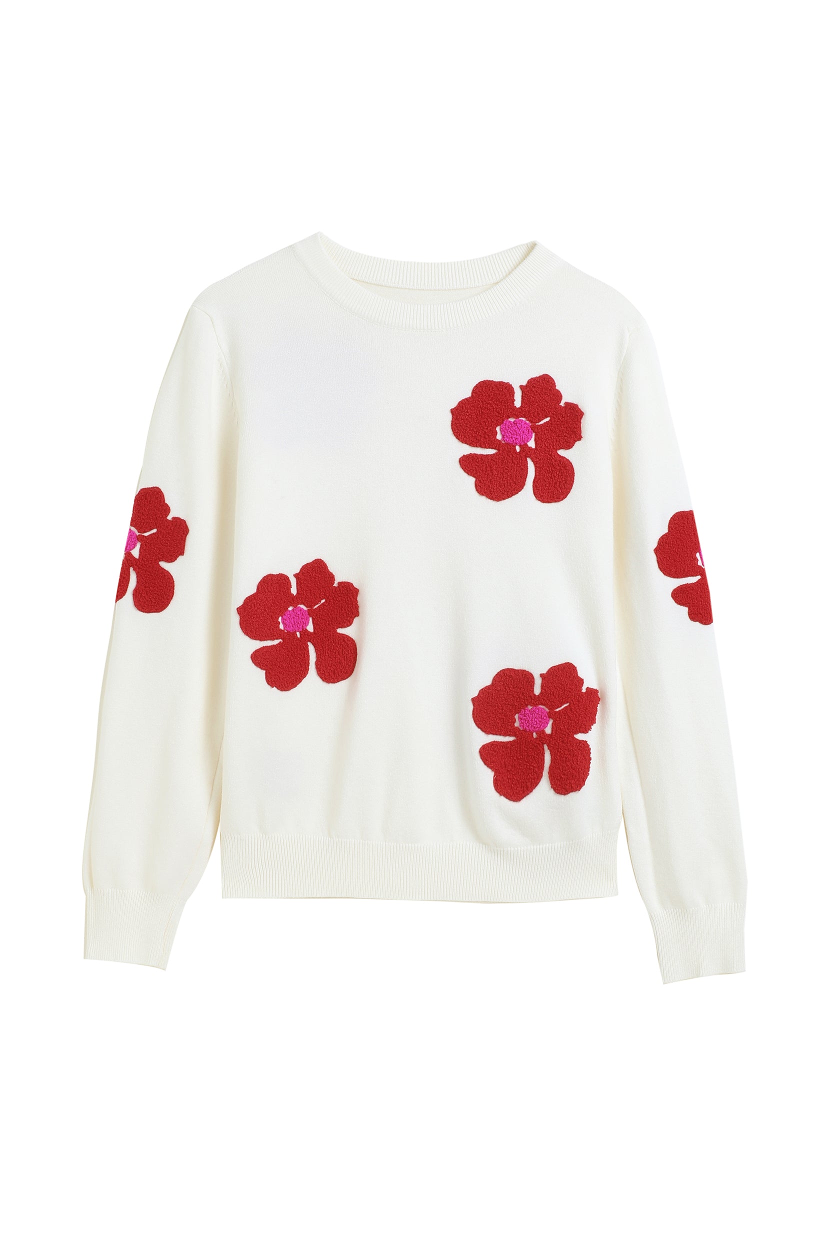 Add a pop of color to your wardrobe with this sweater. The bold red flower accents create a striking contrast against the soft white background, giving a playful yet sophisticated vibe. Perfect for casual days or dressing up, this sweater ensures both comfort and style.