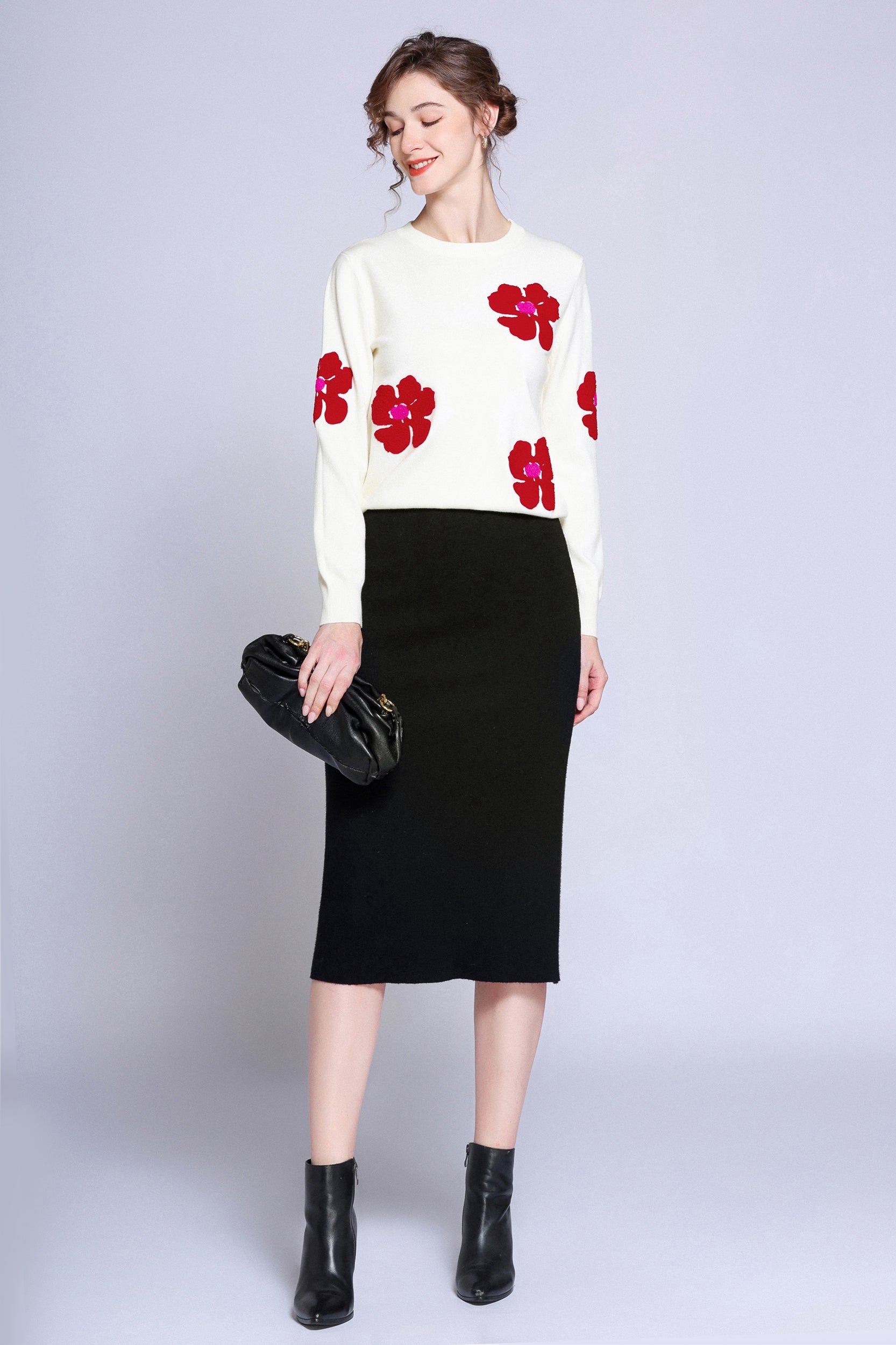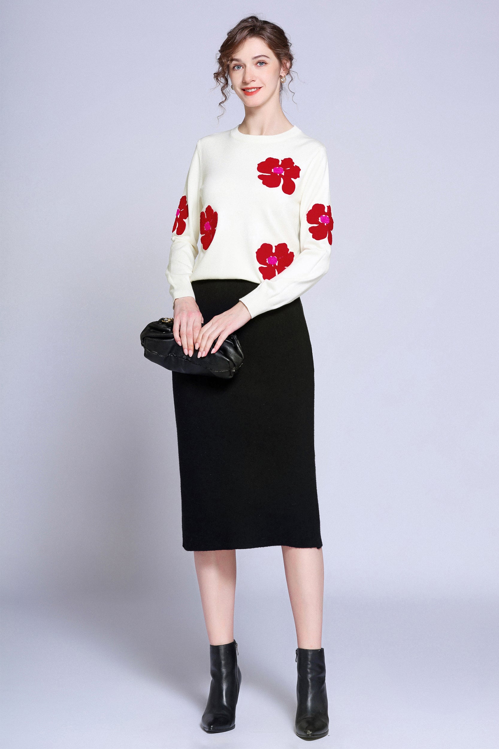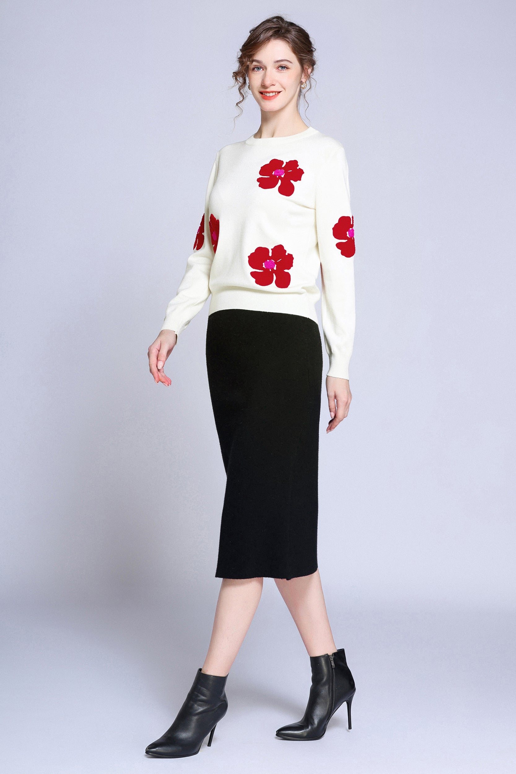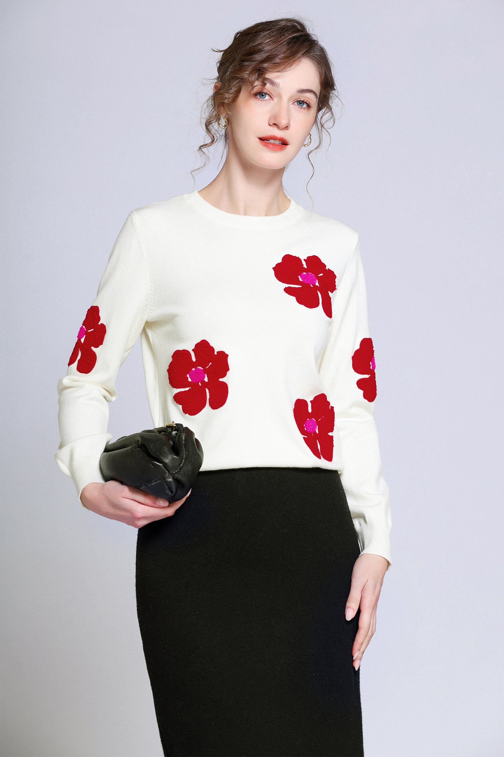 Add a pop of color to your wardrobe with this sweater. The bold red flower accents create a striking contrast against the soft white background, giving a playful yet sophisticated vibe. Perfect for casual days or dressing up, this sweater ensures both comfort and style.
