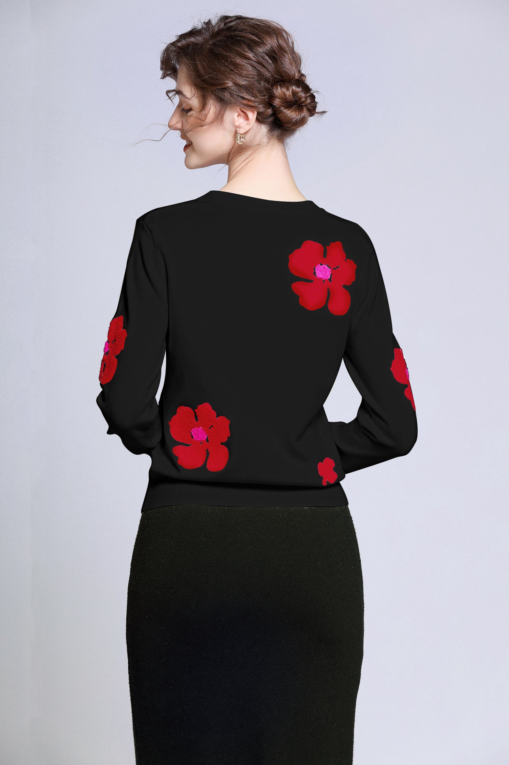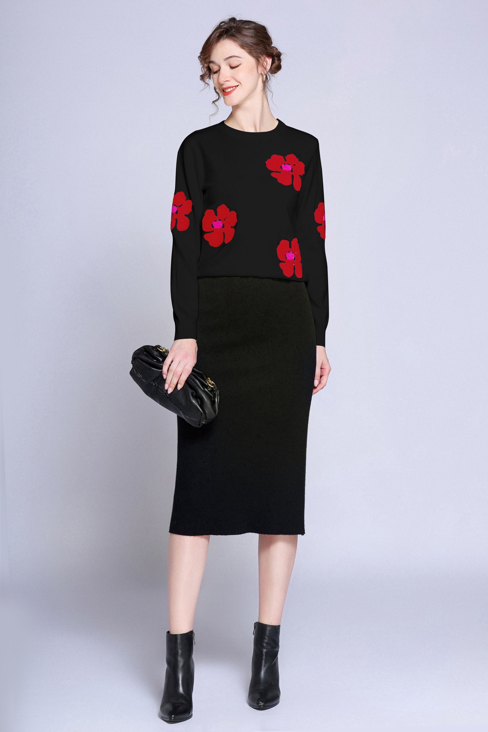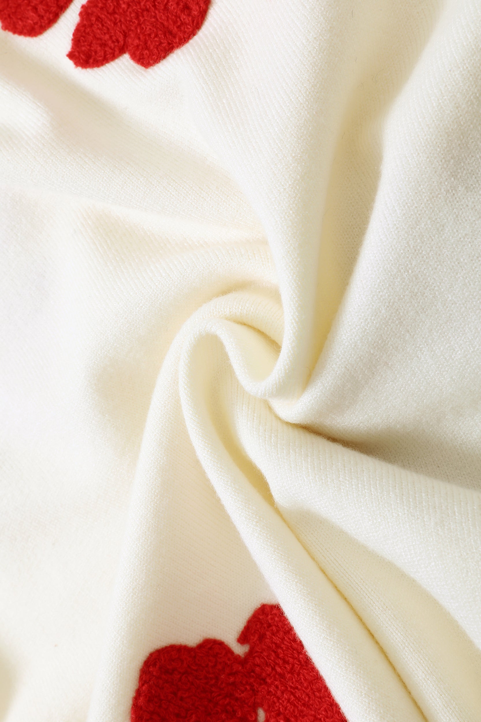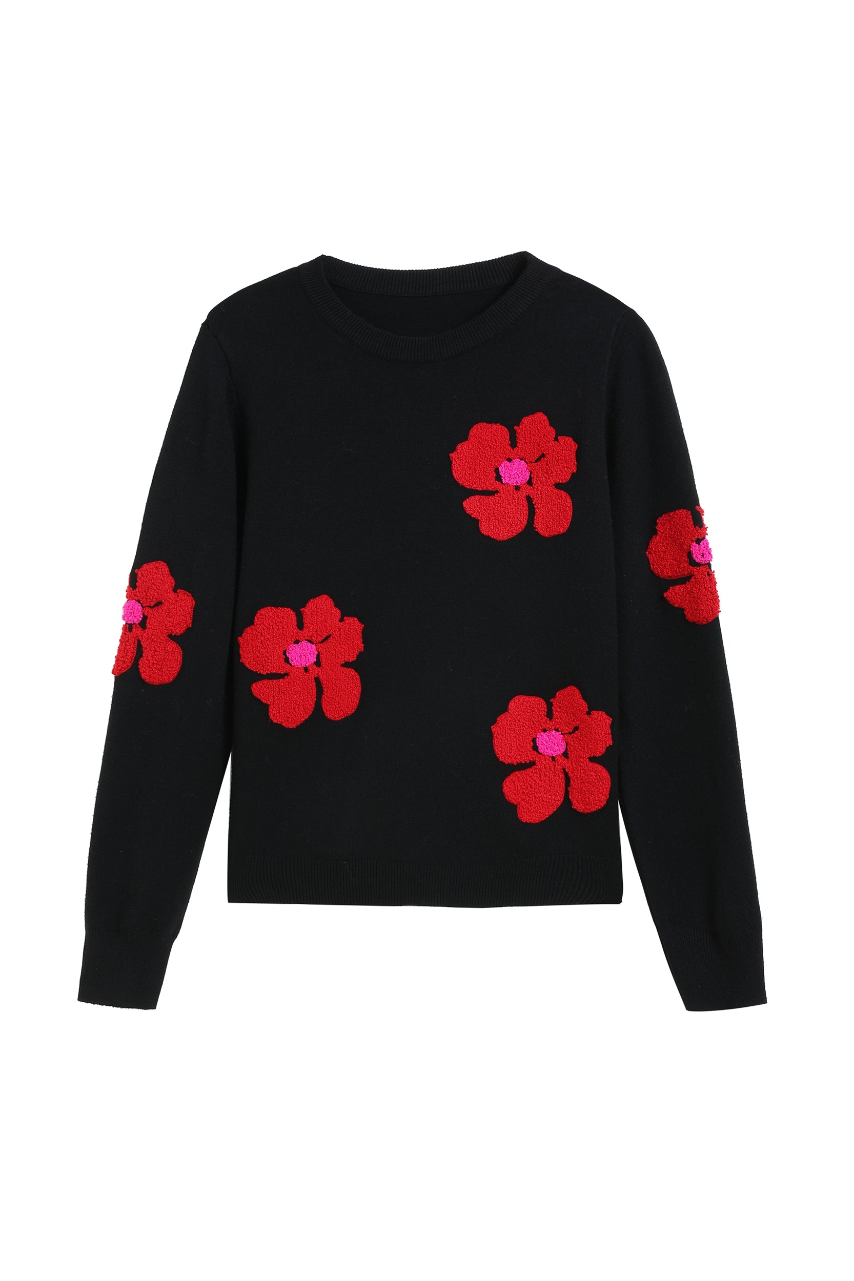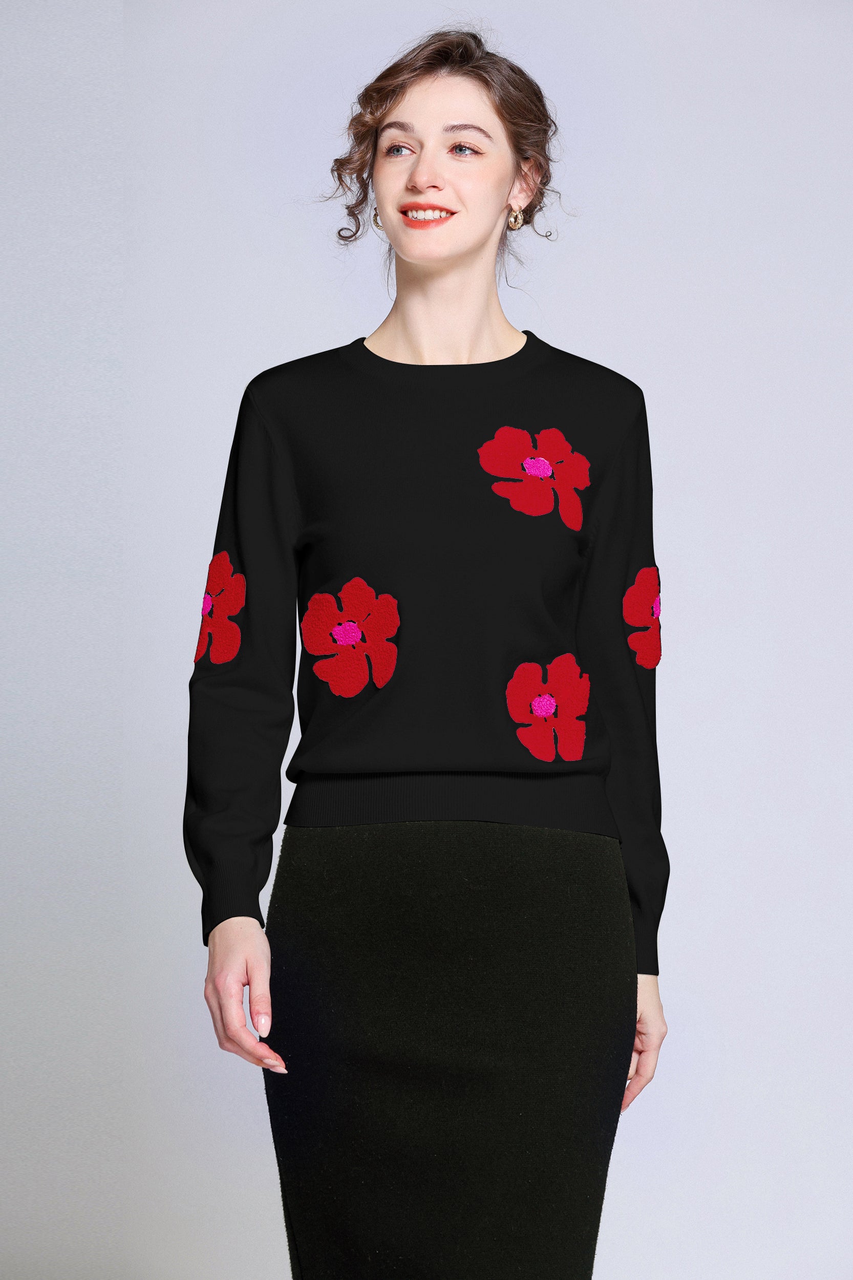 Add a pop of color to your wardrobe with this sweater. The bold red flower accents create a striking contrast against the soft white background, giving a playful yet sophisticated vibe. Perfect for casual days or dressing up, this sweater ensures both comfort and style.