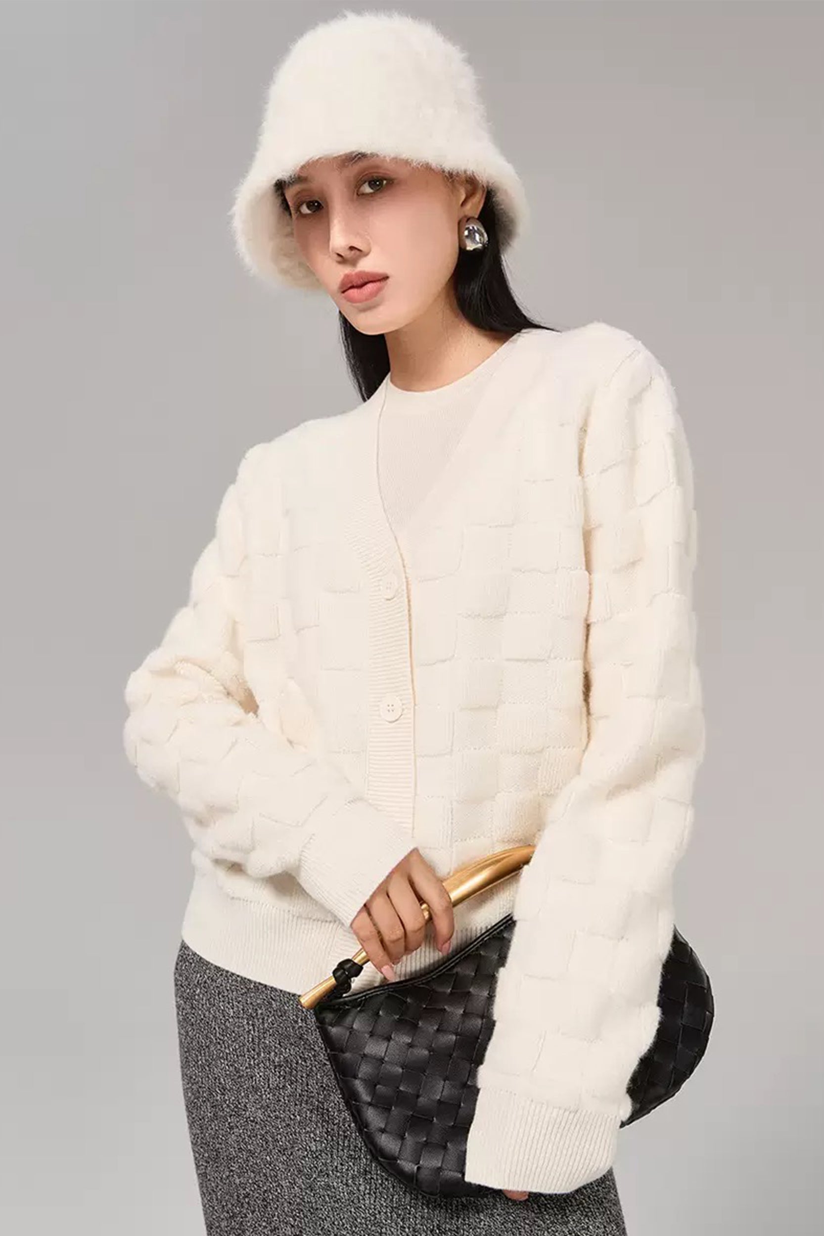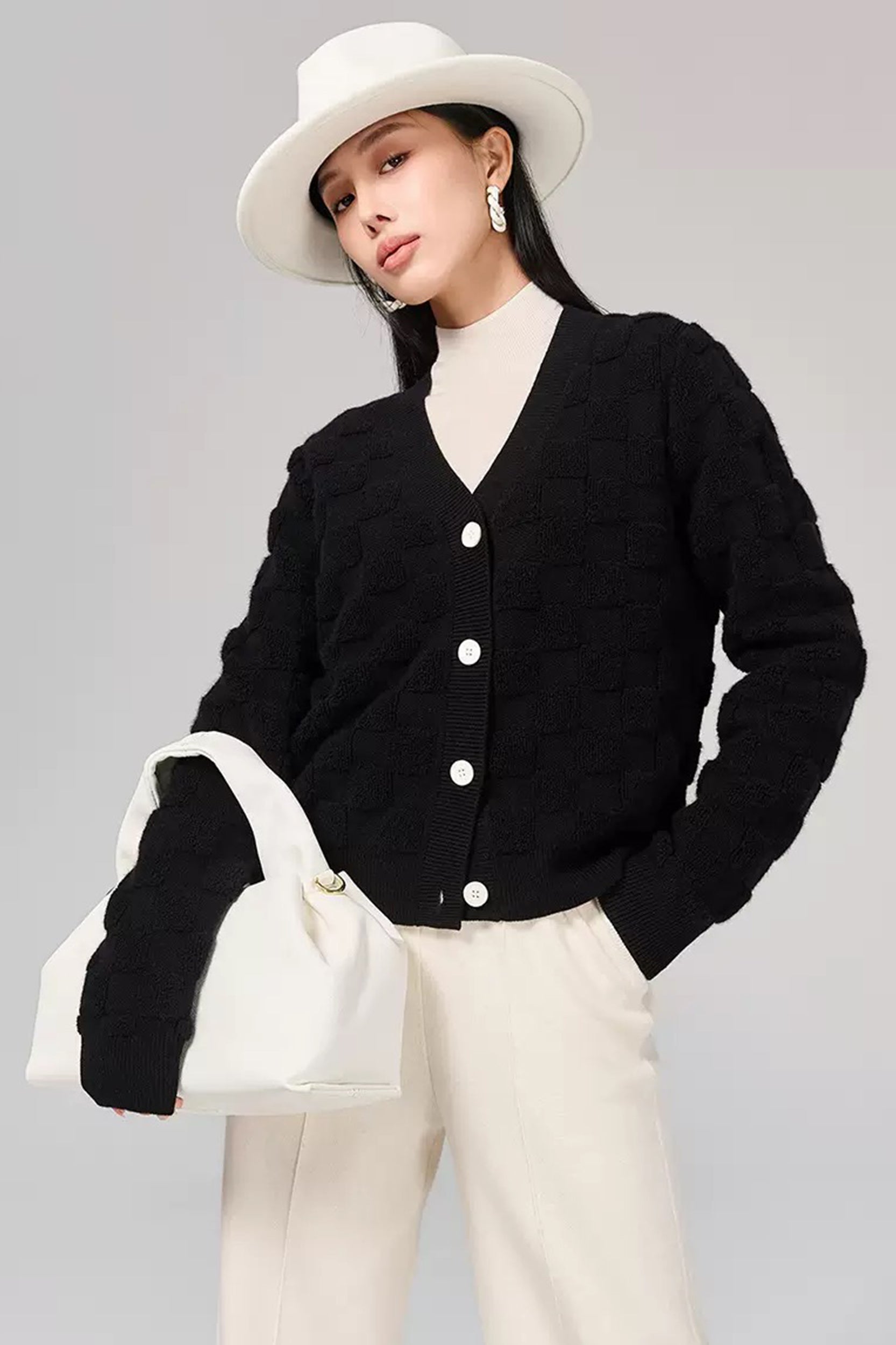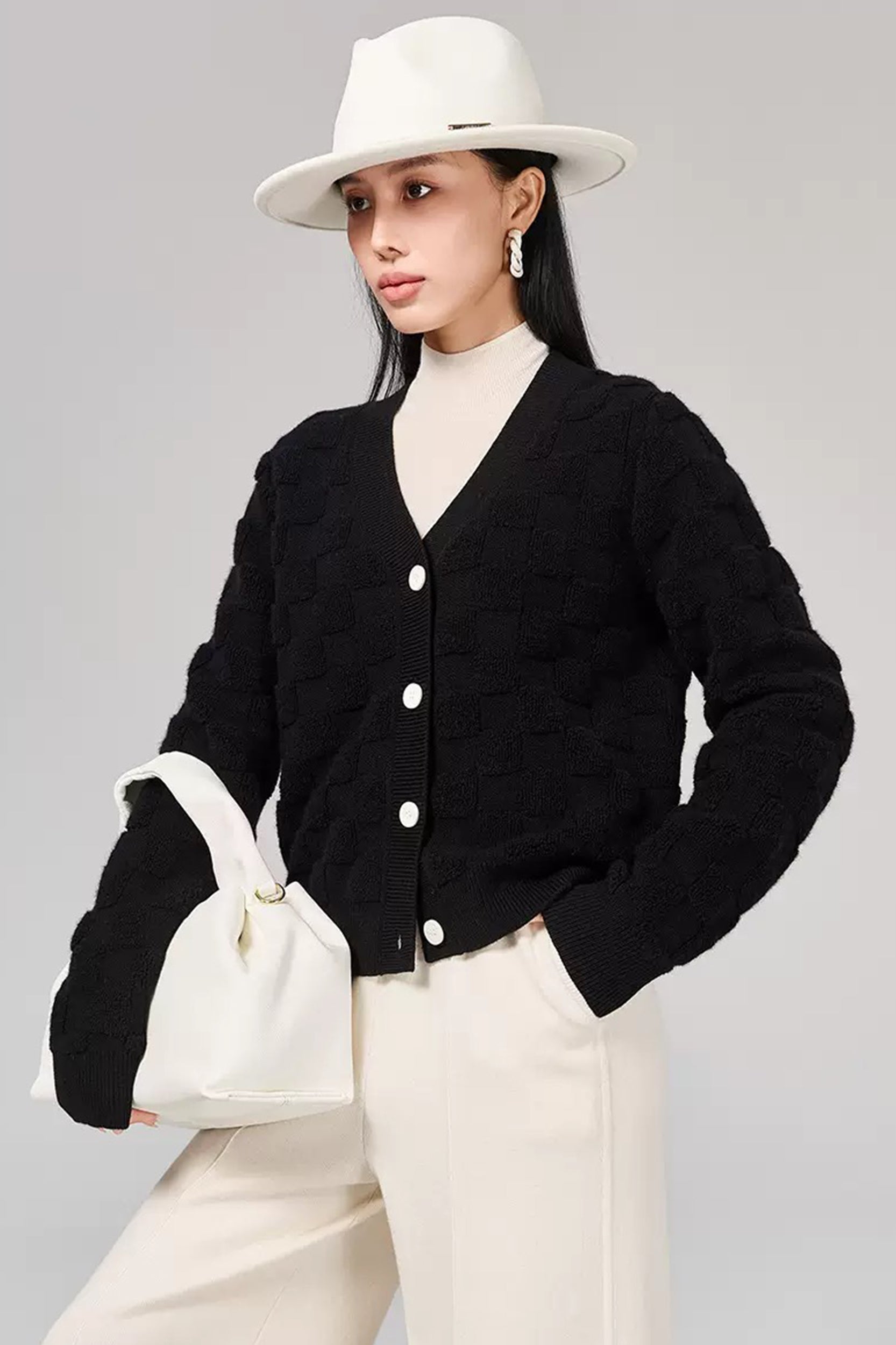 Introducing the cardigan, a fusion of chic and comfort. This cardigan showcases a flattering V-neck and a versatile front button closure for a touch of sophistication. The raised checkered pattern adds depth to the design, while the ribbed cuffs and hem provide a classic finish. Crafted from extra-fine non-itch Wool, it’s luxuriously soft, cozy, and breathable.