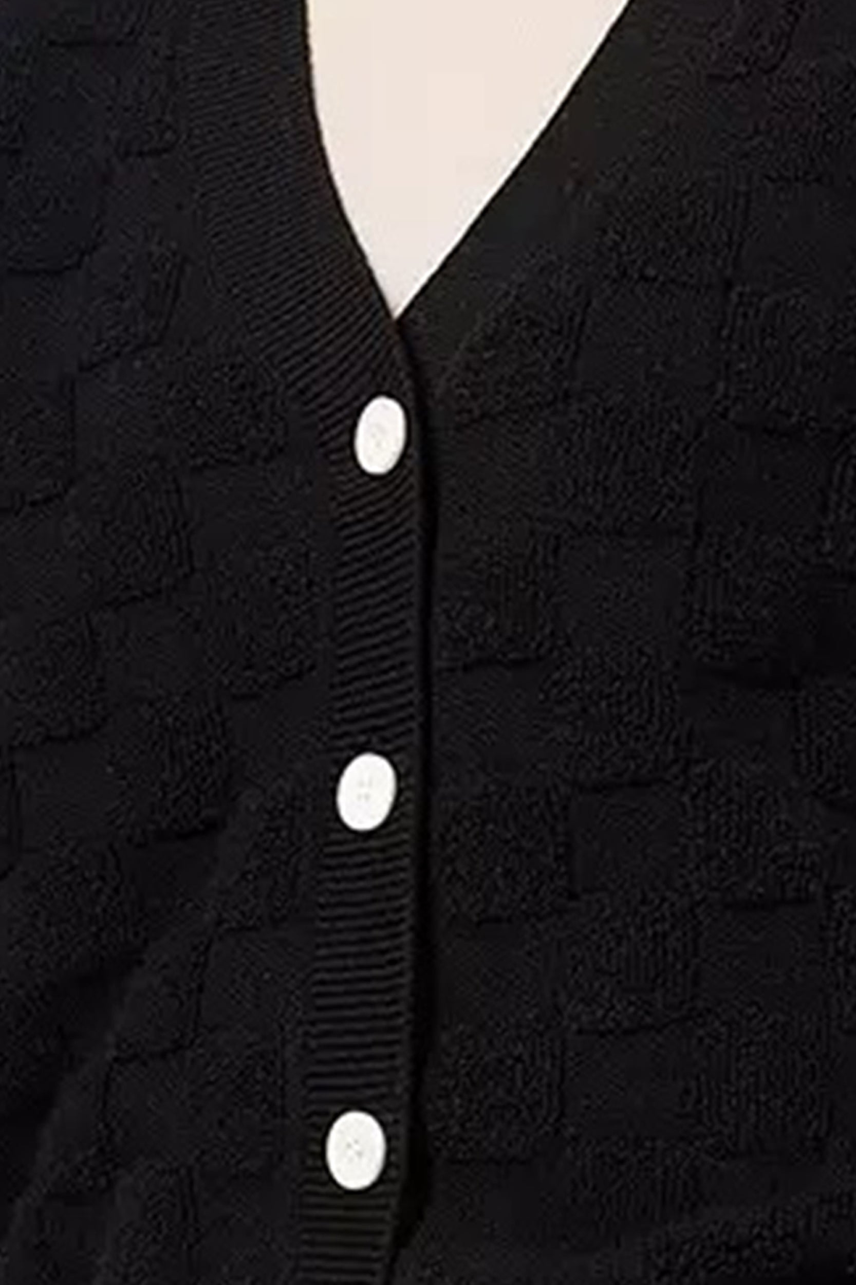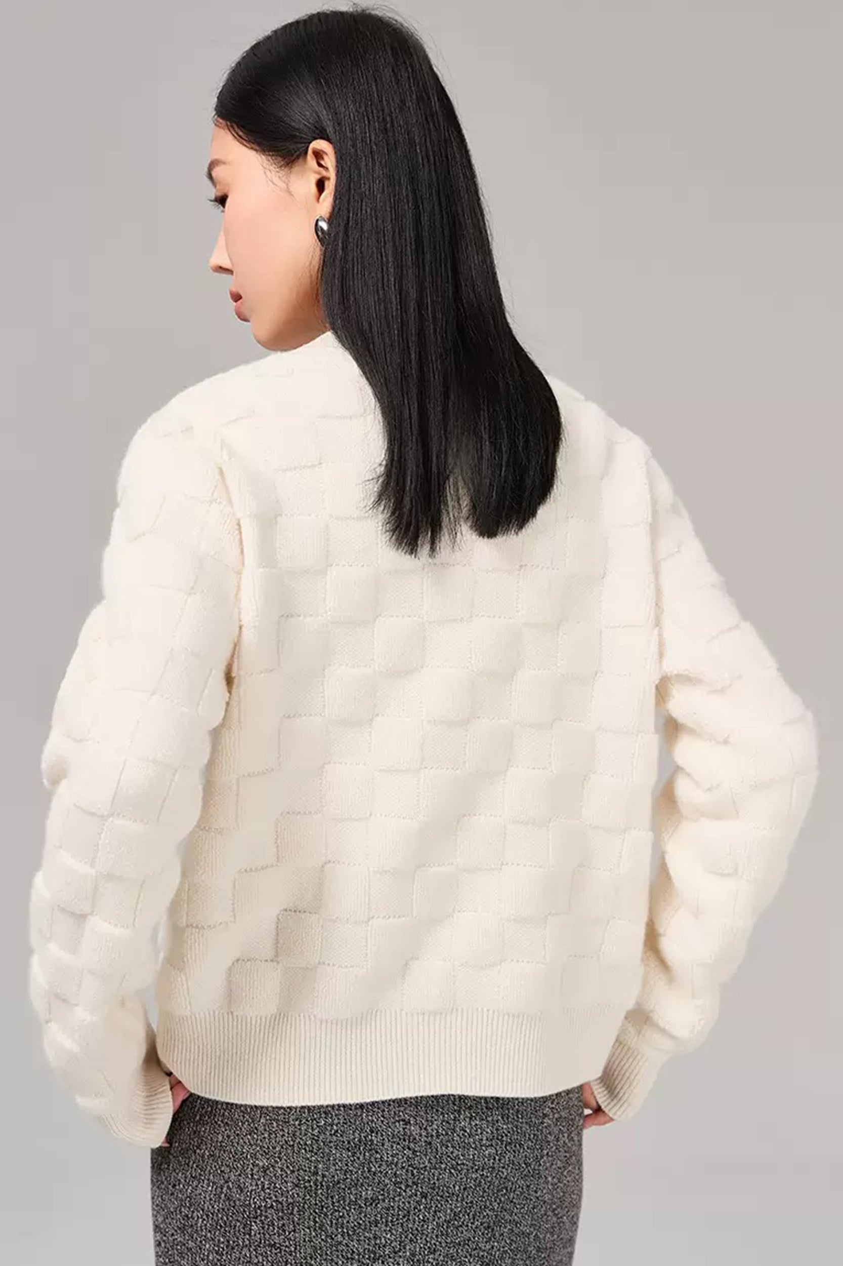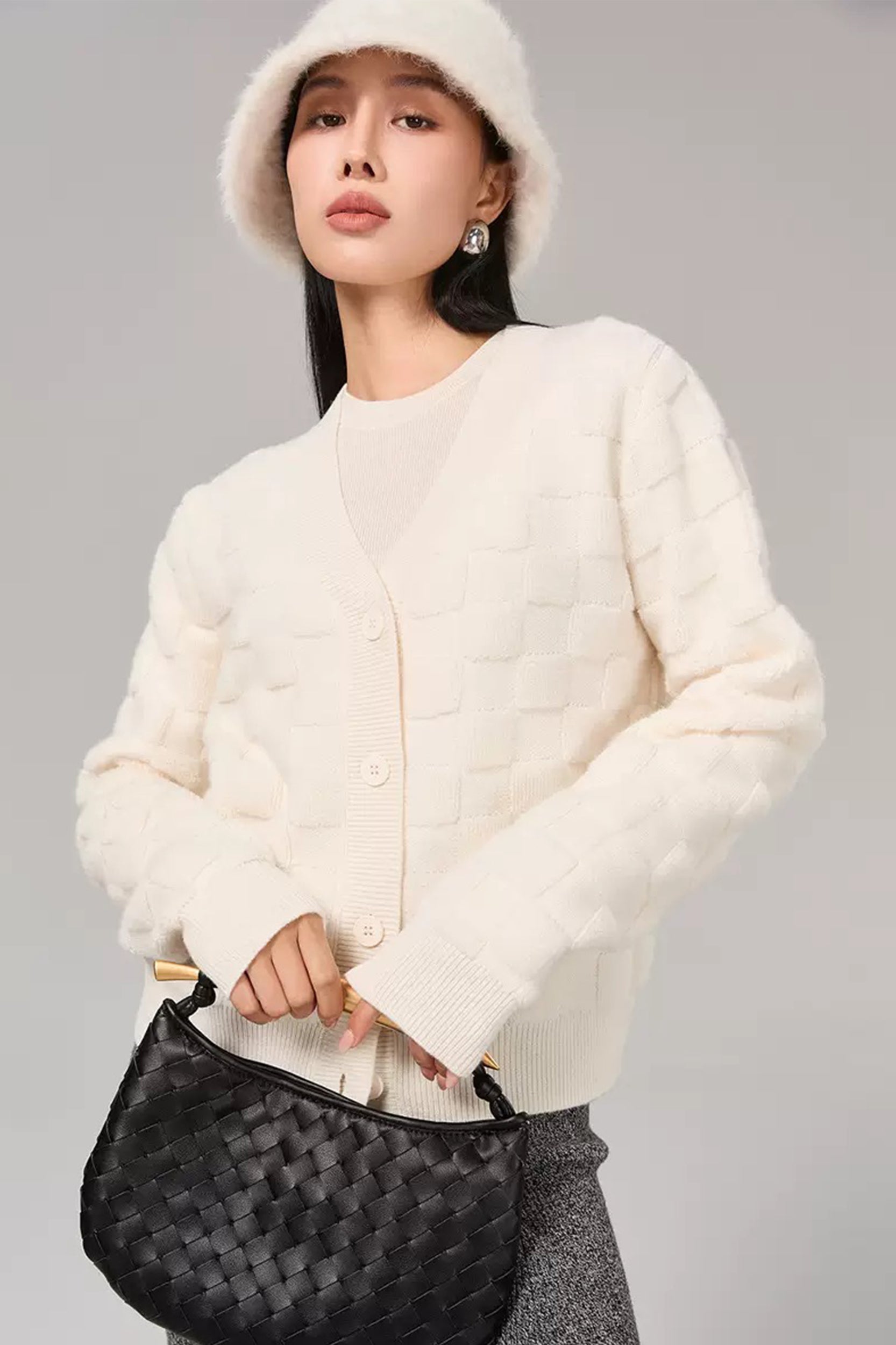 Introducing the cardigan, a fusion of chic and comfort. This cardigan showcases a flattering V-neck and a versatile front button closure for a touch of sophistication. The raised checkered pattern adds depth to the design, while the ribbed cuffs and hem provide a classic finish. Crafted from extra-fine non-itch Wool, it’s luxuriously soft, cozy, and breathable.