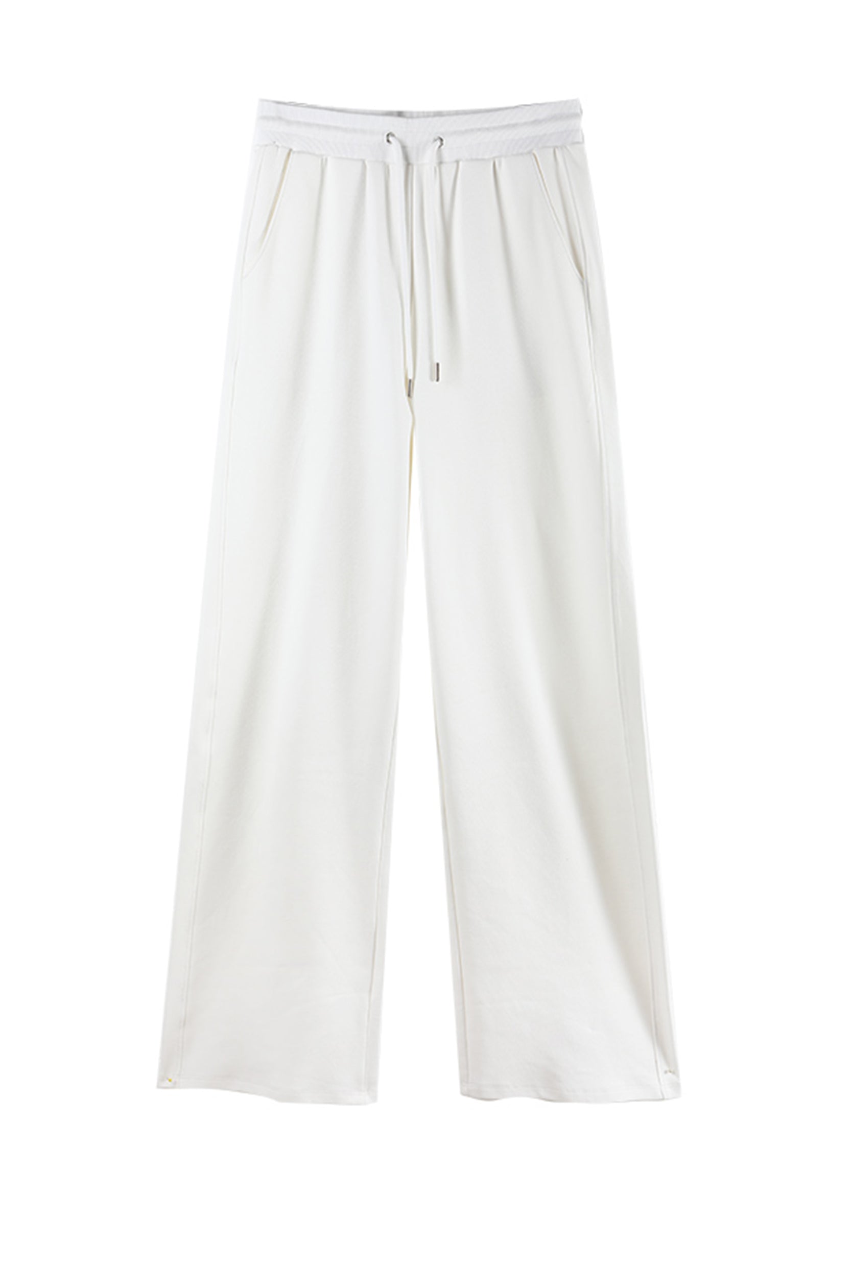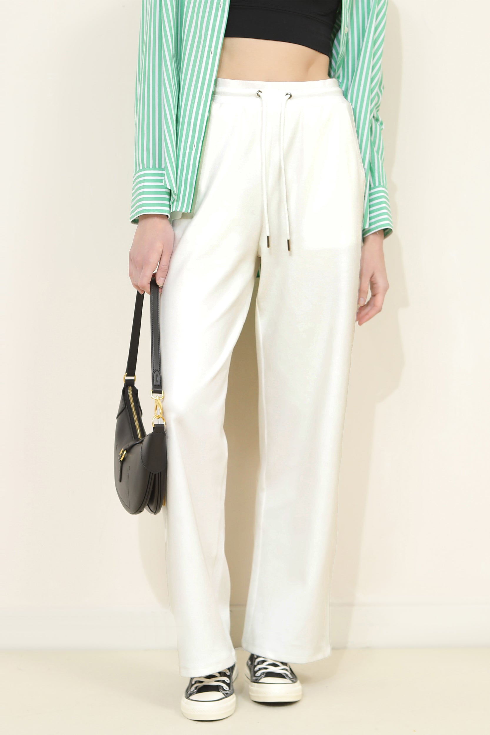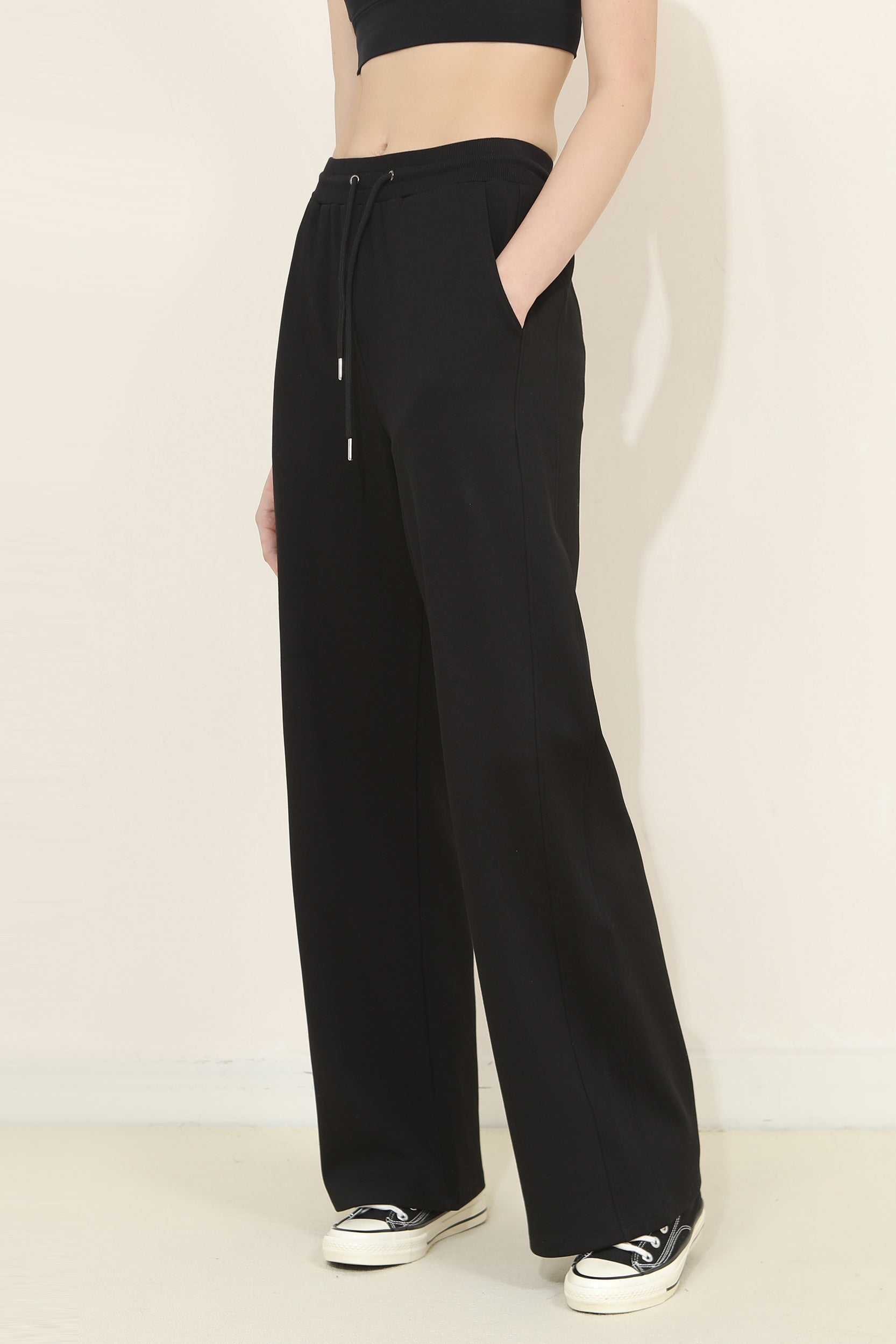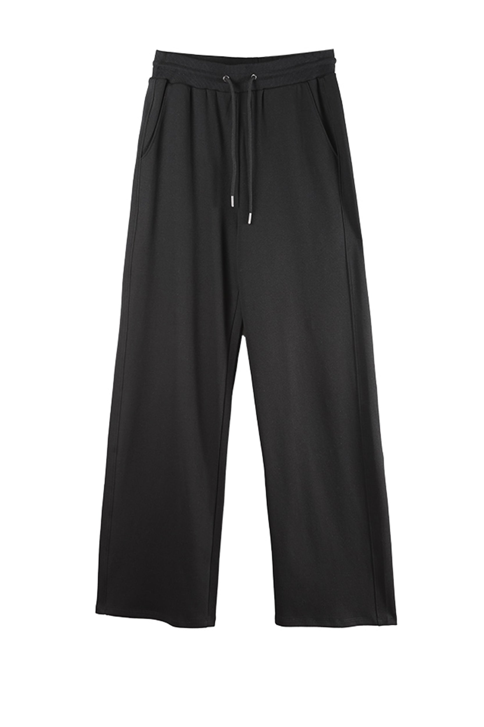 These pants feature a relaxed fit and an elastic waistband with a drawstring for adjustable comfort. The soft fabric and flowing silhouette make them ideal for casual or lounge wear while maintaining a chic and modern look.