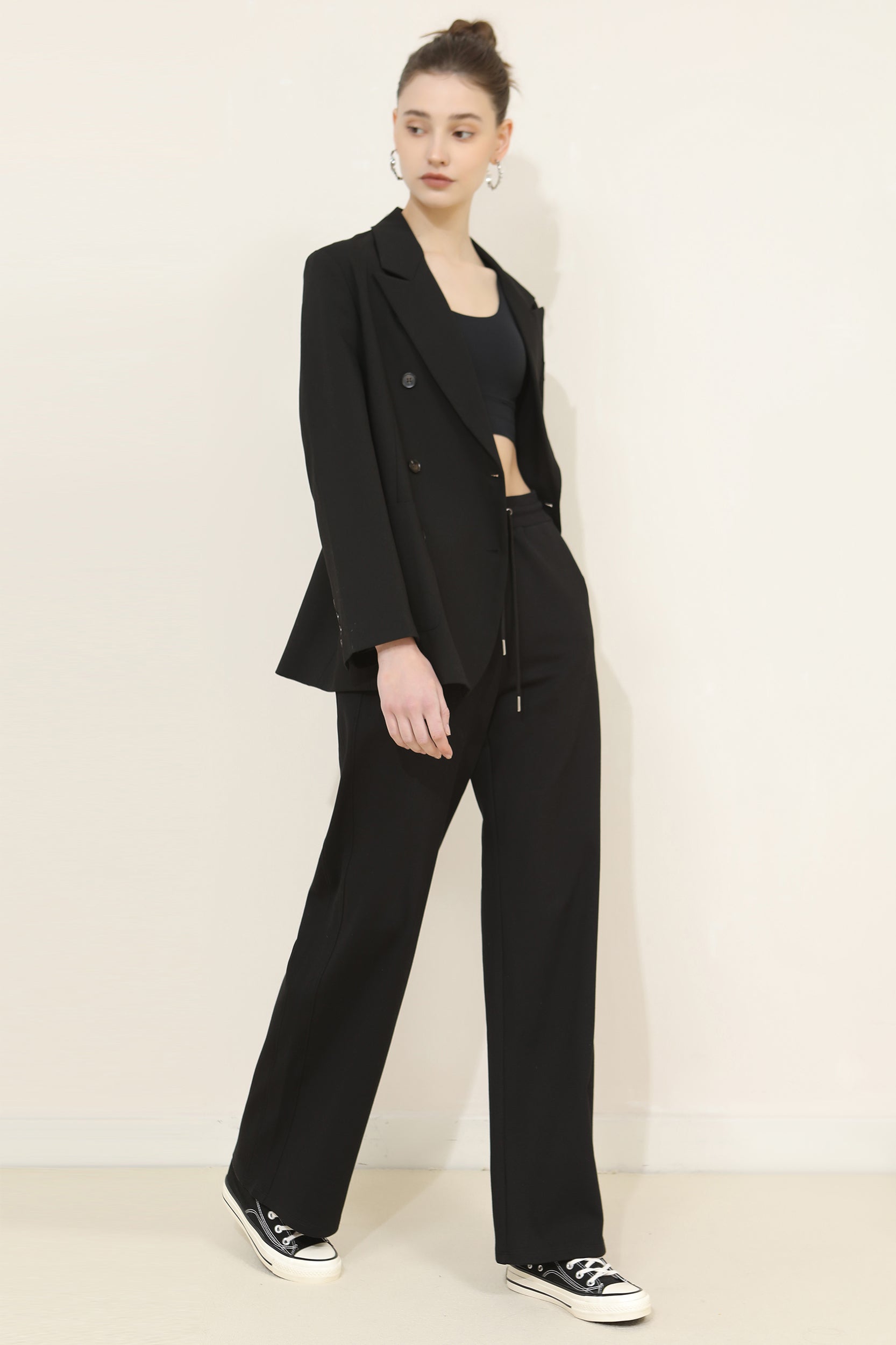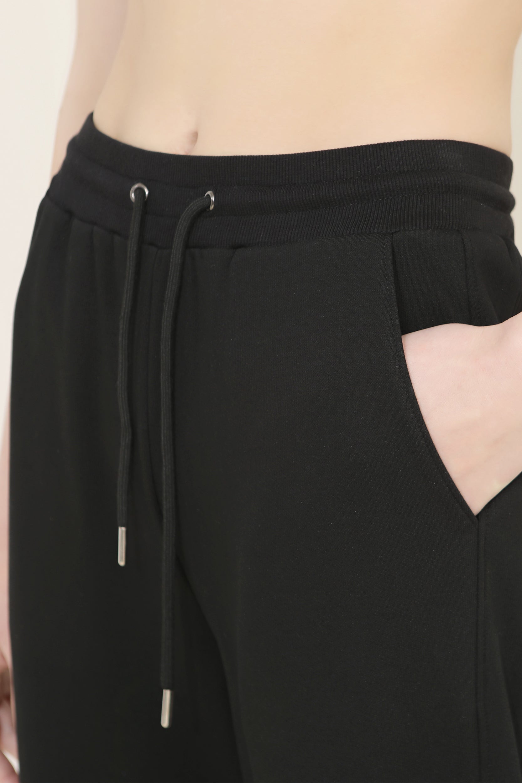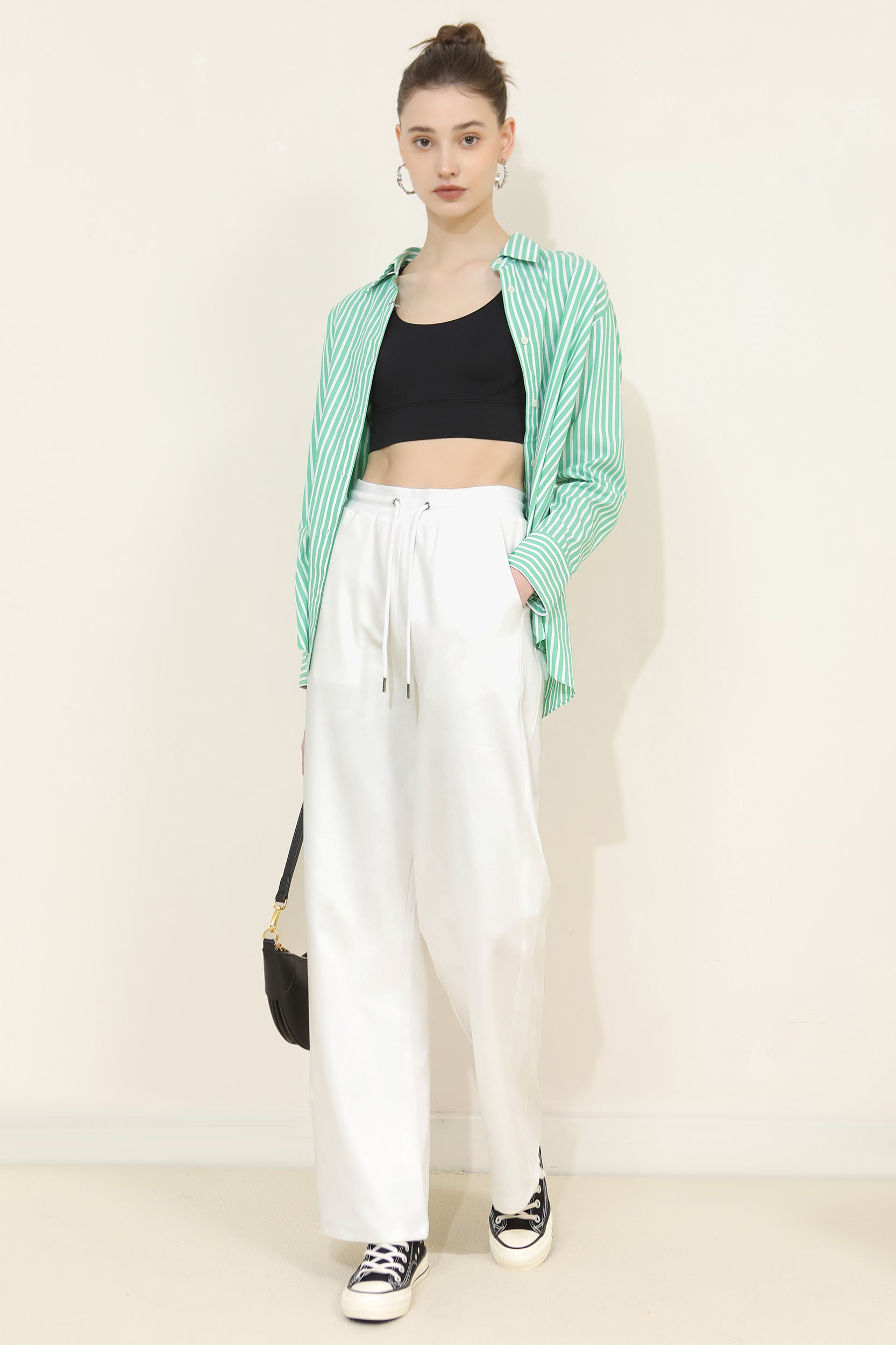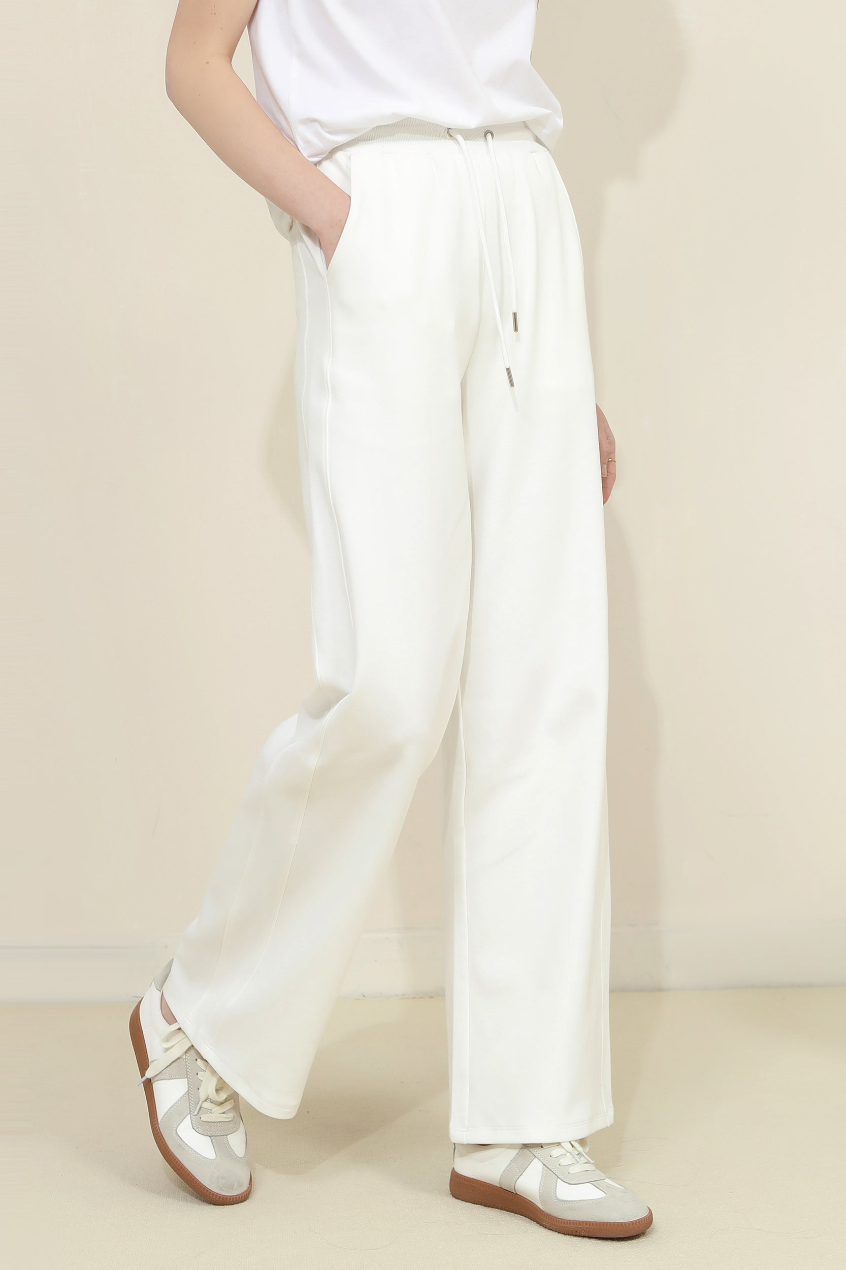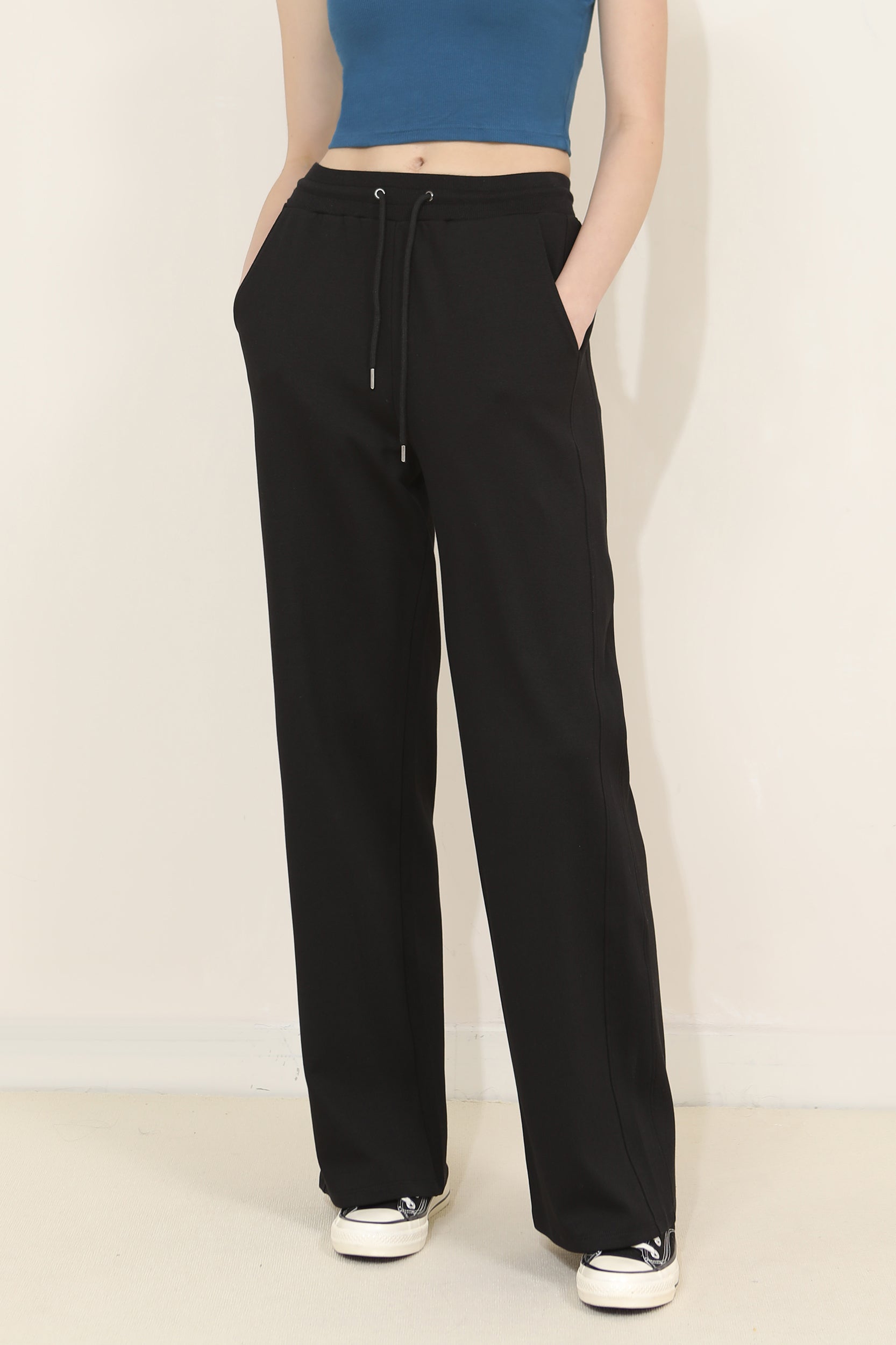 These pants feature a relaxed fit and an elastic waistband with a drawstring for adjustable comfort. The soft fabric and flowing silhouette make them ideal for casual or lounge wear while maintaining a chic and modern look.