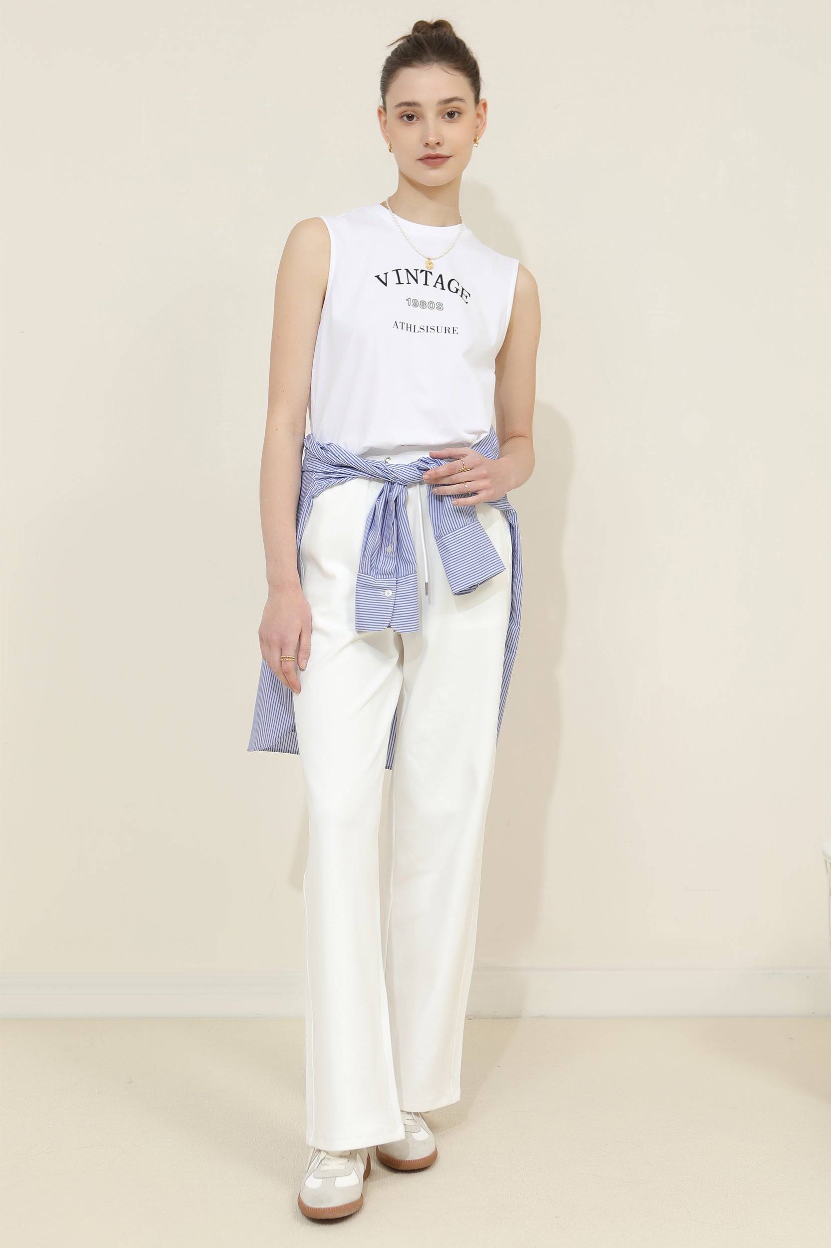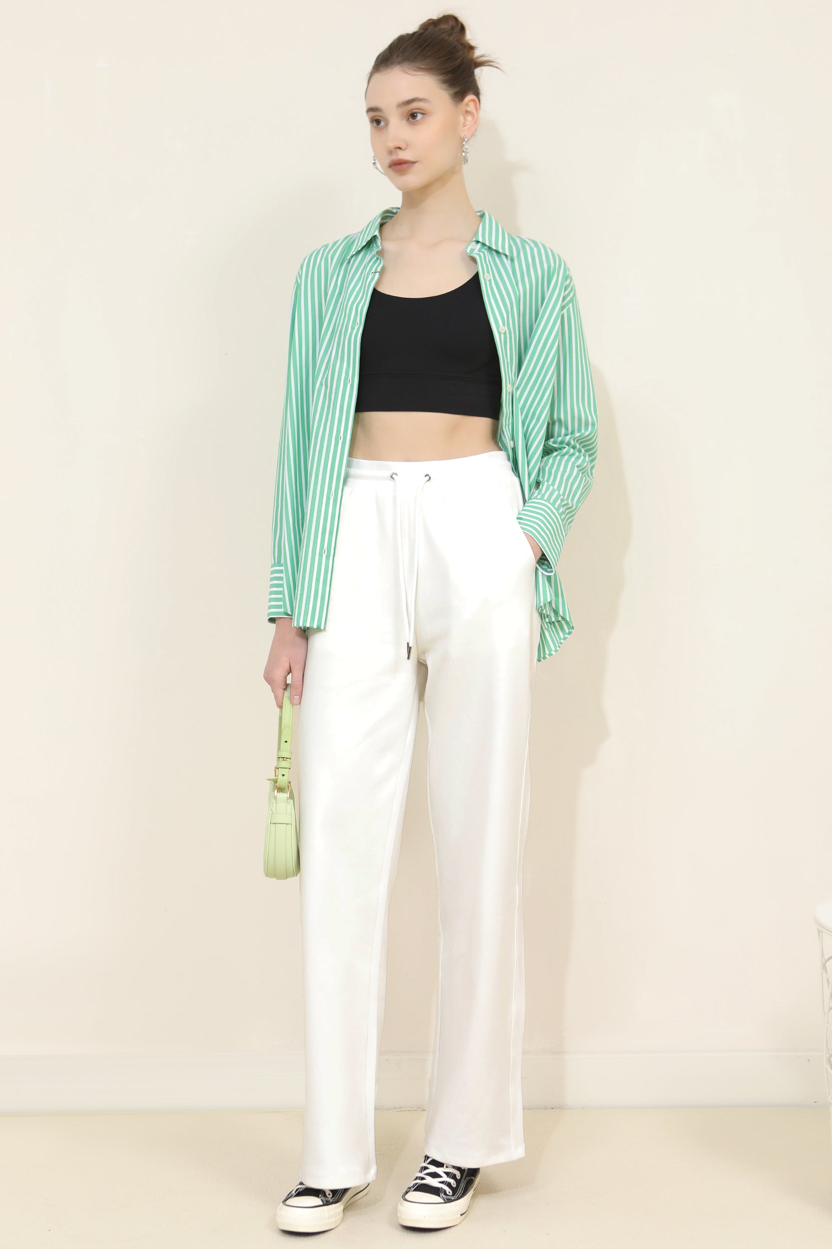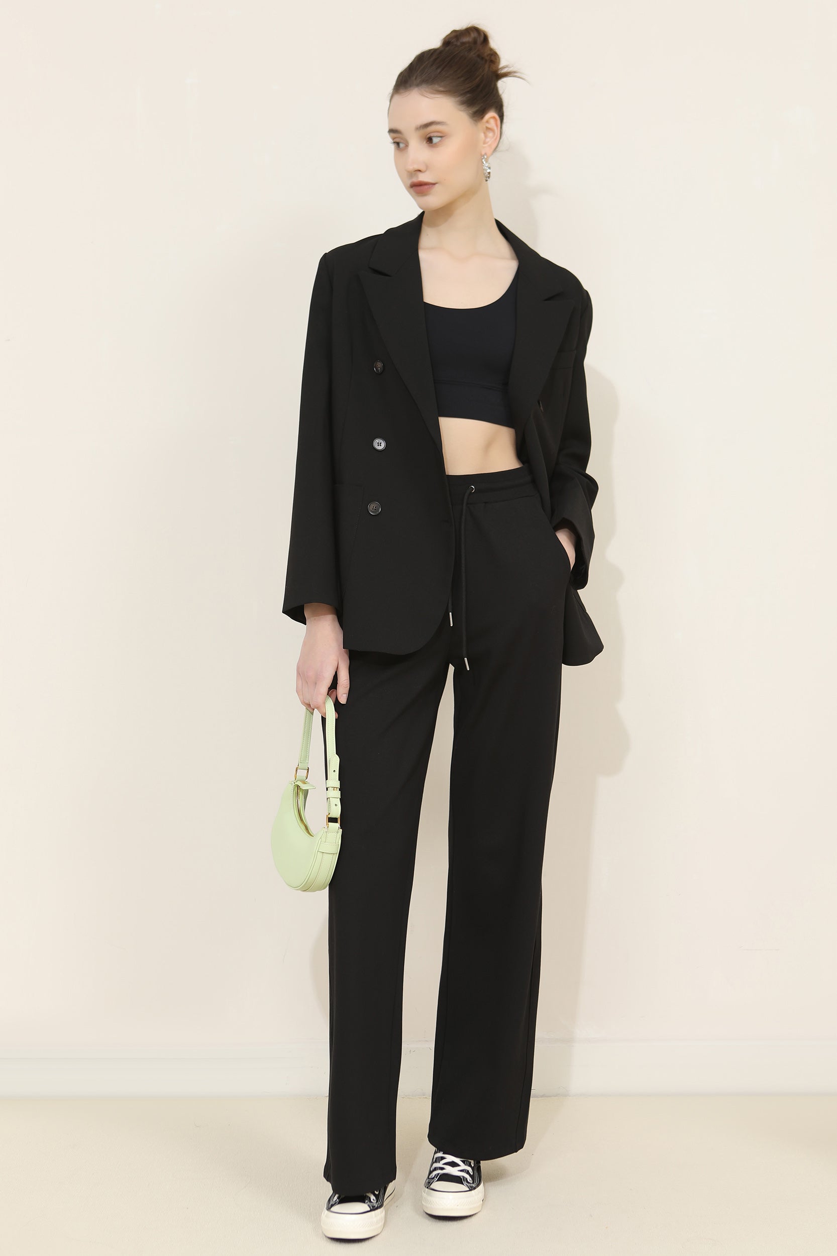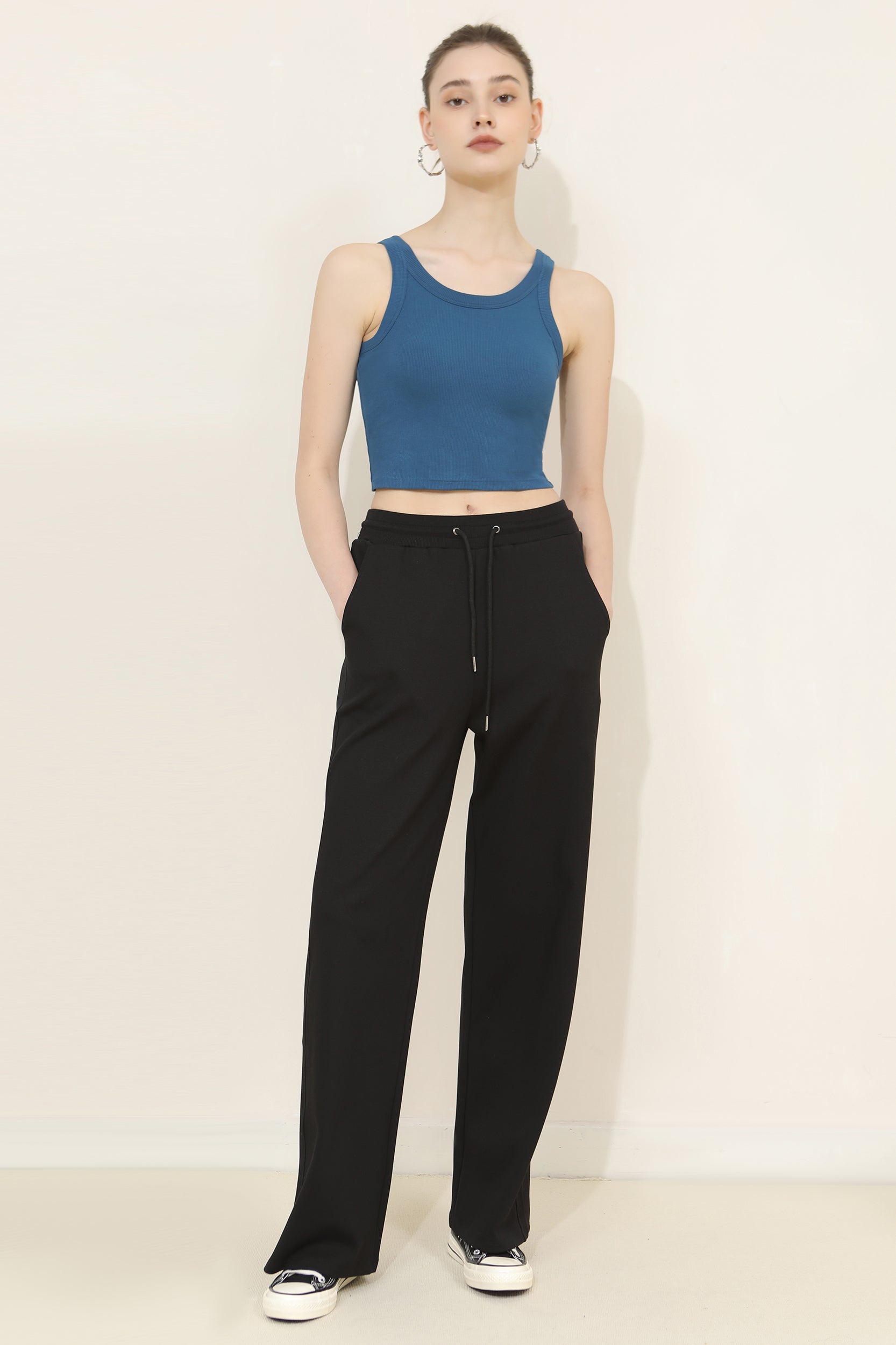 These pants feature a relaxed fit and an elastic waistband with a drawstring for adjustable comfort. The soft fabric and flowing silhouette make them ideal for casual or lounge wear while maintaining a chic and modern look.