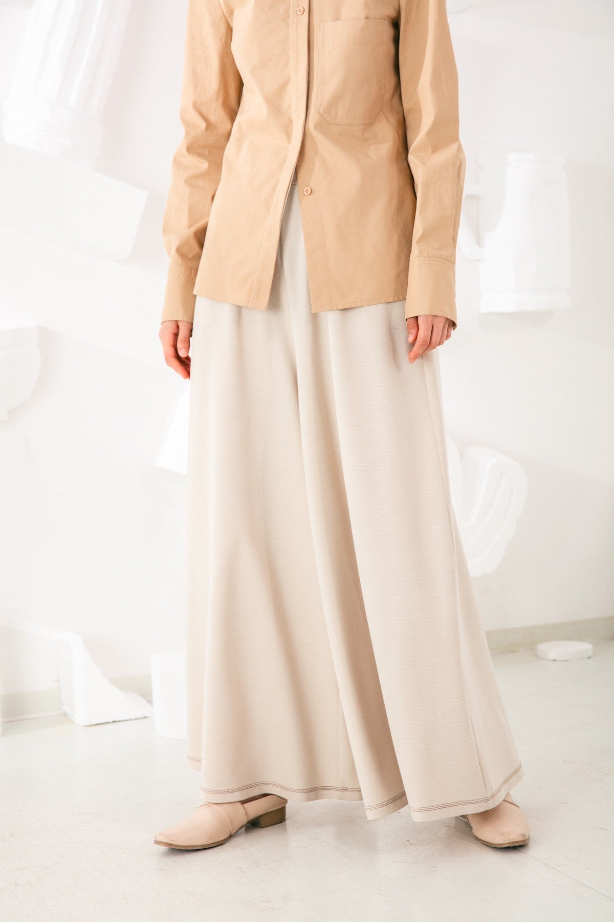 Inject a forward-thinking perspective into your essentials edit with our beautiful Pants. Its simple yet elegant silhouette is highlighted by loose, extra-wide legs that flare out from the waist and sophisticated contrast stitching along the hemline.