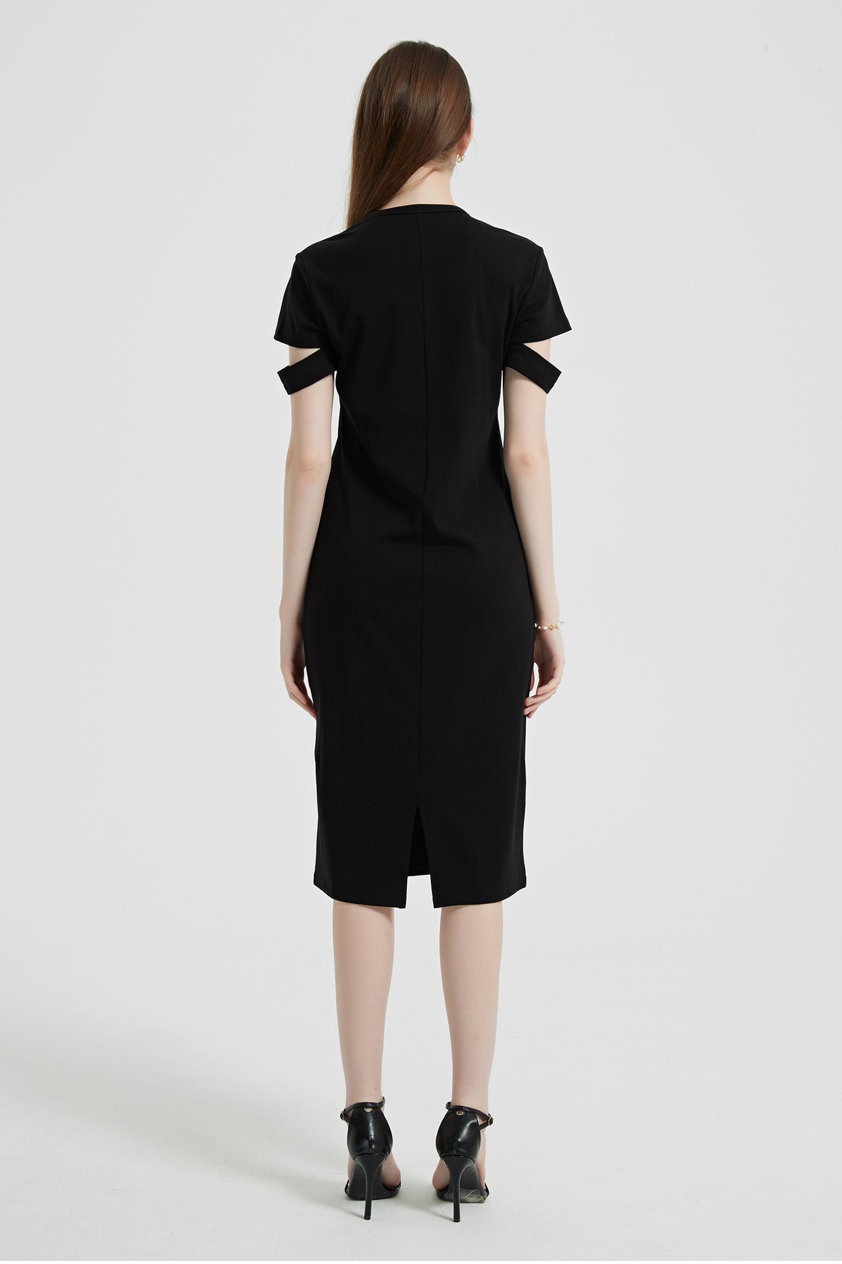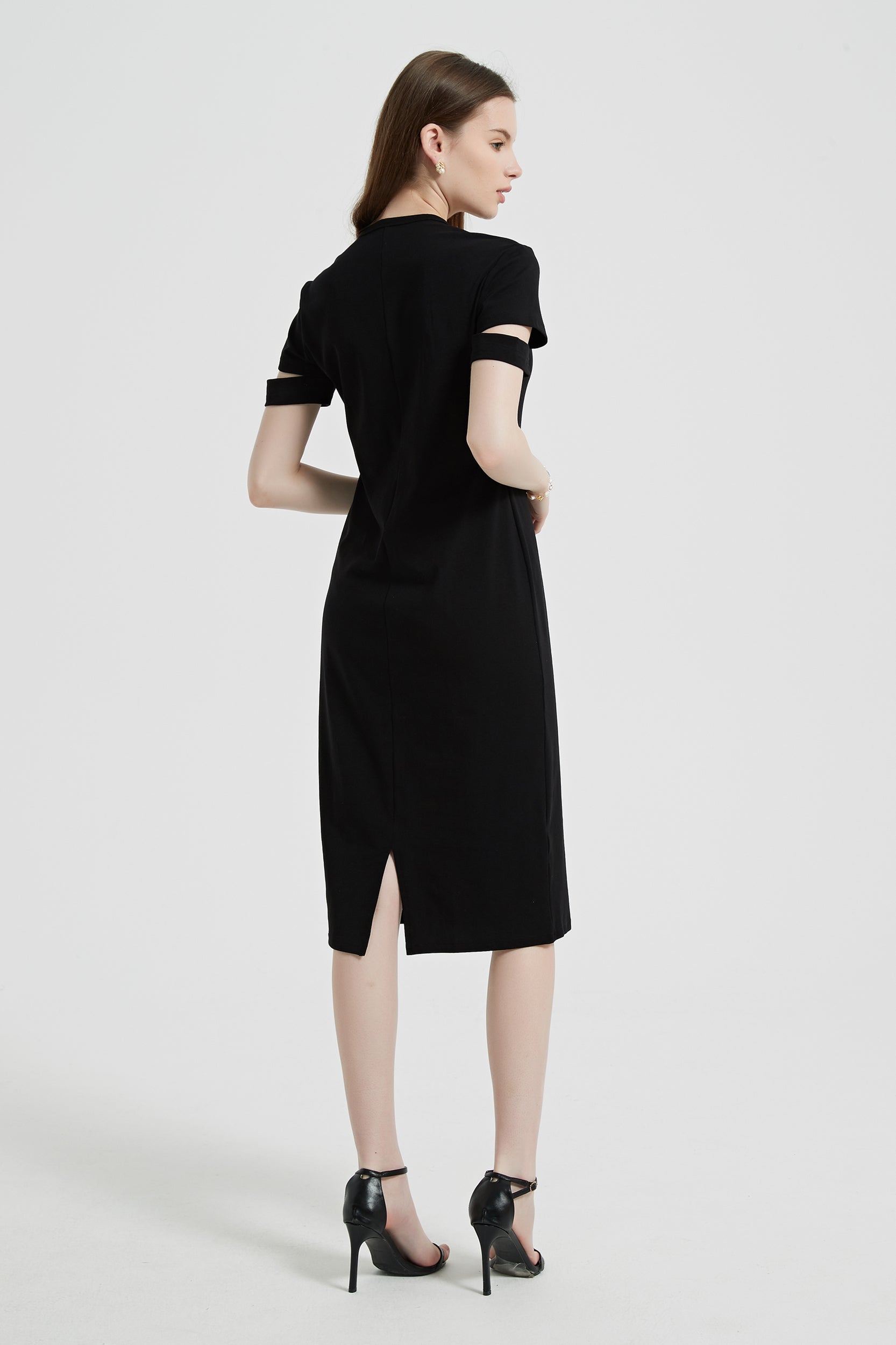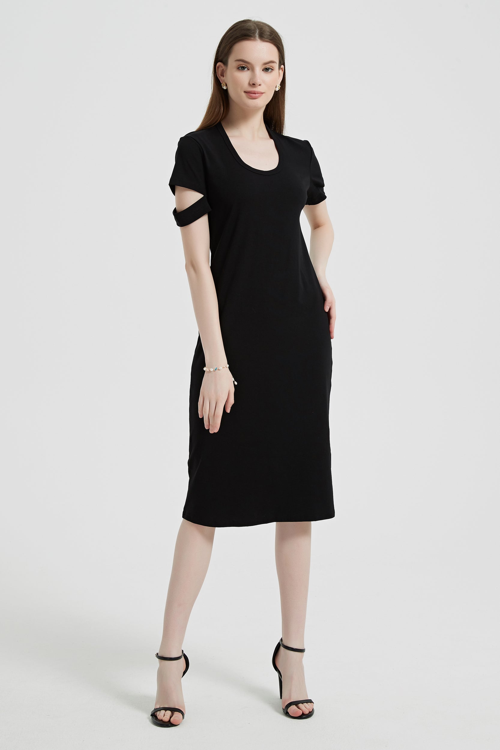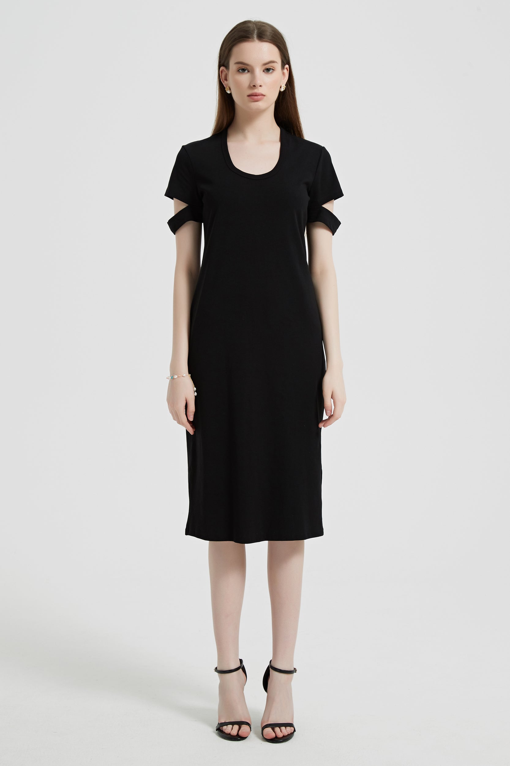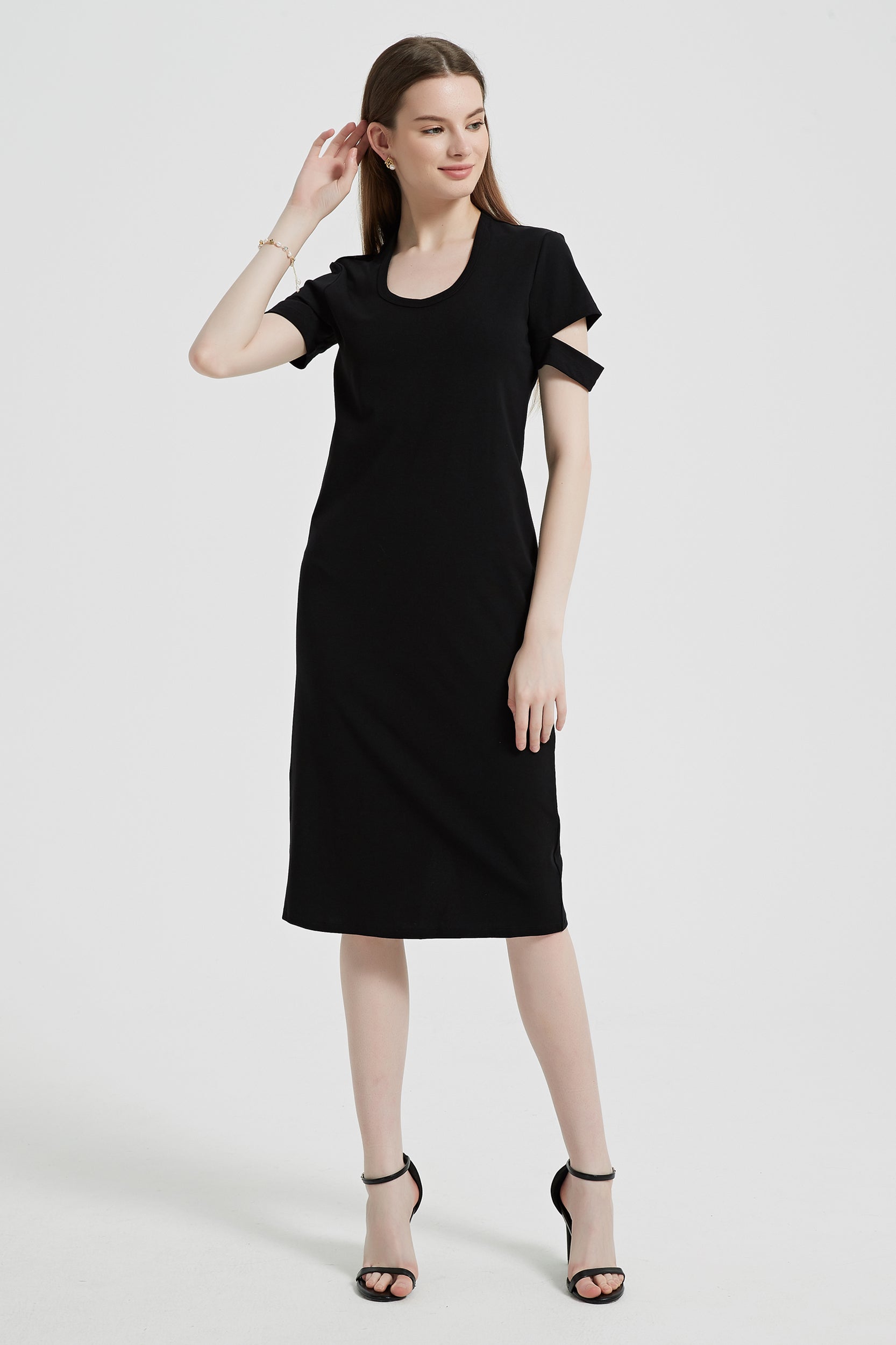 Indulge in effortless style with our dress, featuring a flattering scoop neck and chic short sleeves with cutout details.