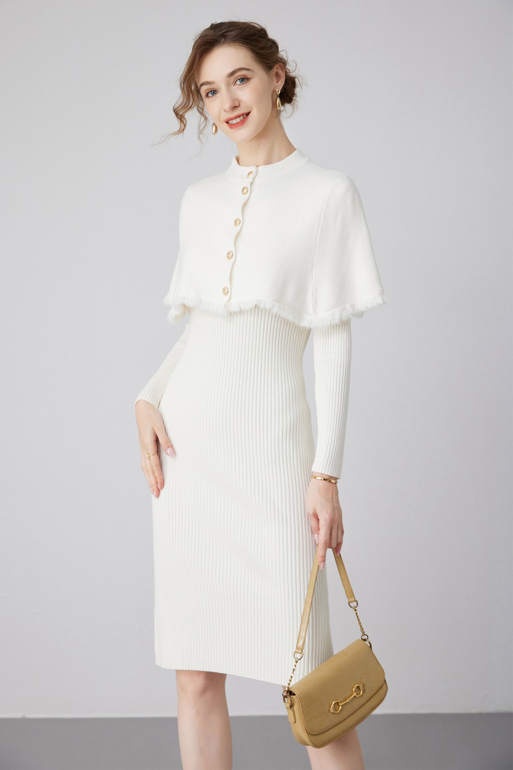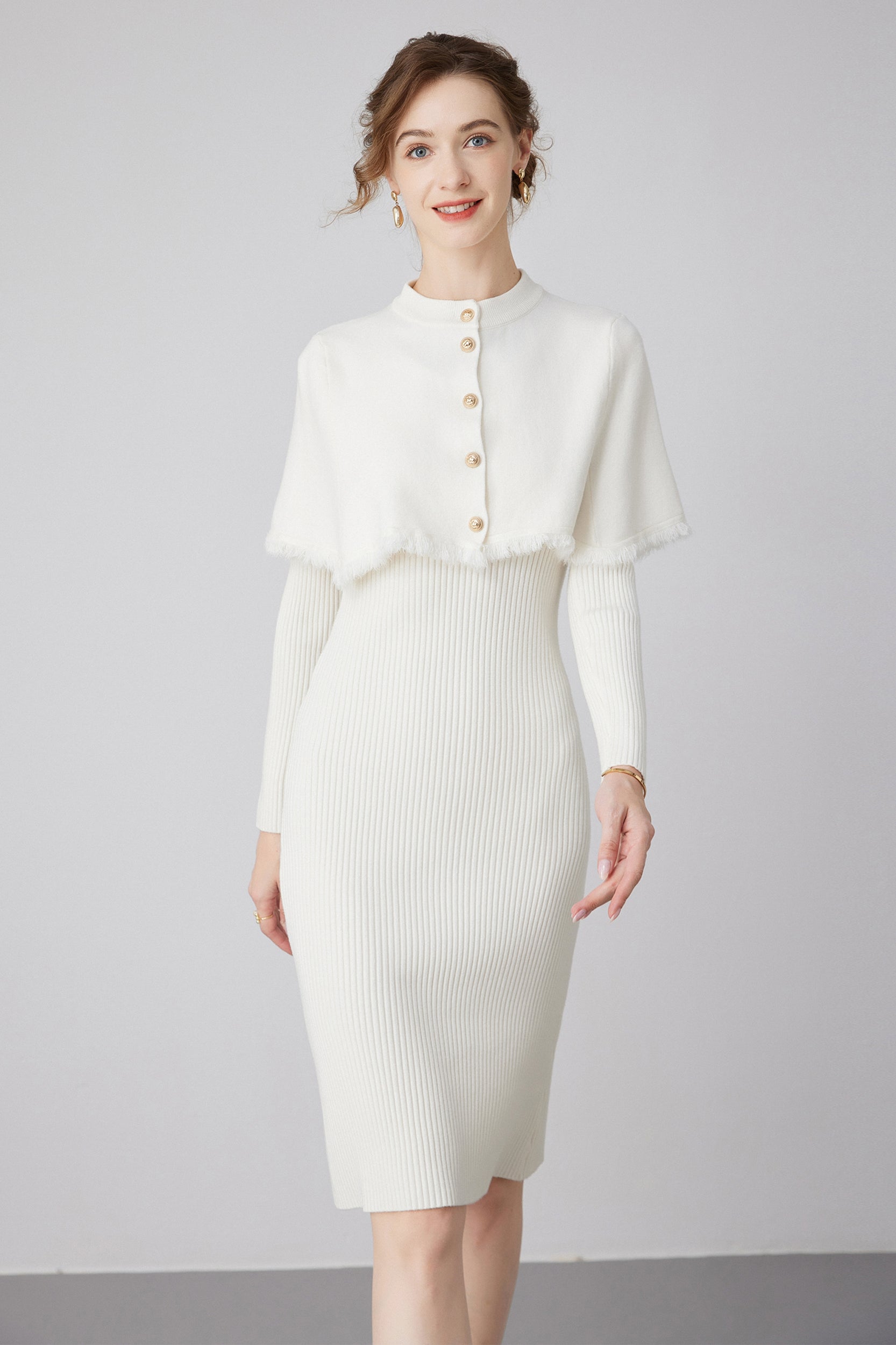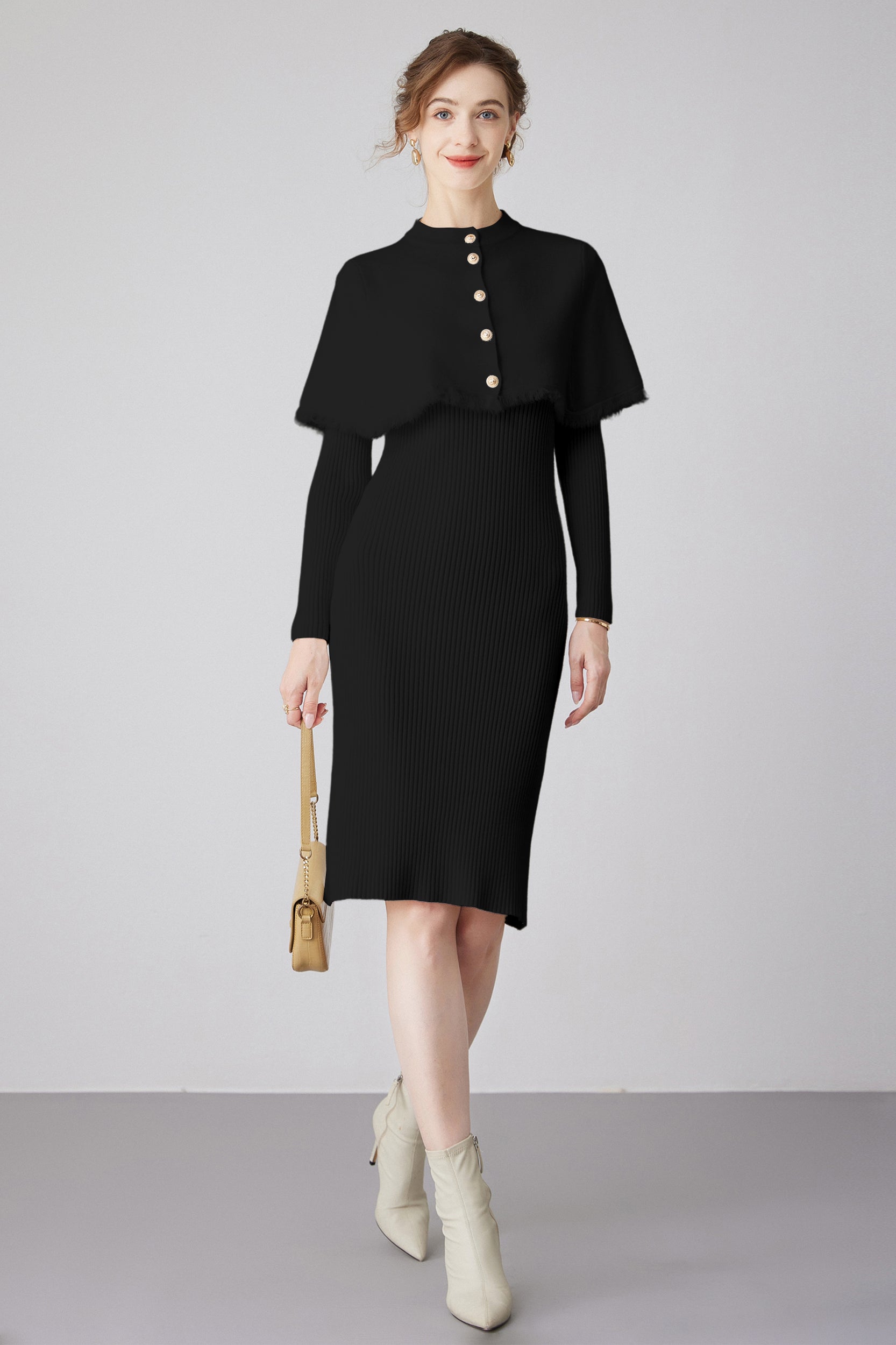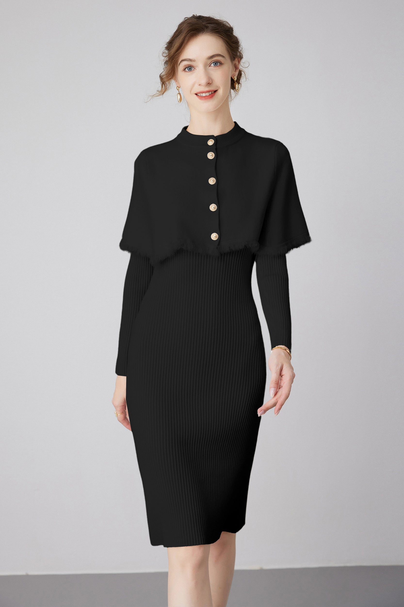 Step into elegance with our dress, a versatile piece that effortlessly combines style and sophistication. The dress features a removable cape, adorned with chic gold buttons, providing an extra touch of glamour.