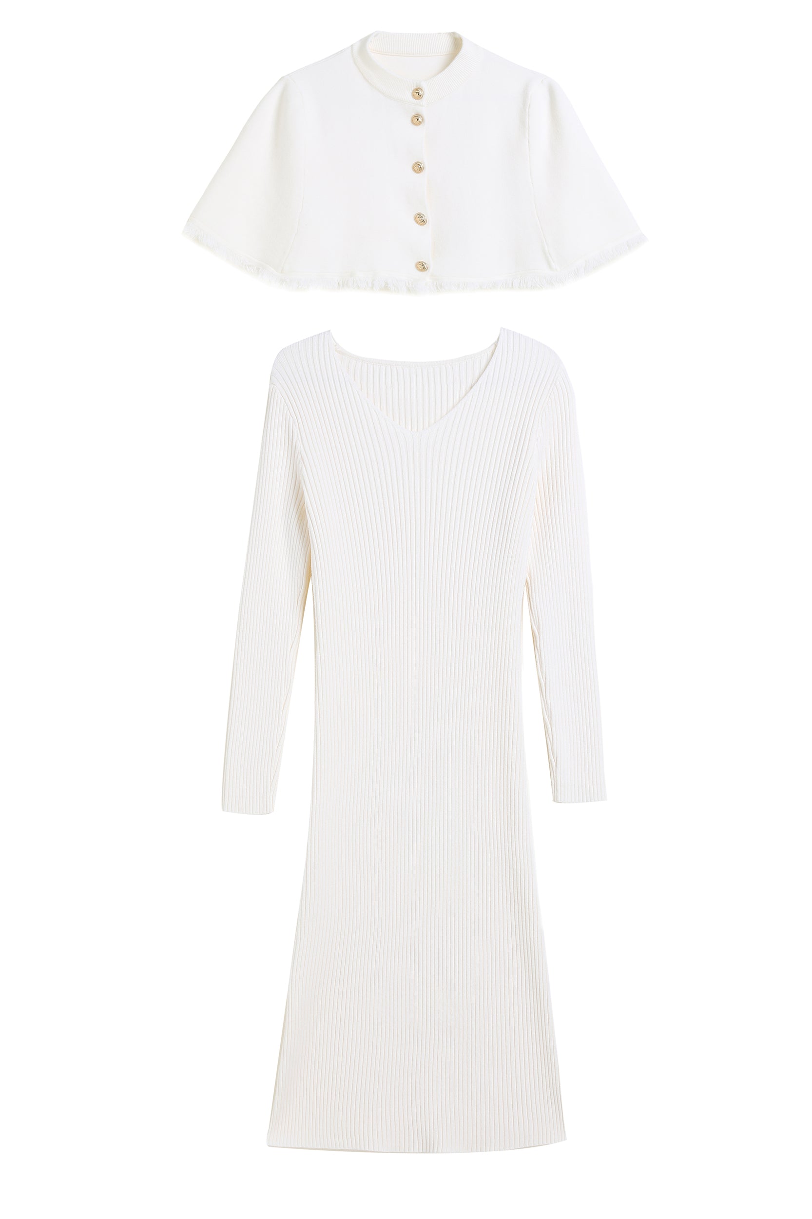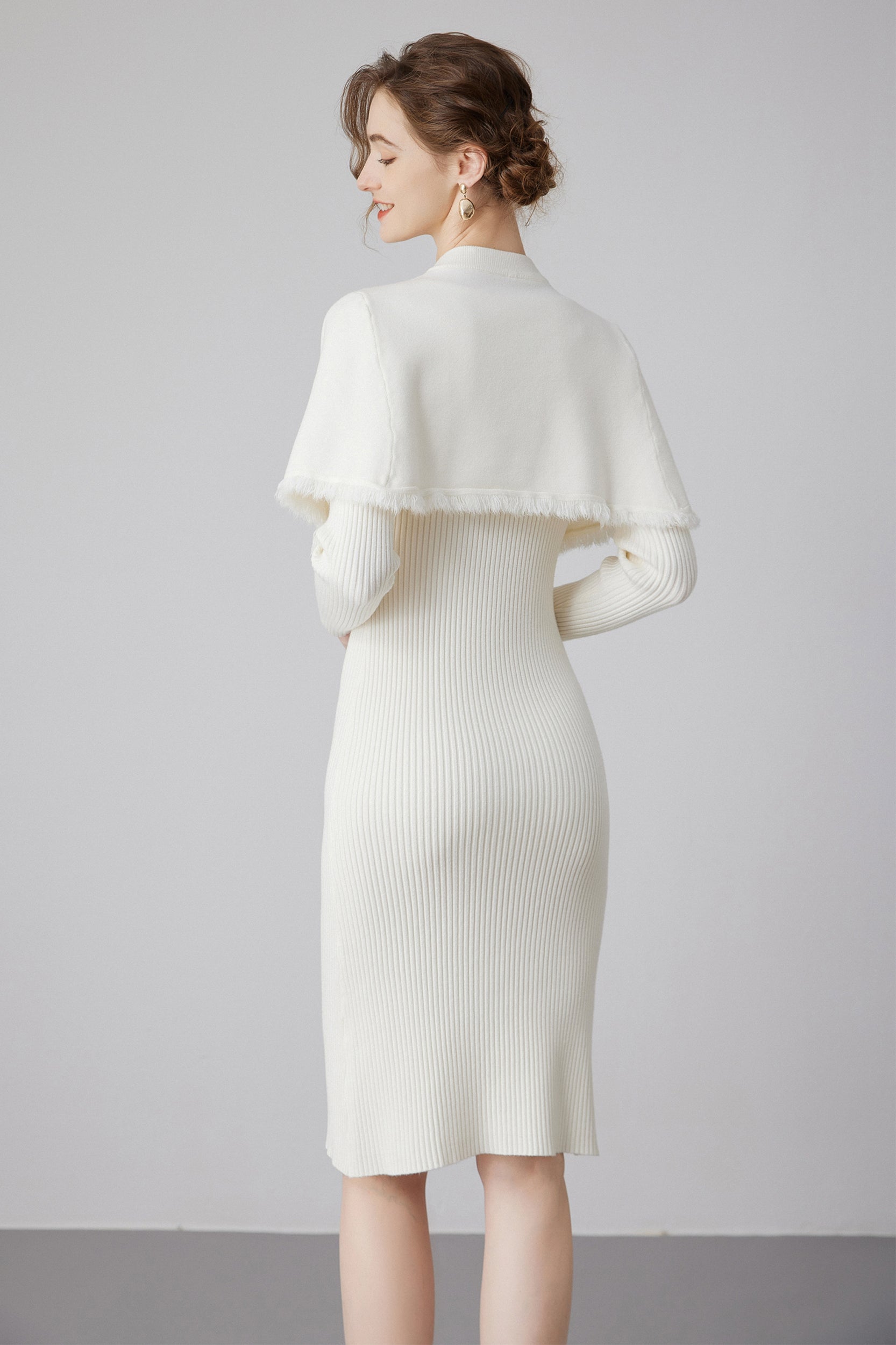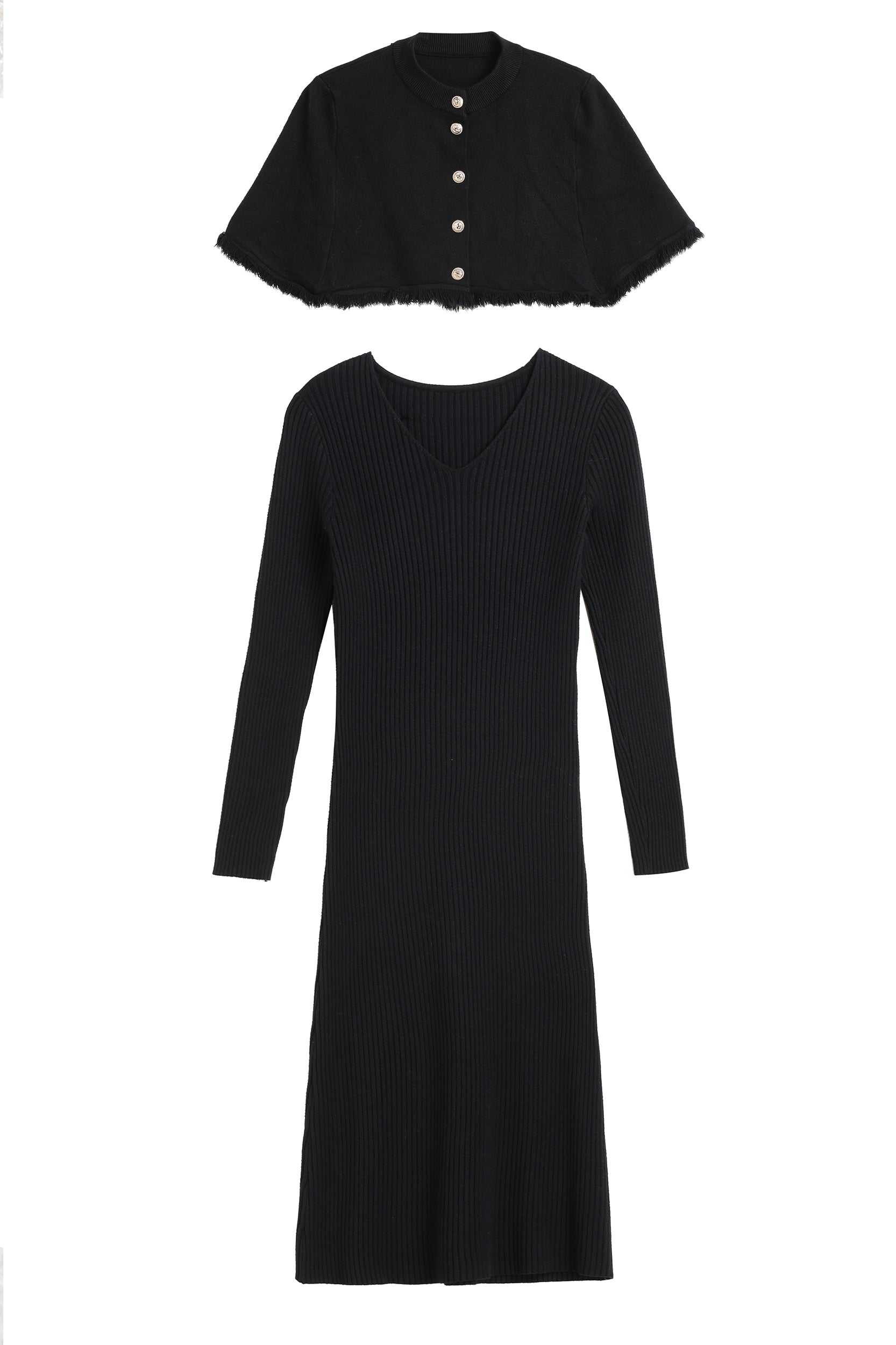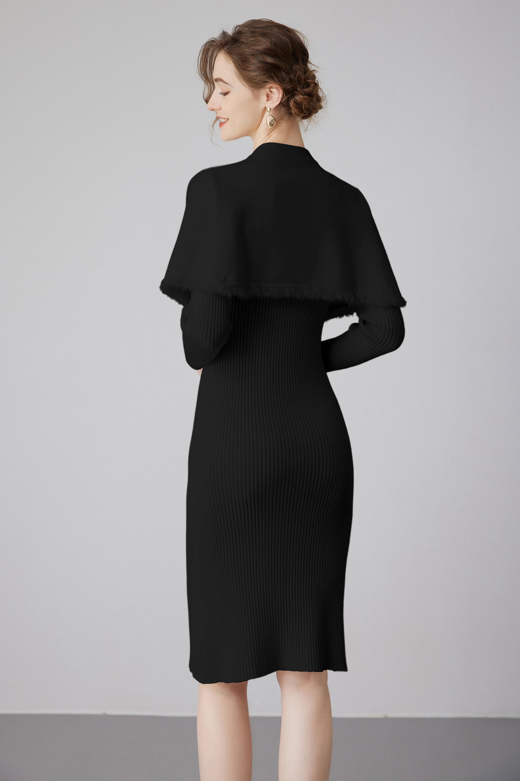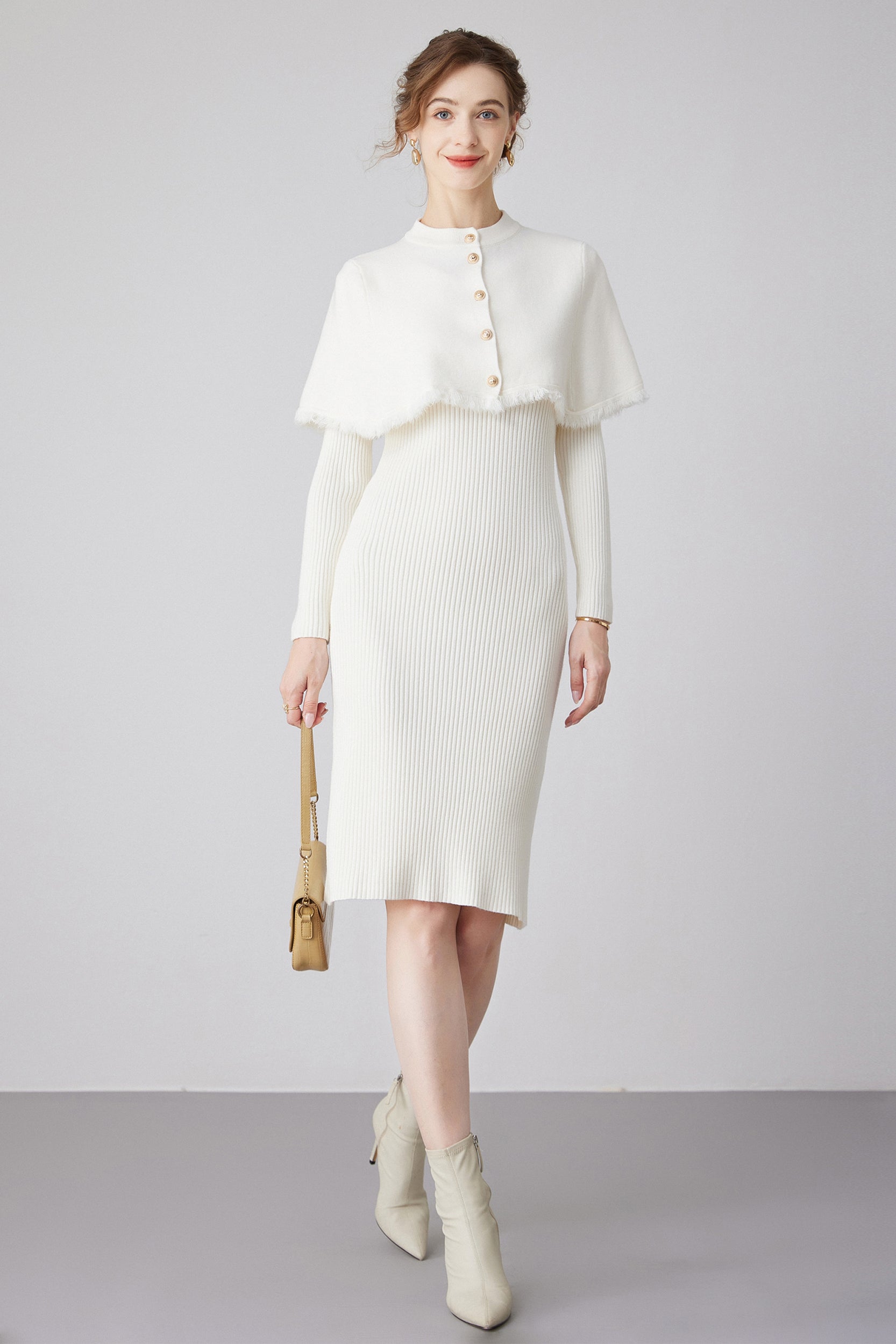 Step into elegance with our dress, a versatile piece that effortlessly combines style and sophistication. The dress features a removable cape, adorned with chic gold buttons, providing an extra touch of glamour.