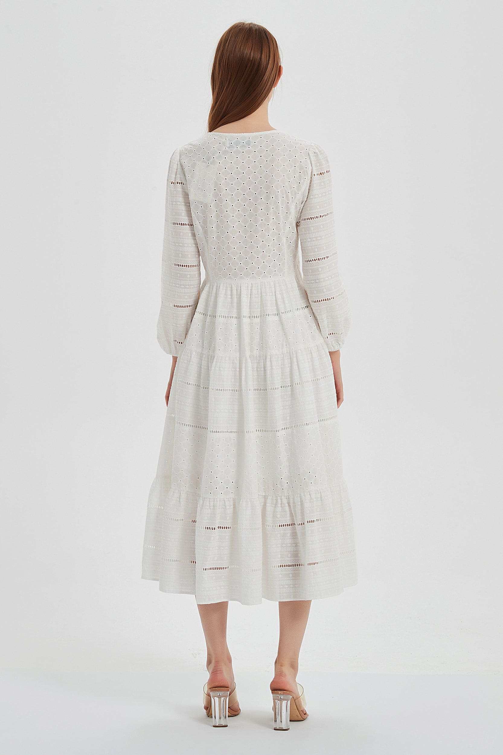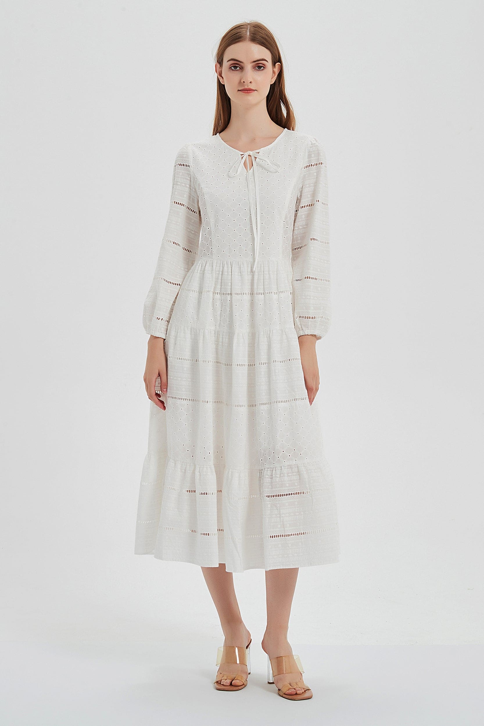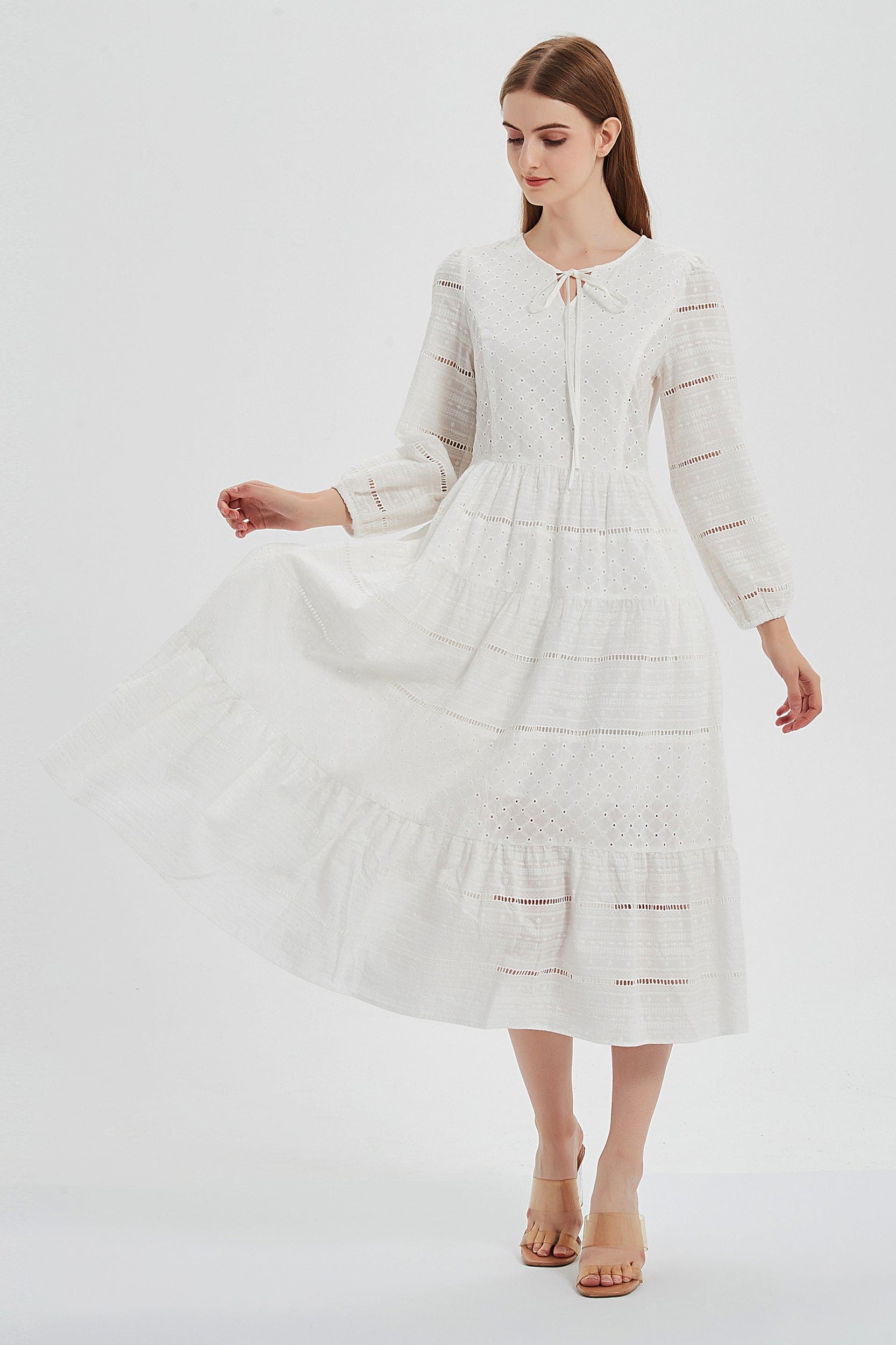 Step into refined elegance with our dress, showcasing delicate embroidery details that elevate your style. The long puffed sleeves and tiered skirt offer a graceful silhouette, while the keyhole neckline adds a touch of femininity.