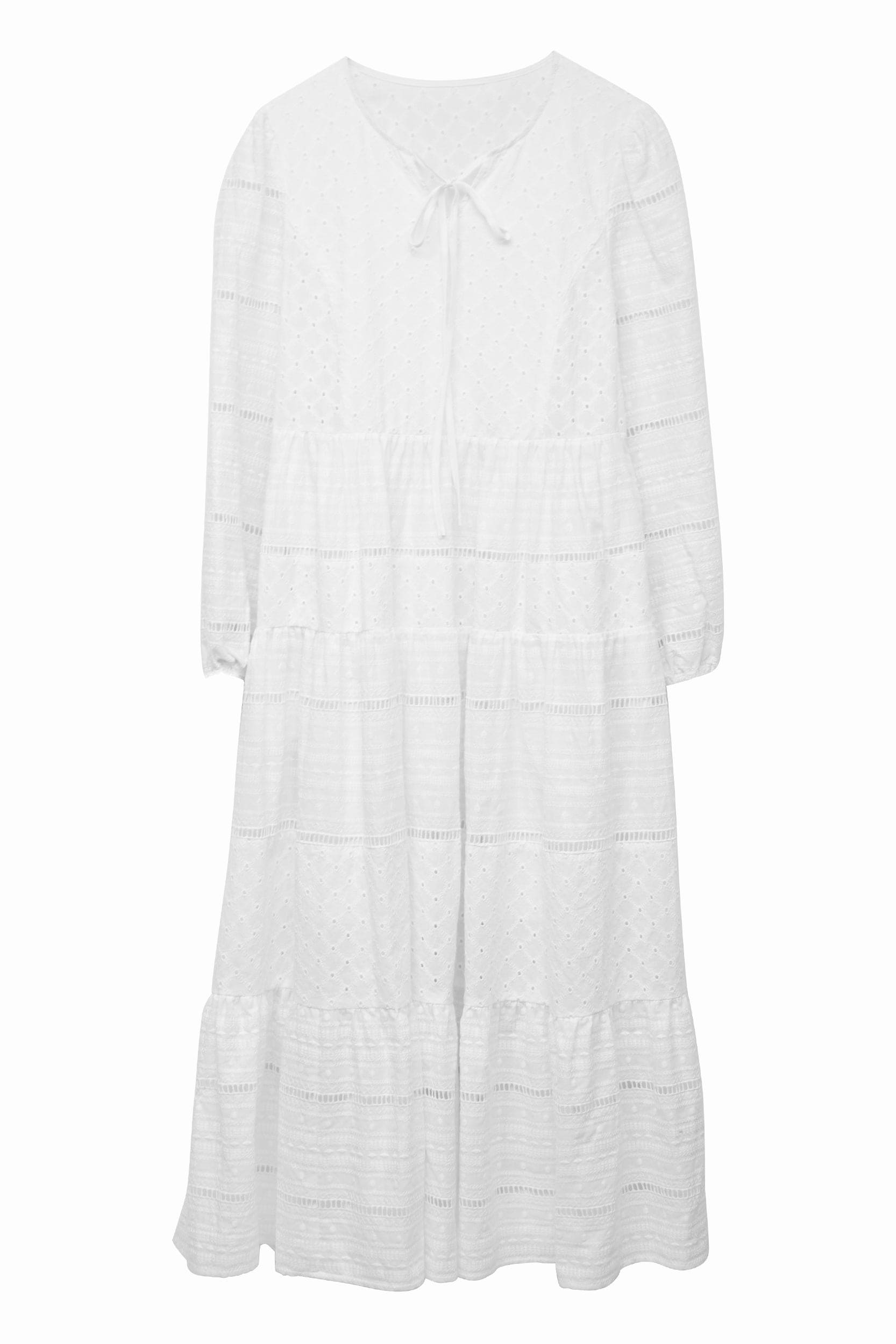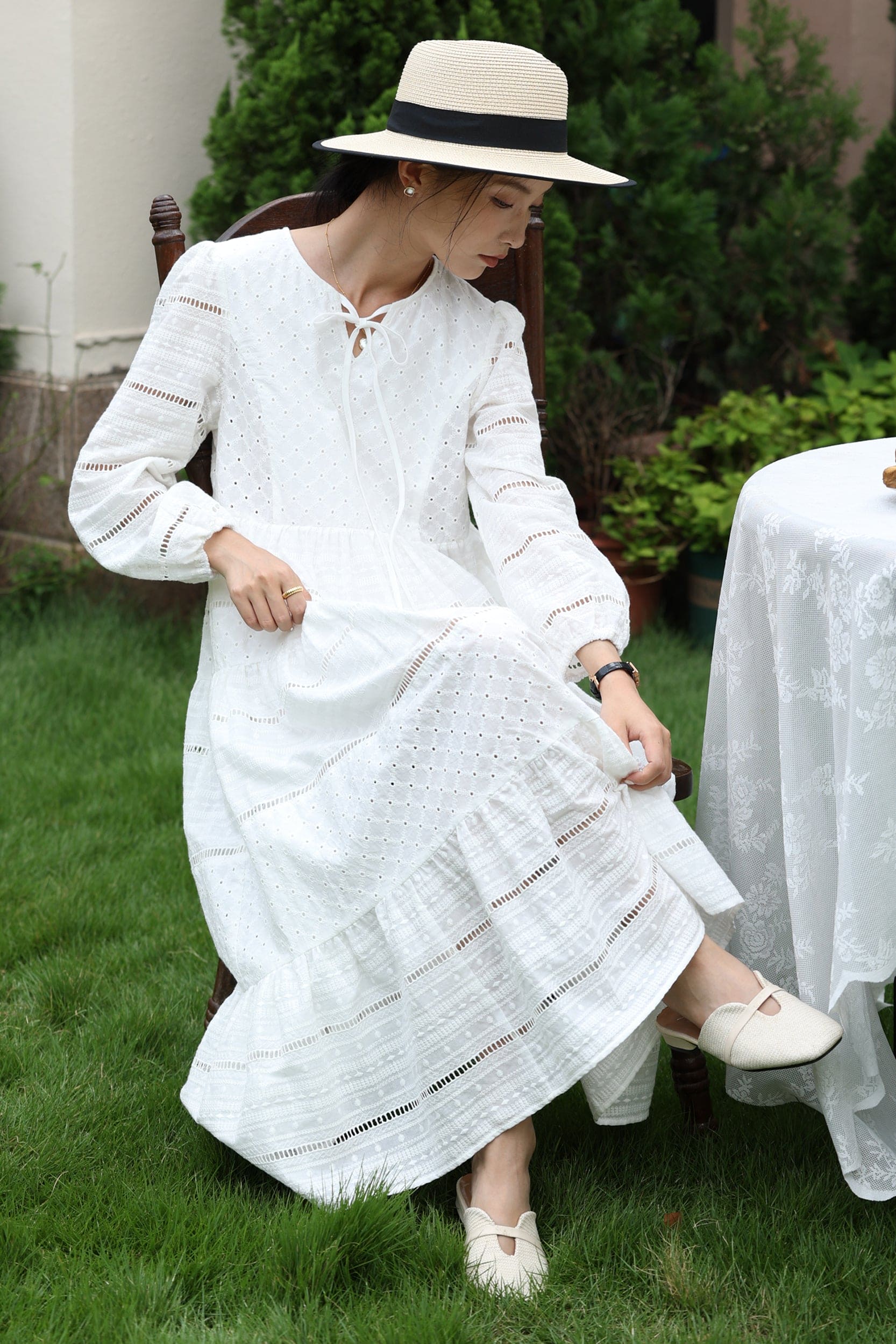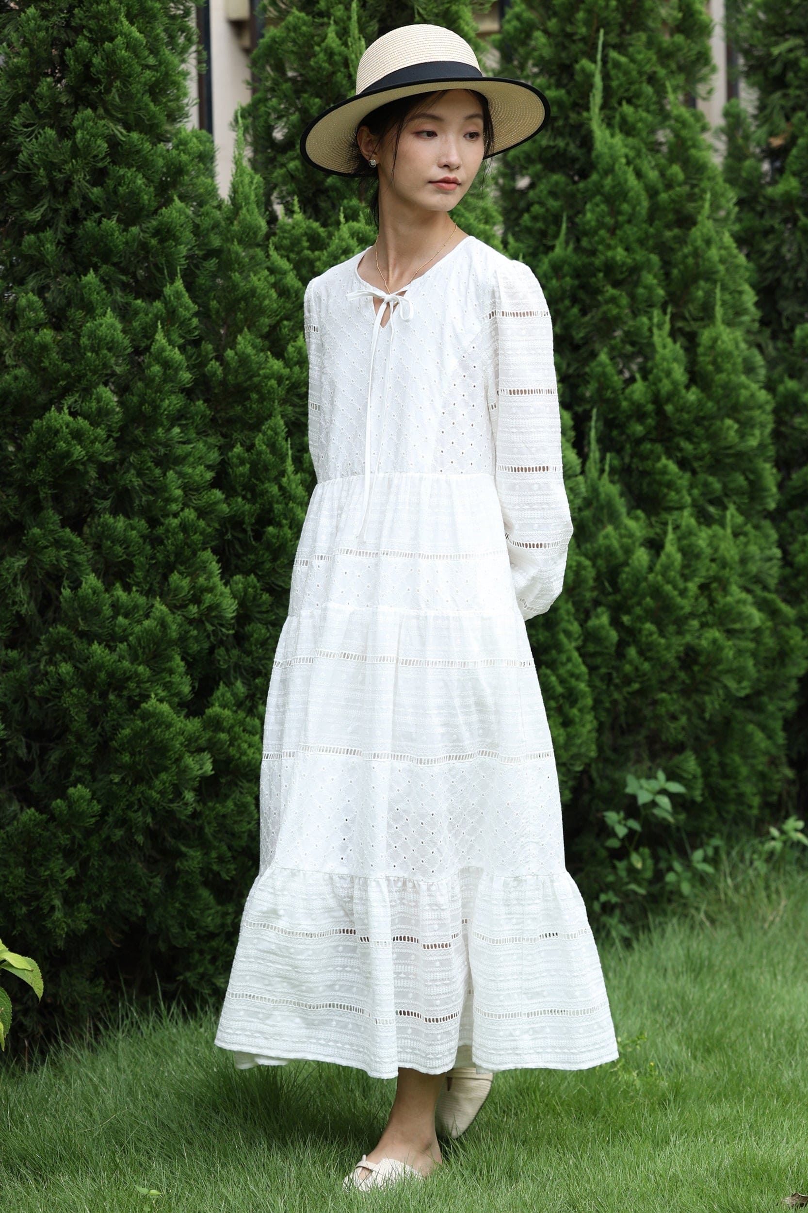 Step into refined elegance with our dress, showcasing delicate embroidery details that elevate your style. The long puffed sleeves and tiered skirt offer a graceful silhouette, while the keyhole neckline adds a touch of femininity.