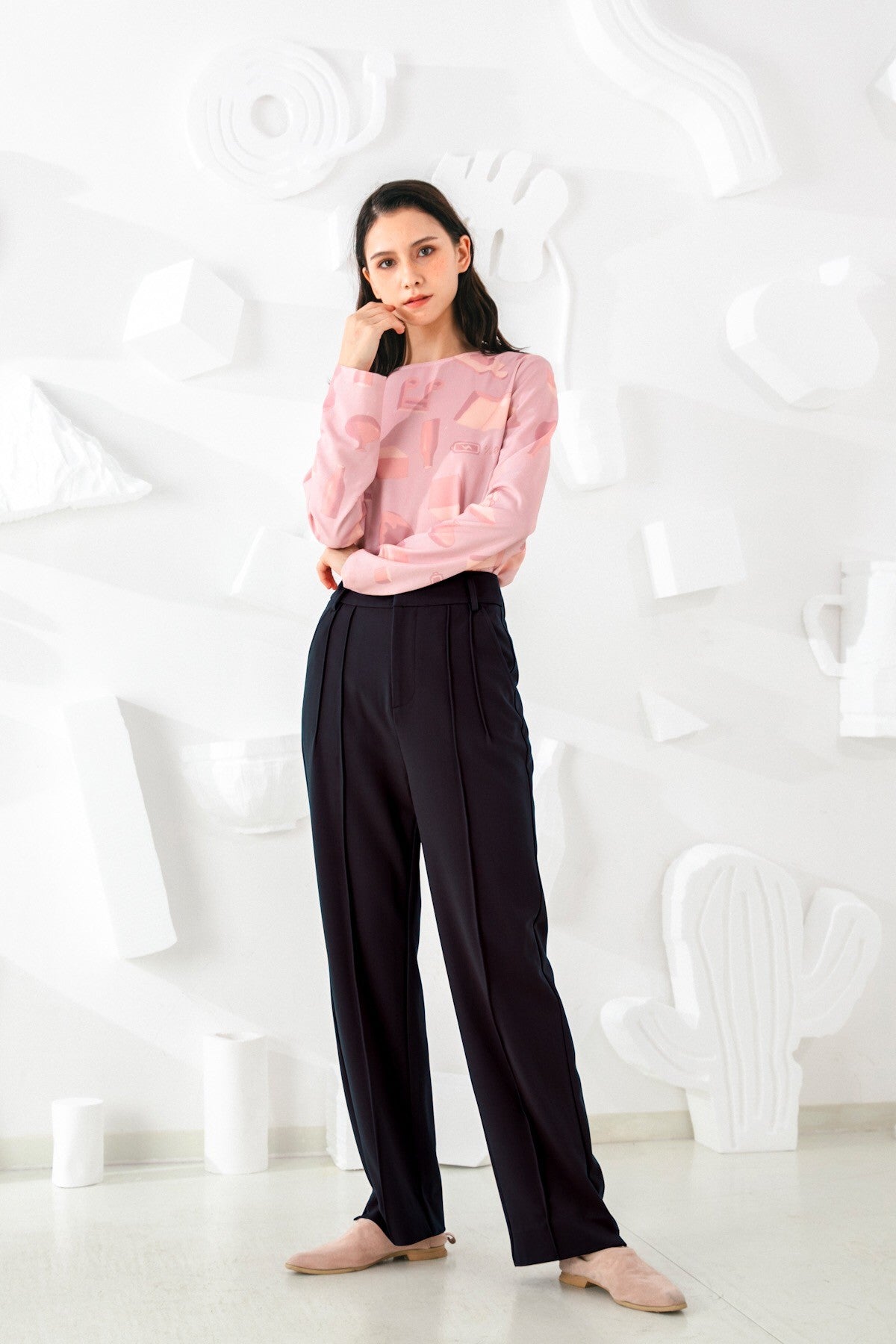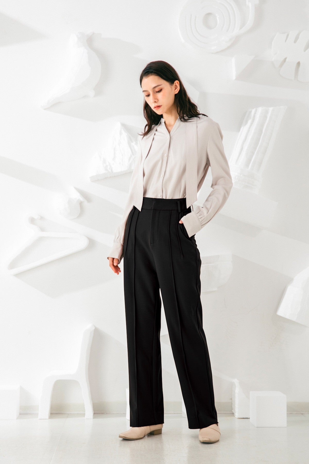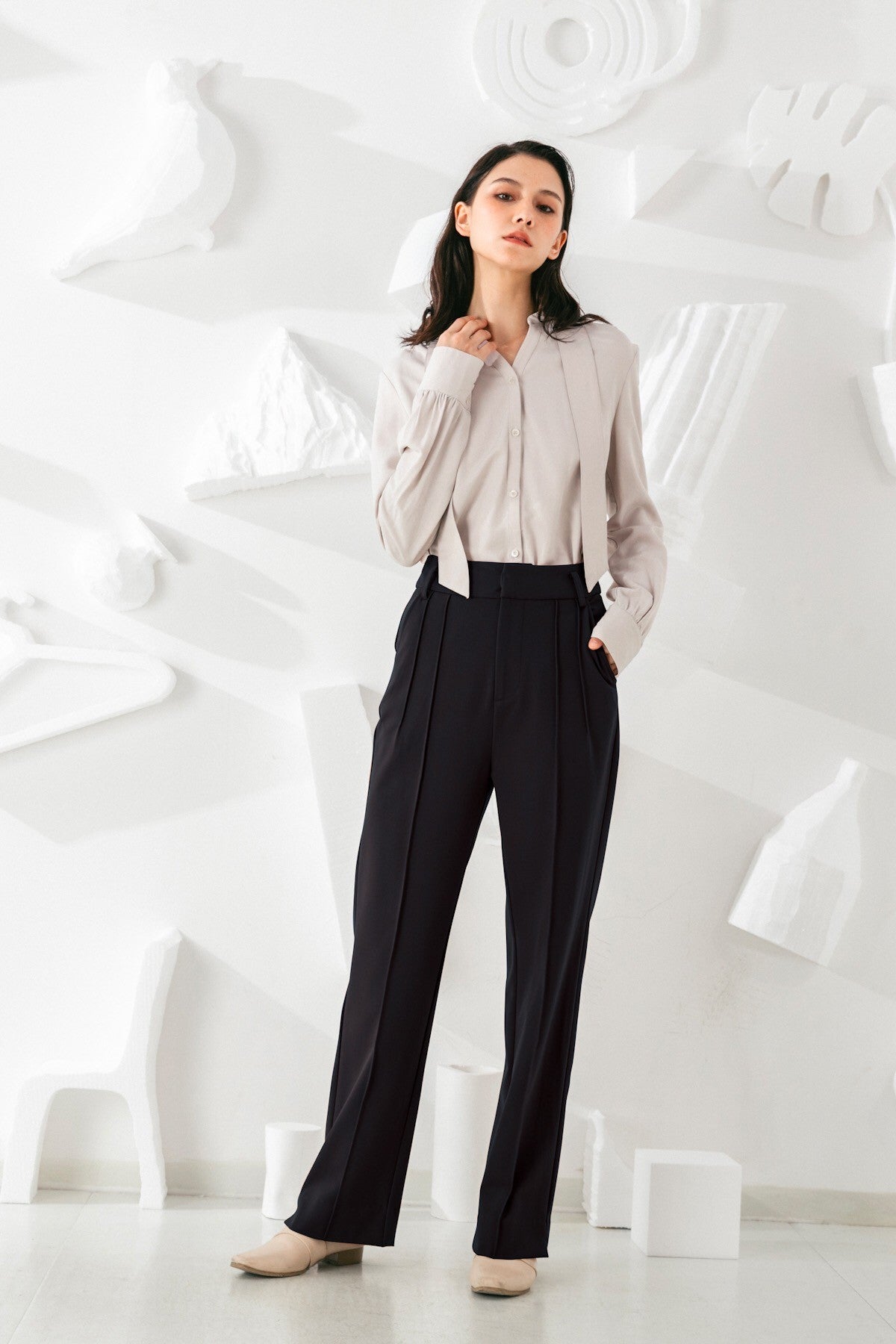 Invest in a timeless wardrobe staple with our Pants. Its simple yet elegant silhouette is highlighted by a high-rise finish and elongating vertical lines. The straight fit creates a sleek silhouette that will pair effortlessly with feminine blouses and sharp outerwear.