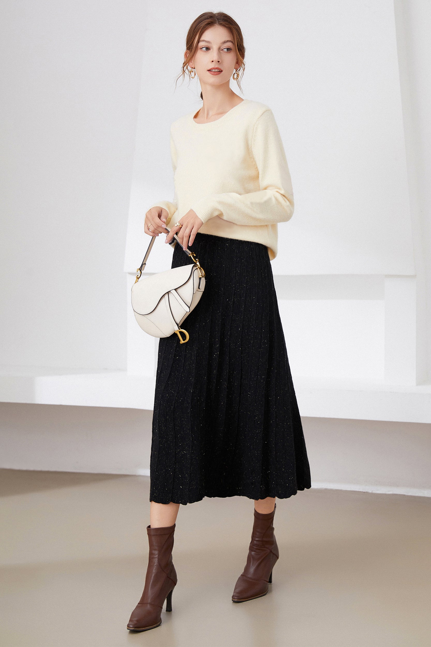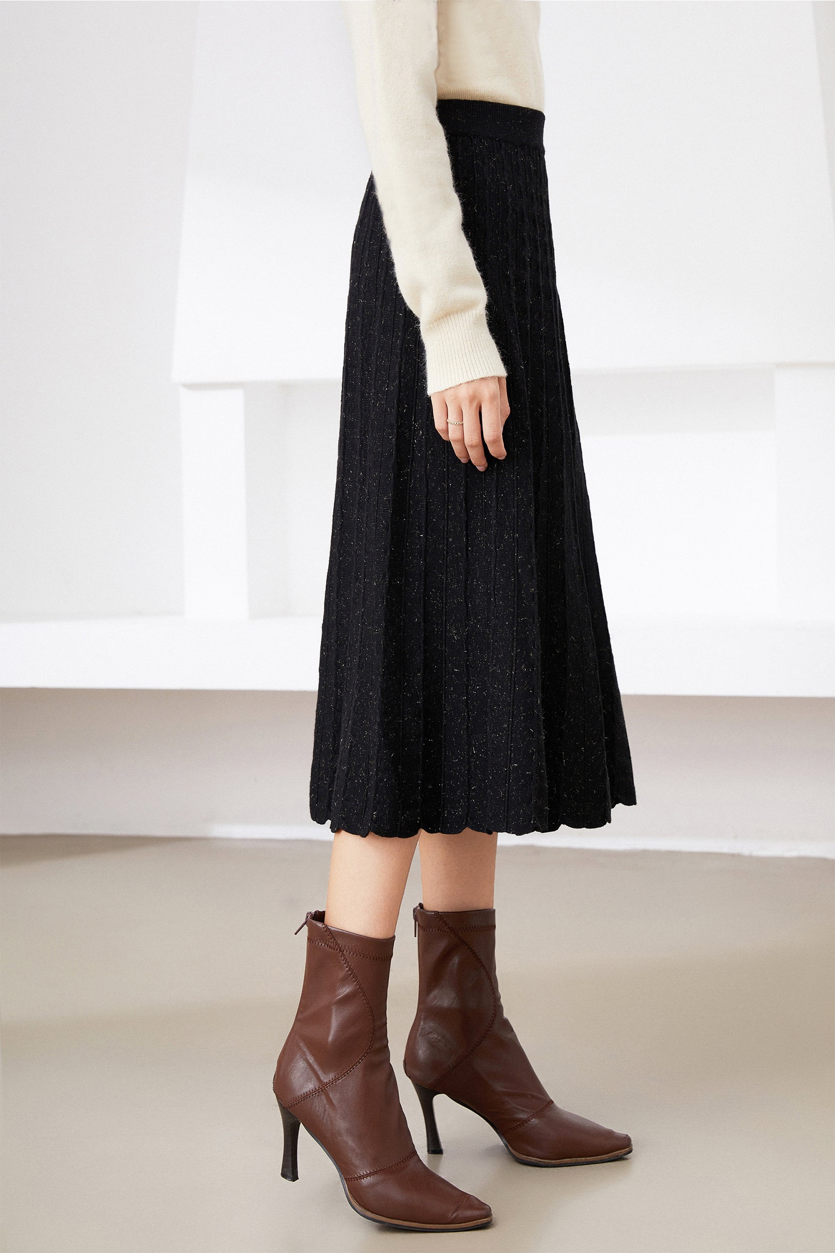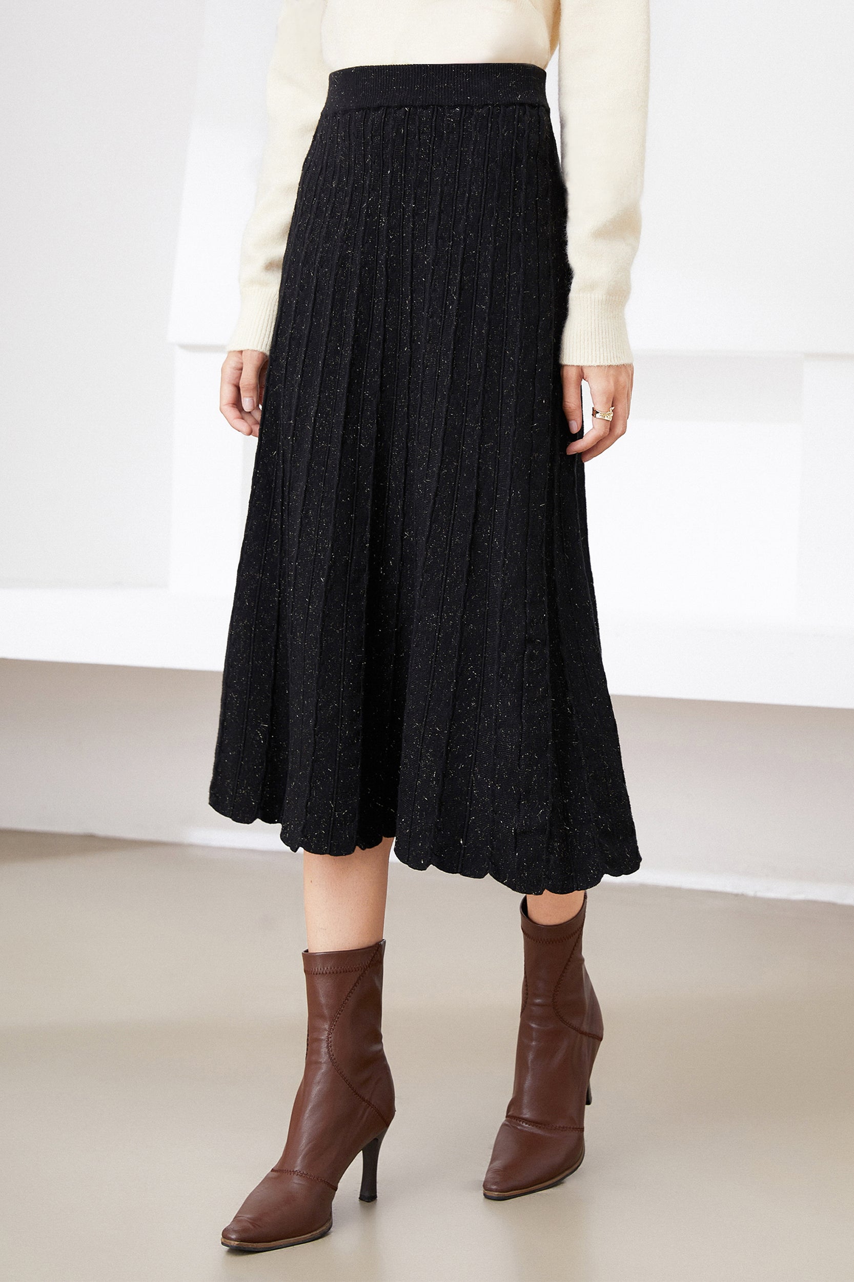 Illuminate your style with our skirt. The shimmering metallic finish adds a touch of glamour to the classic pleated design, creating a versatile piece that seamlessly transitions from day to night.