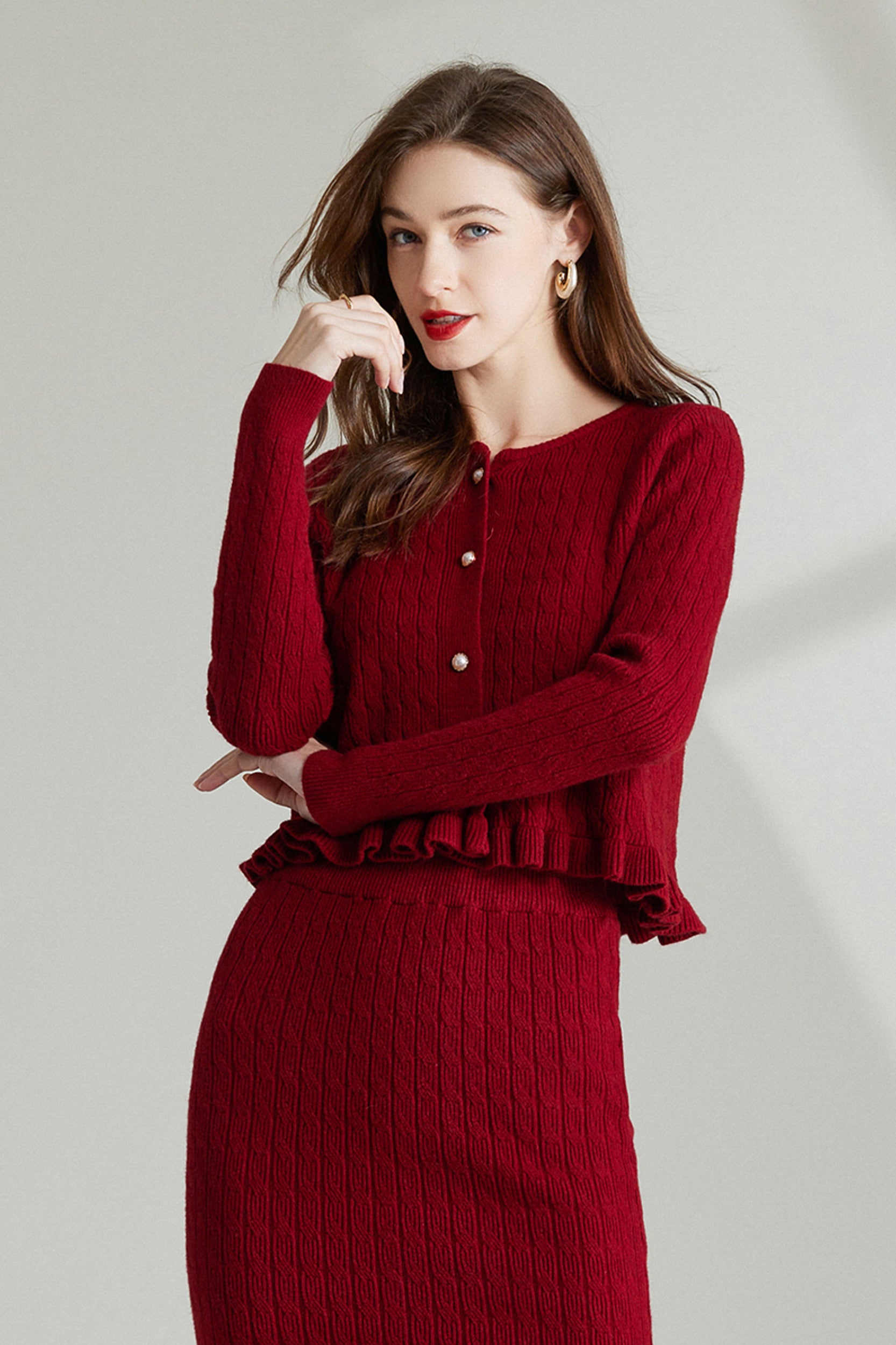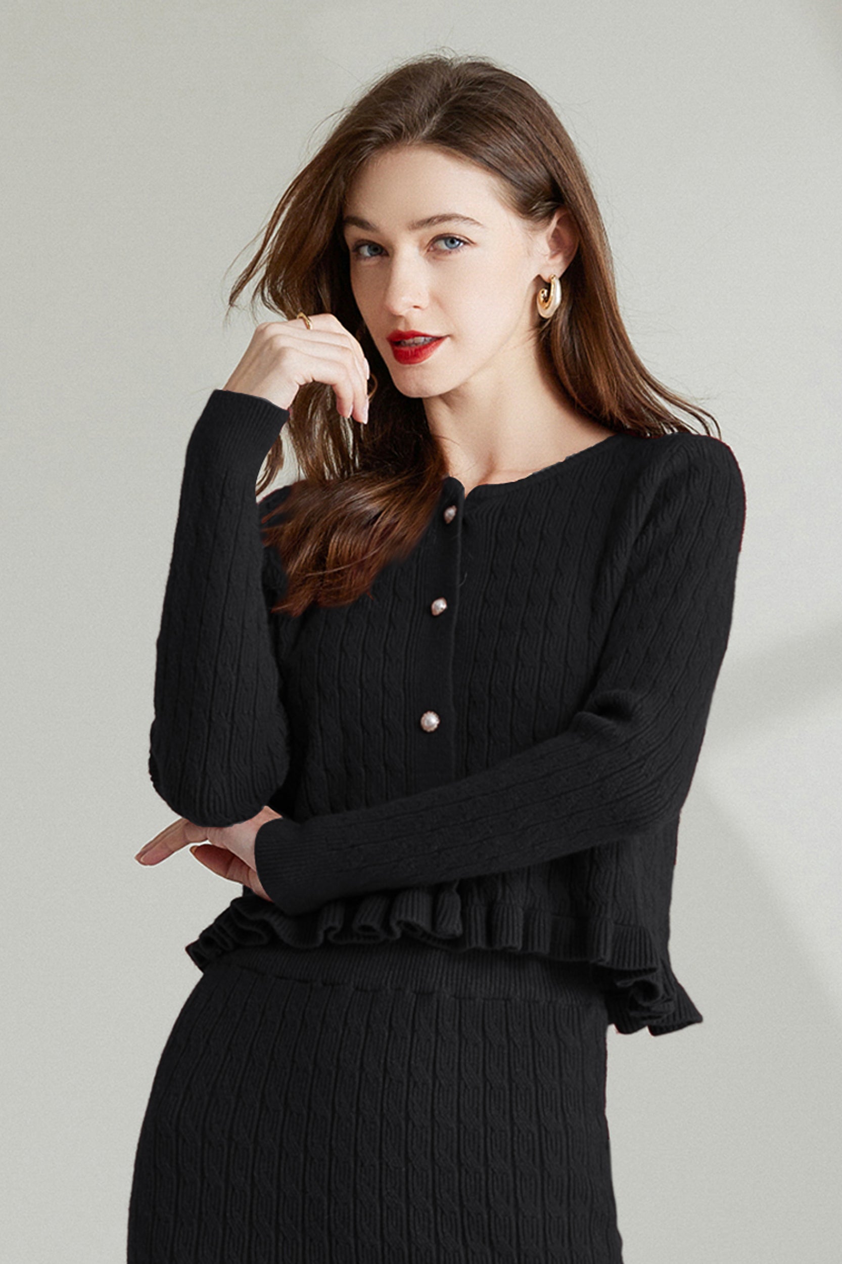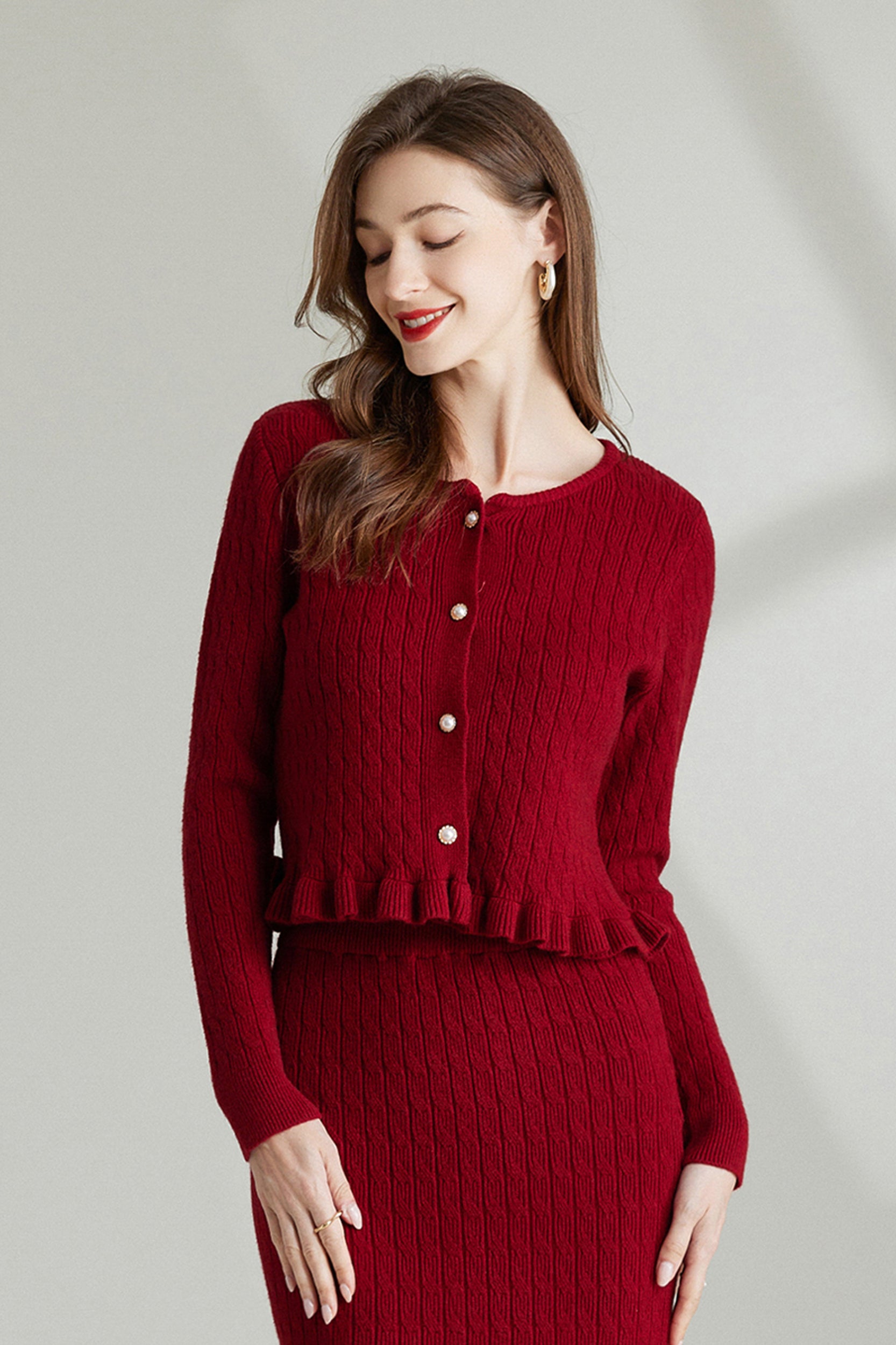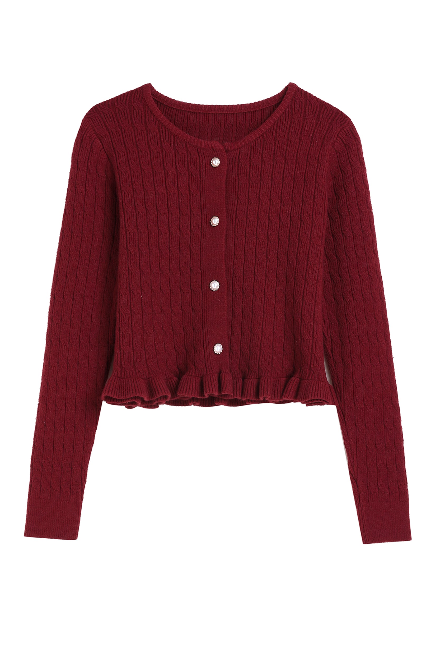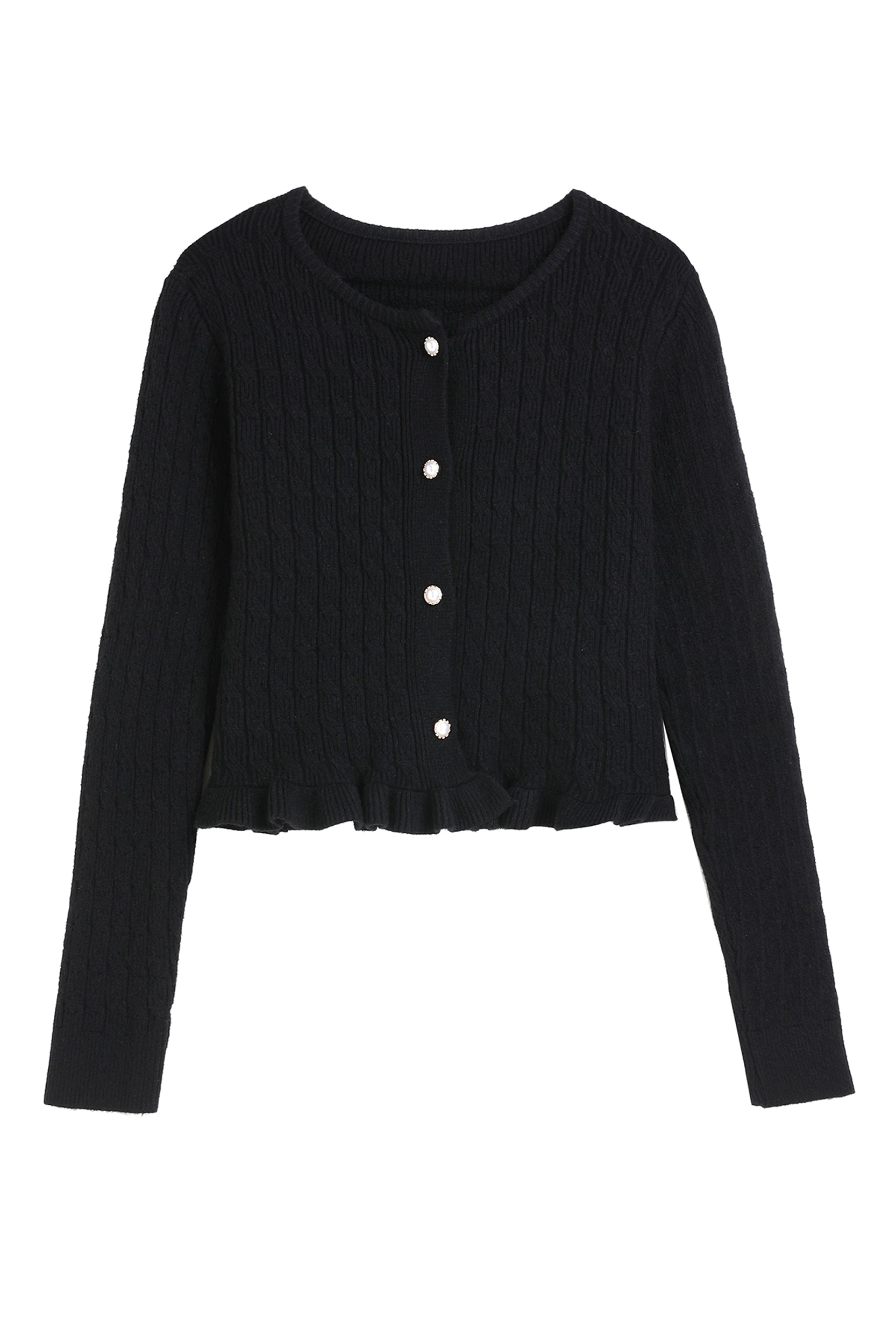 Wrap yourself in the cozy sophistication of our cardigan. This cardigan features a classic cable knit pattern and is adorned with delicate pearl buttons for an extra touch of elegance.