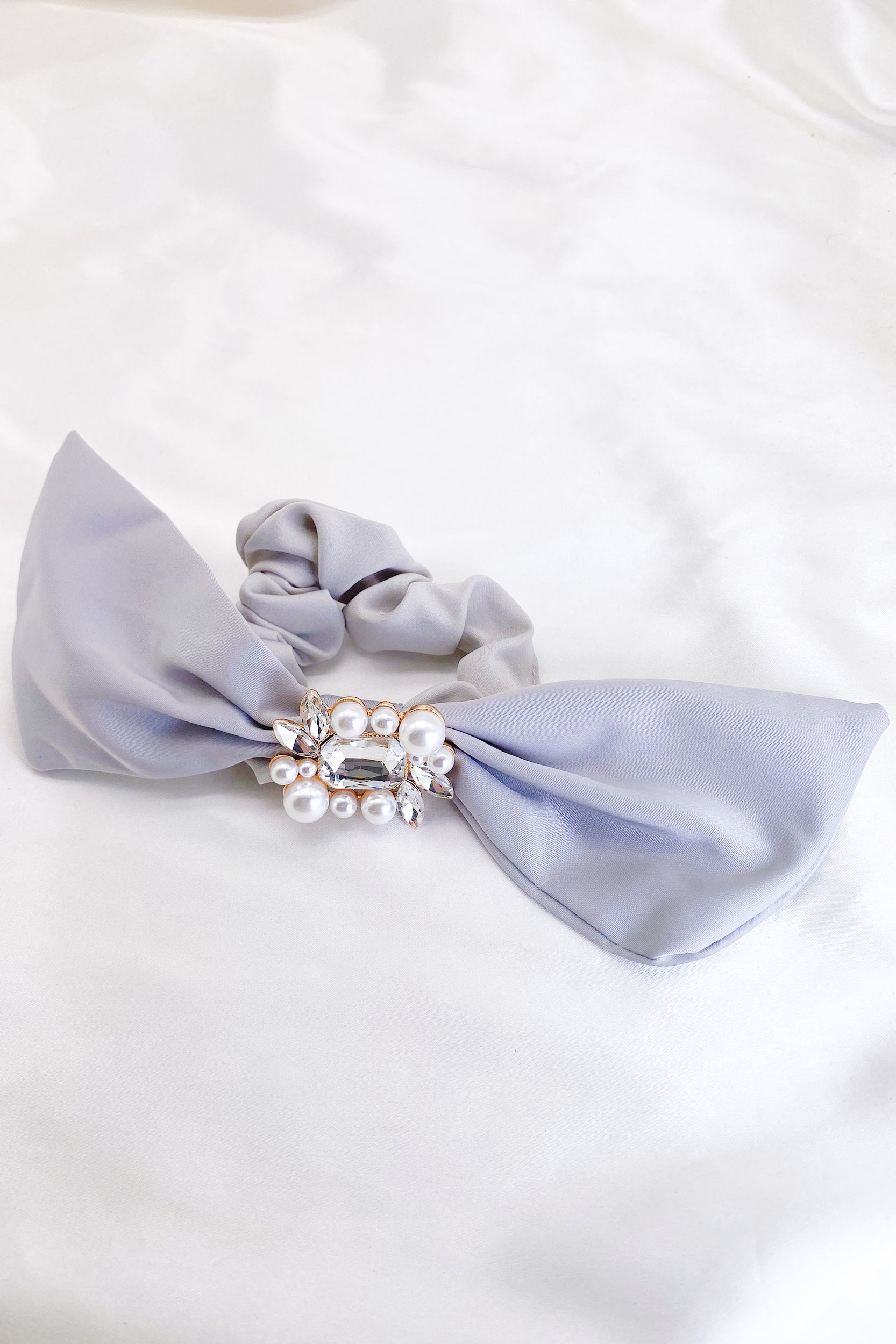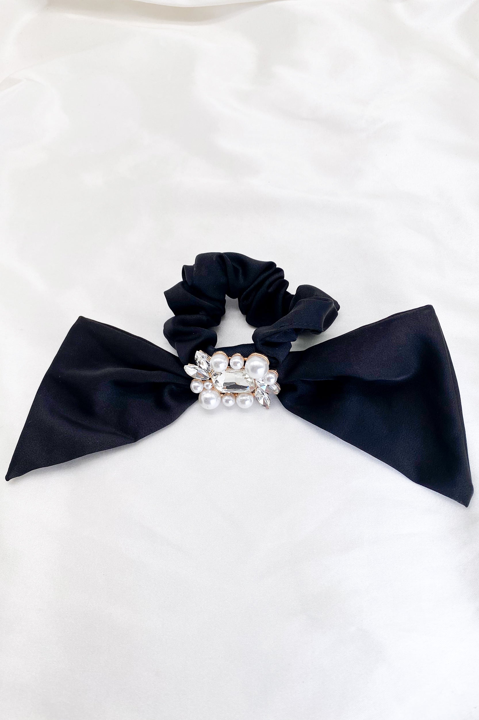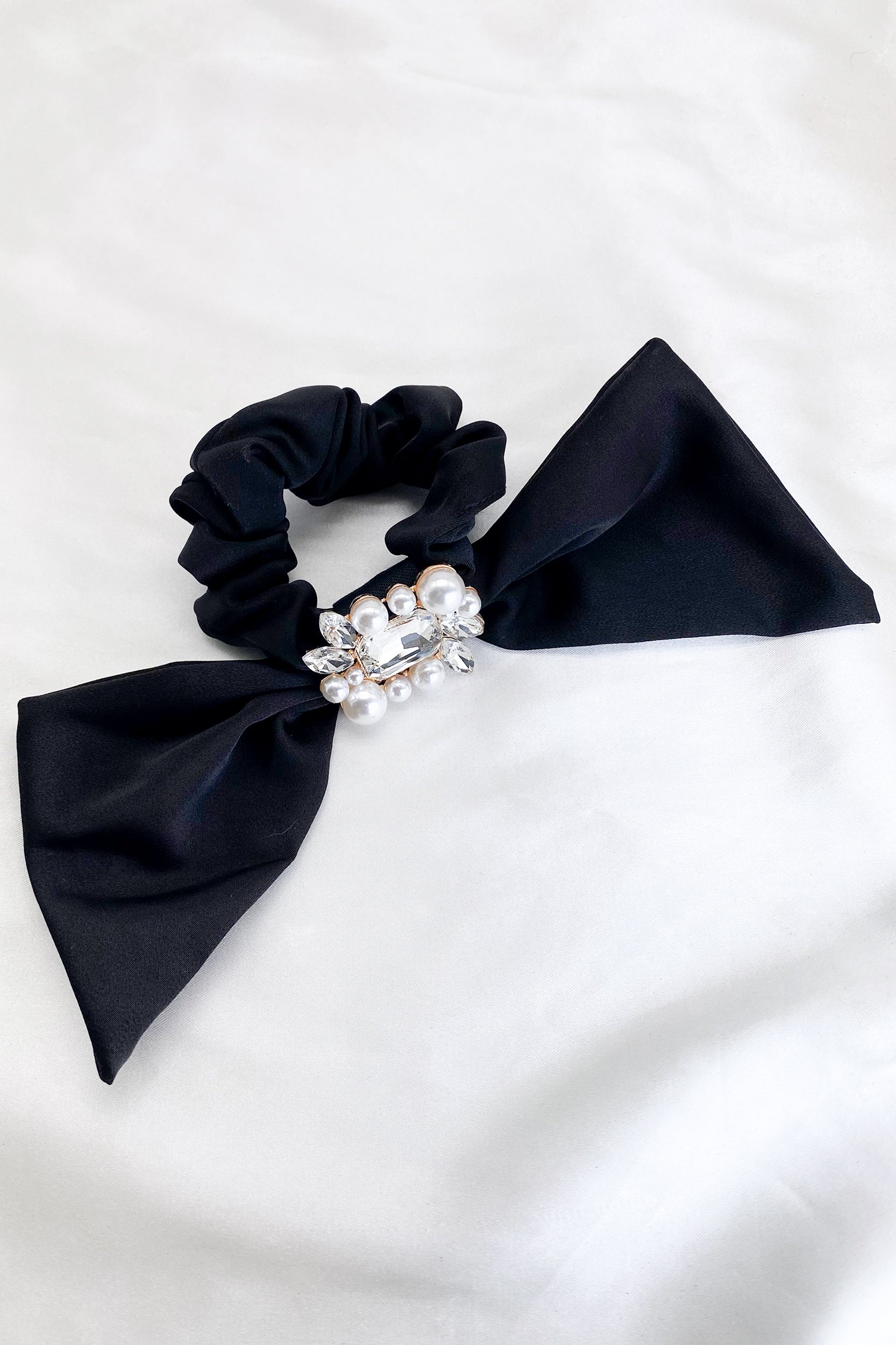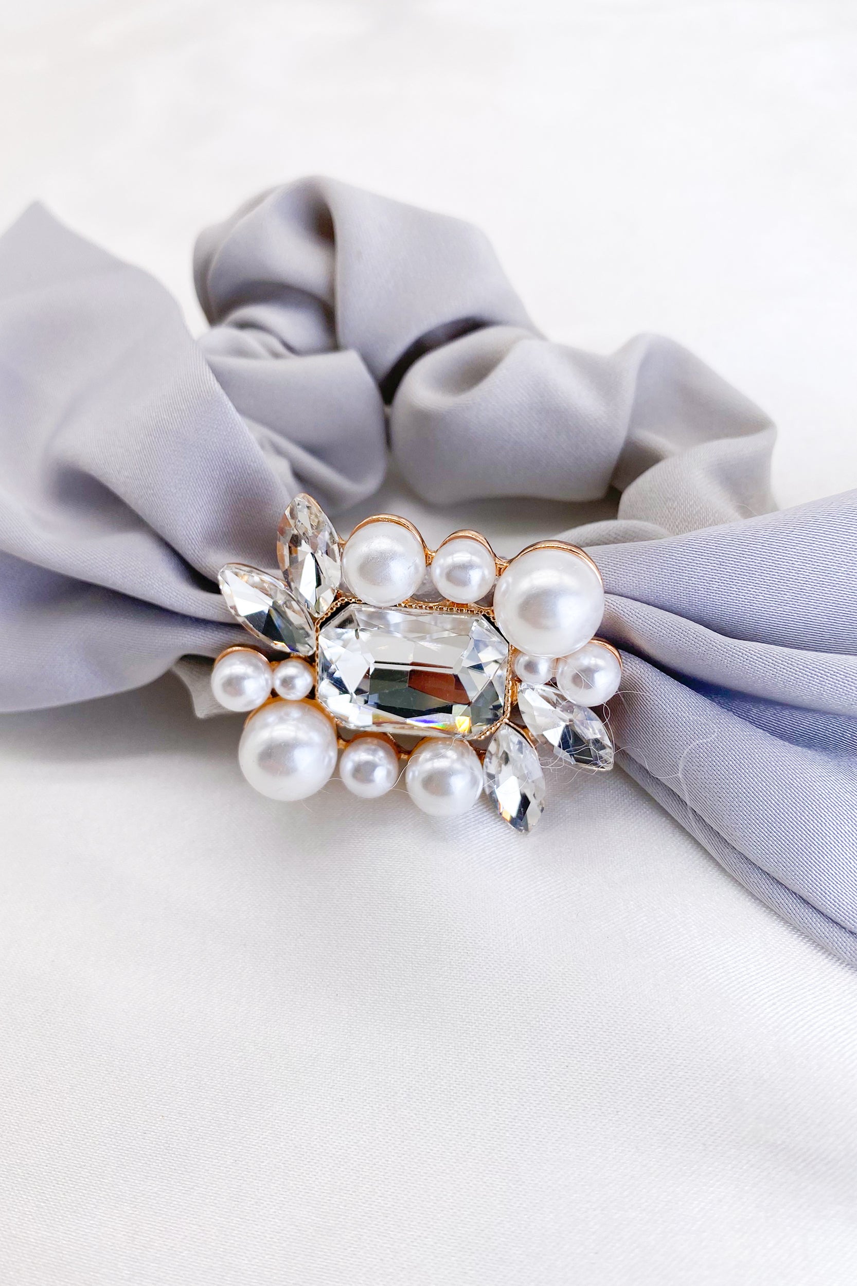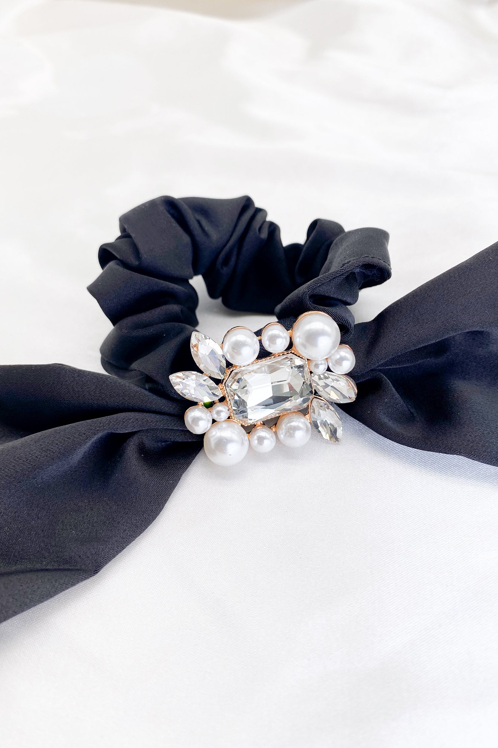 Embrace refined charm with the hair tie. Sparkling crystals and elegant pearls make this chic hair tie a perfect accessory for a touch of quiet luxury.