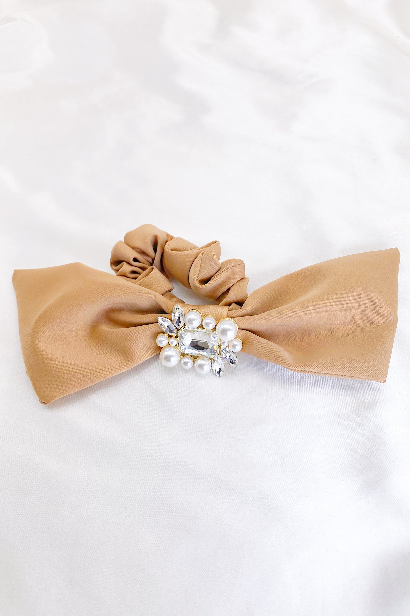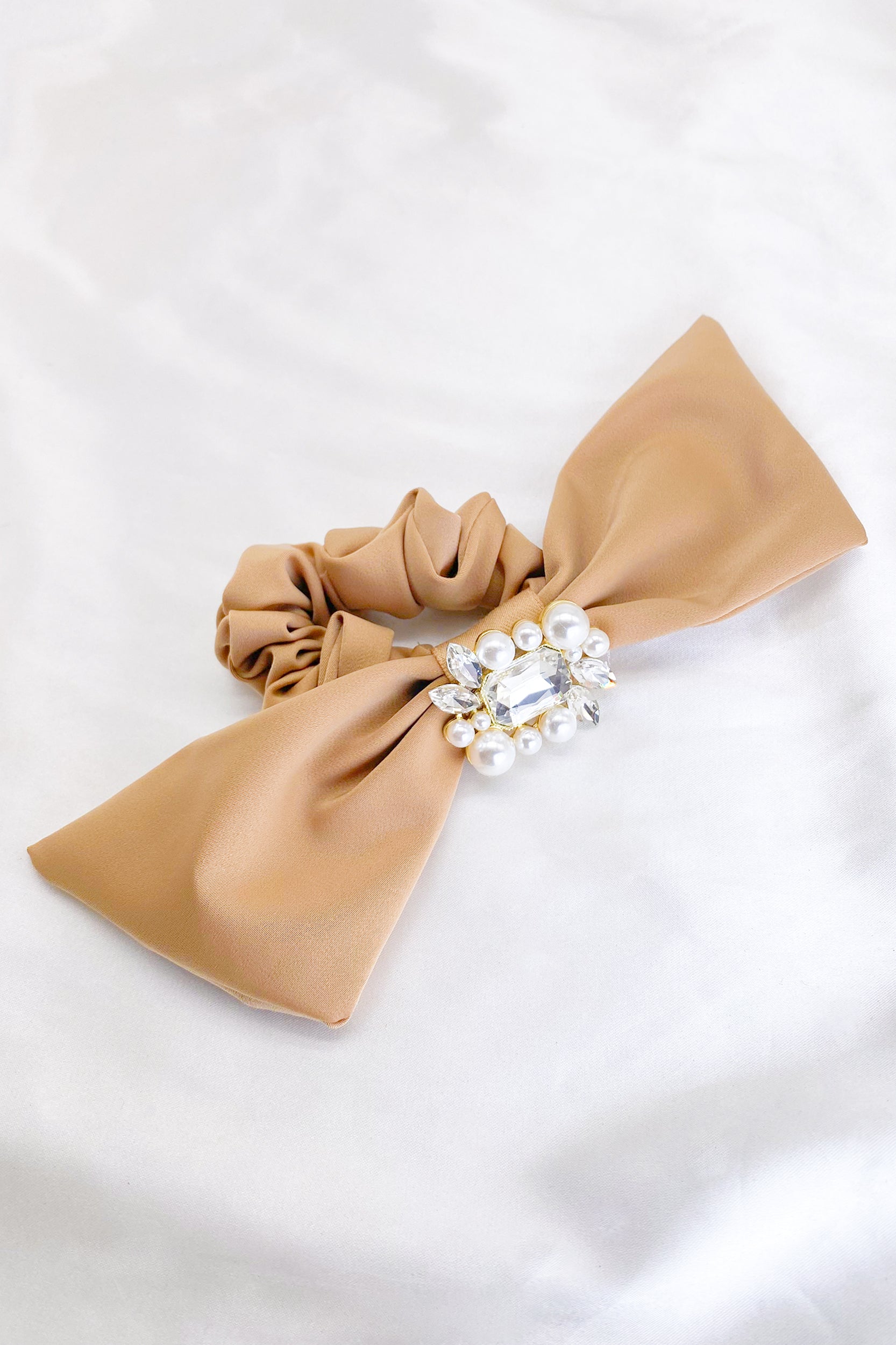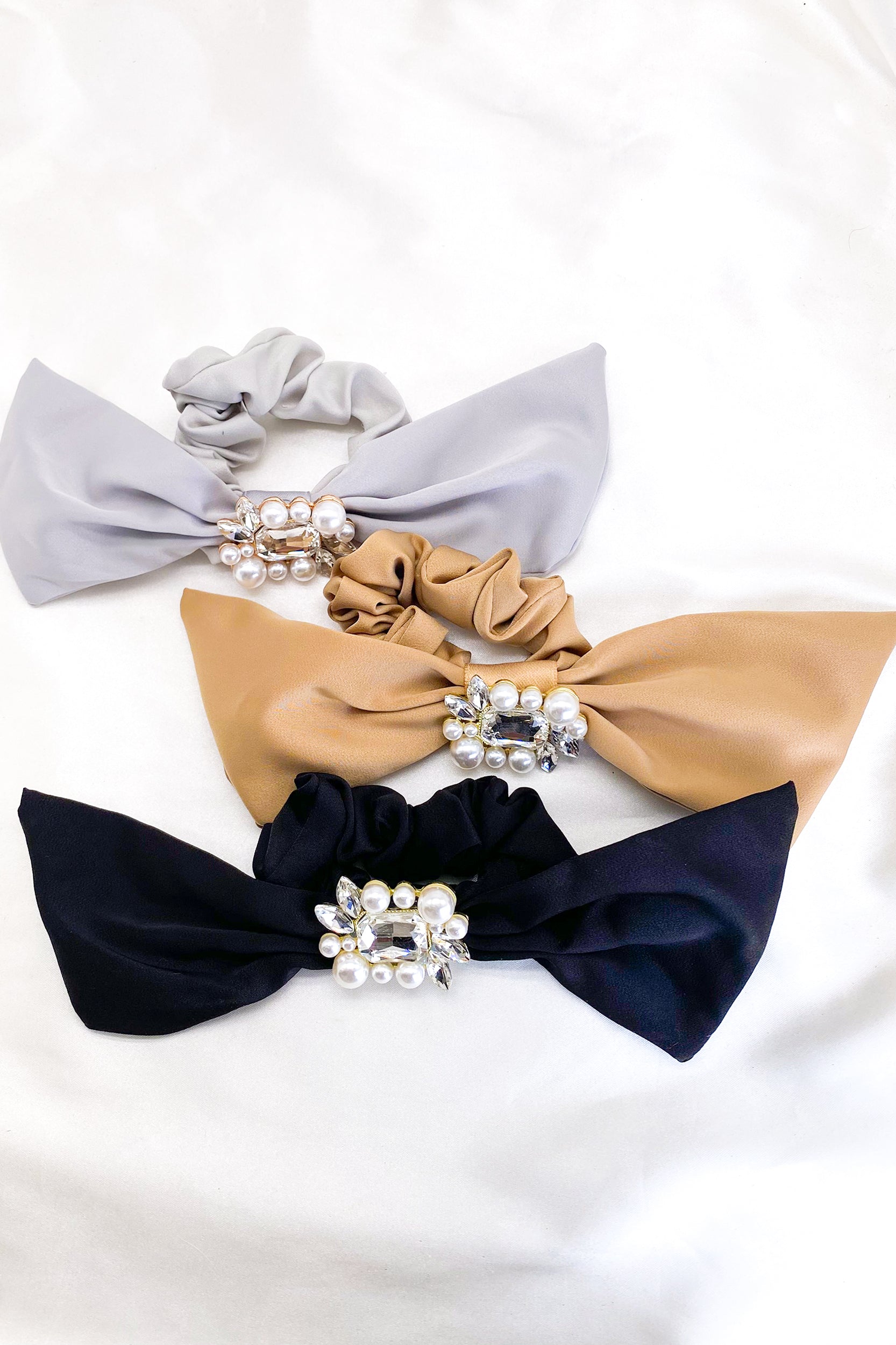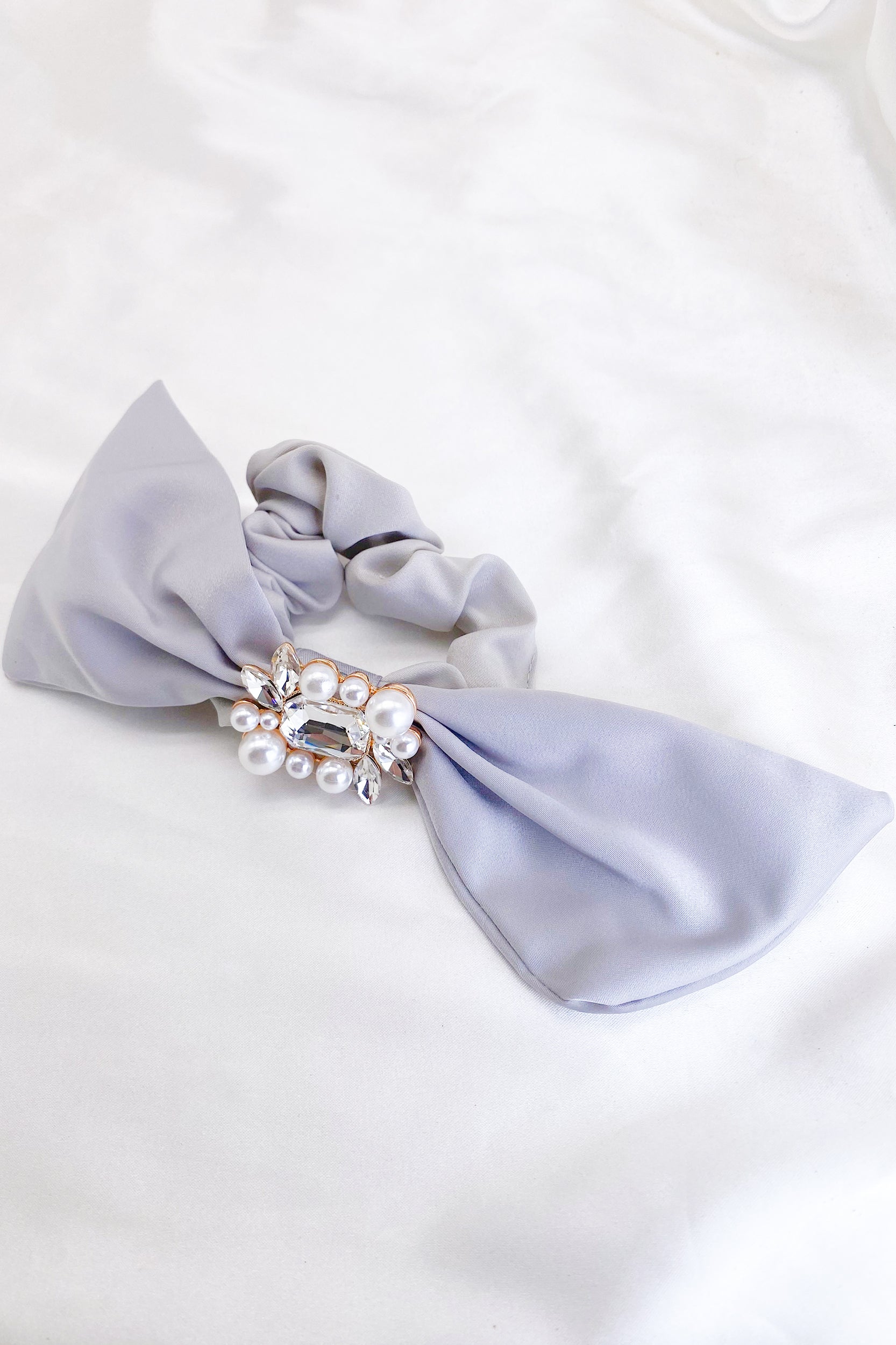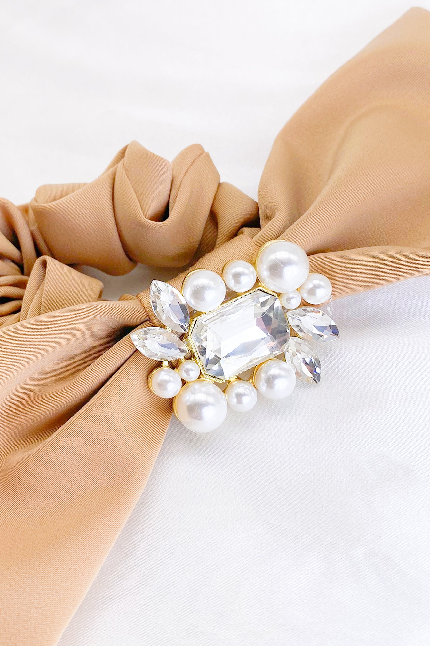Embrace refined charm with the hair tie. Sparkling crystals and elegant pearls make this chic hair tie a perfect accessory for a touch of quiet luxury.