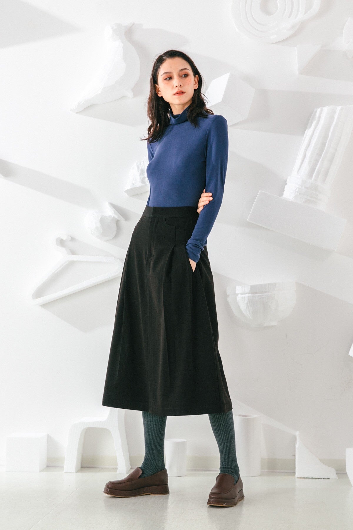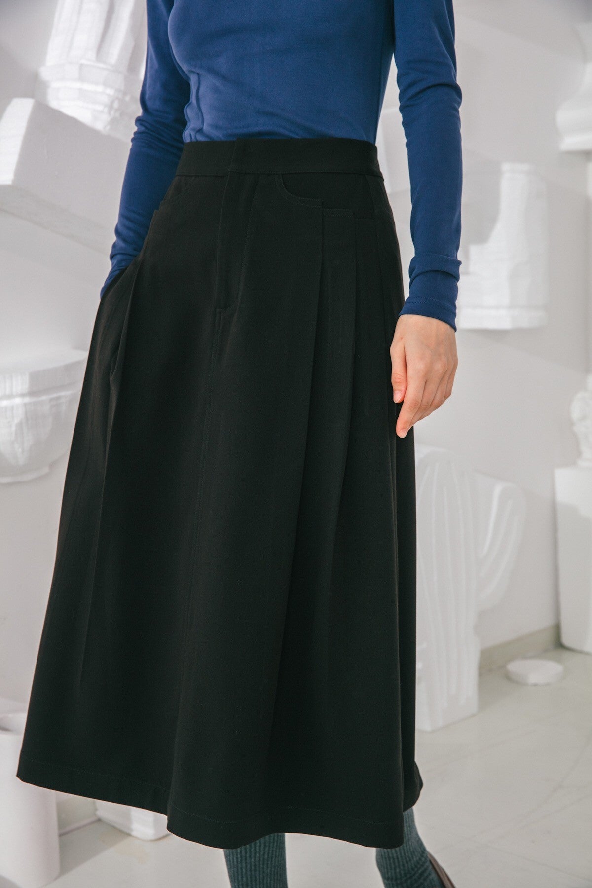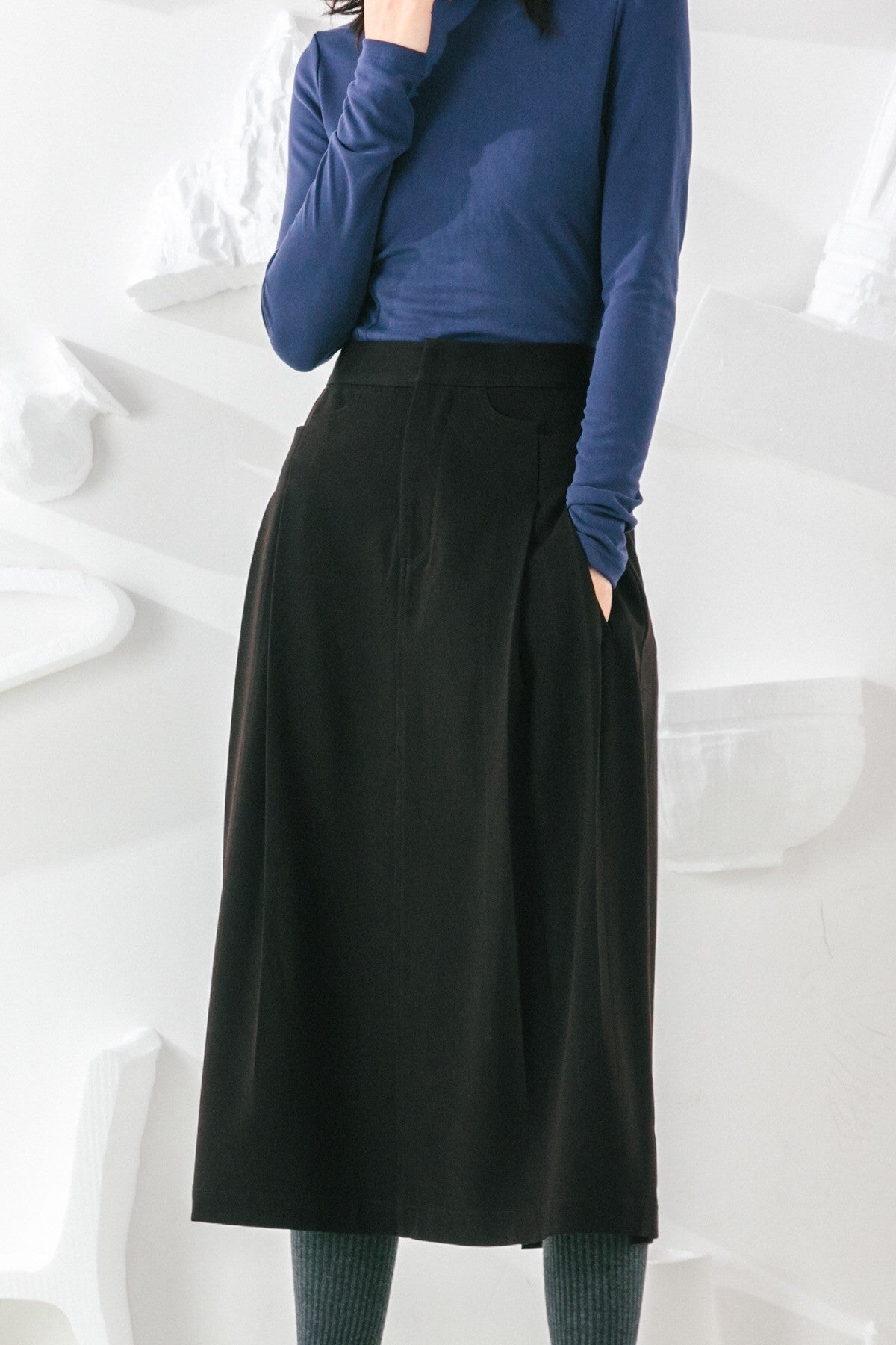 Invest in a timeless wardrobe staple with our Skirt. Its simple yet elegant silhouette is highlighted by elongating vertical pleats and a flattering A-line shape. Wear yours with feminine blouses and sleek outerwear.