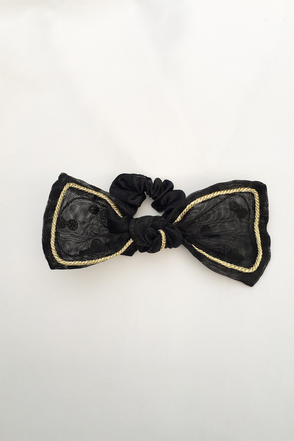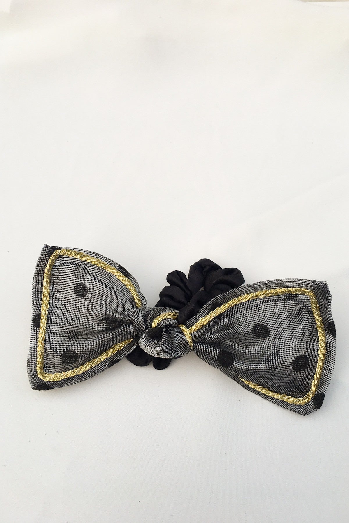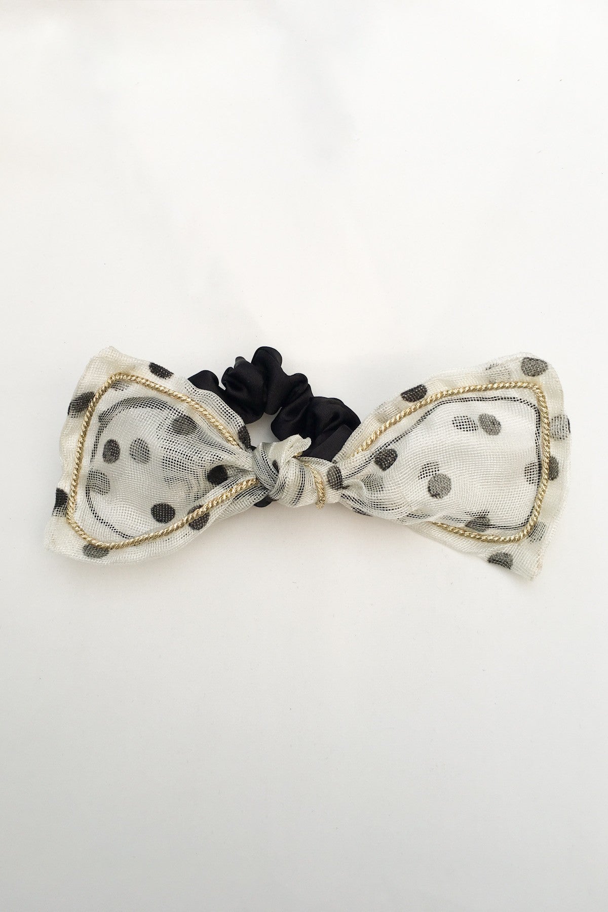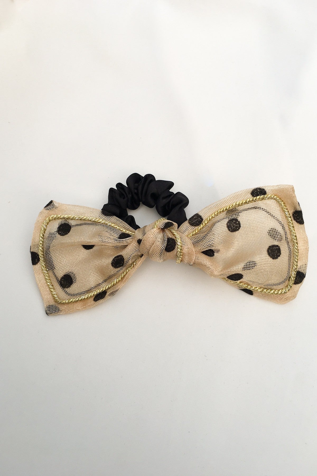 Instantly elevate your hairdo with our beautiful Scrunchie, featuring elegant polka dots and chic metallic gold accents. Wear yours to bring a dash of femininity to your daily ensemble.