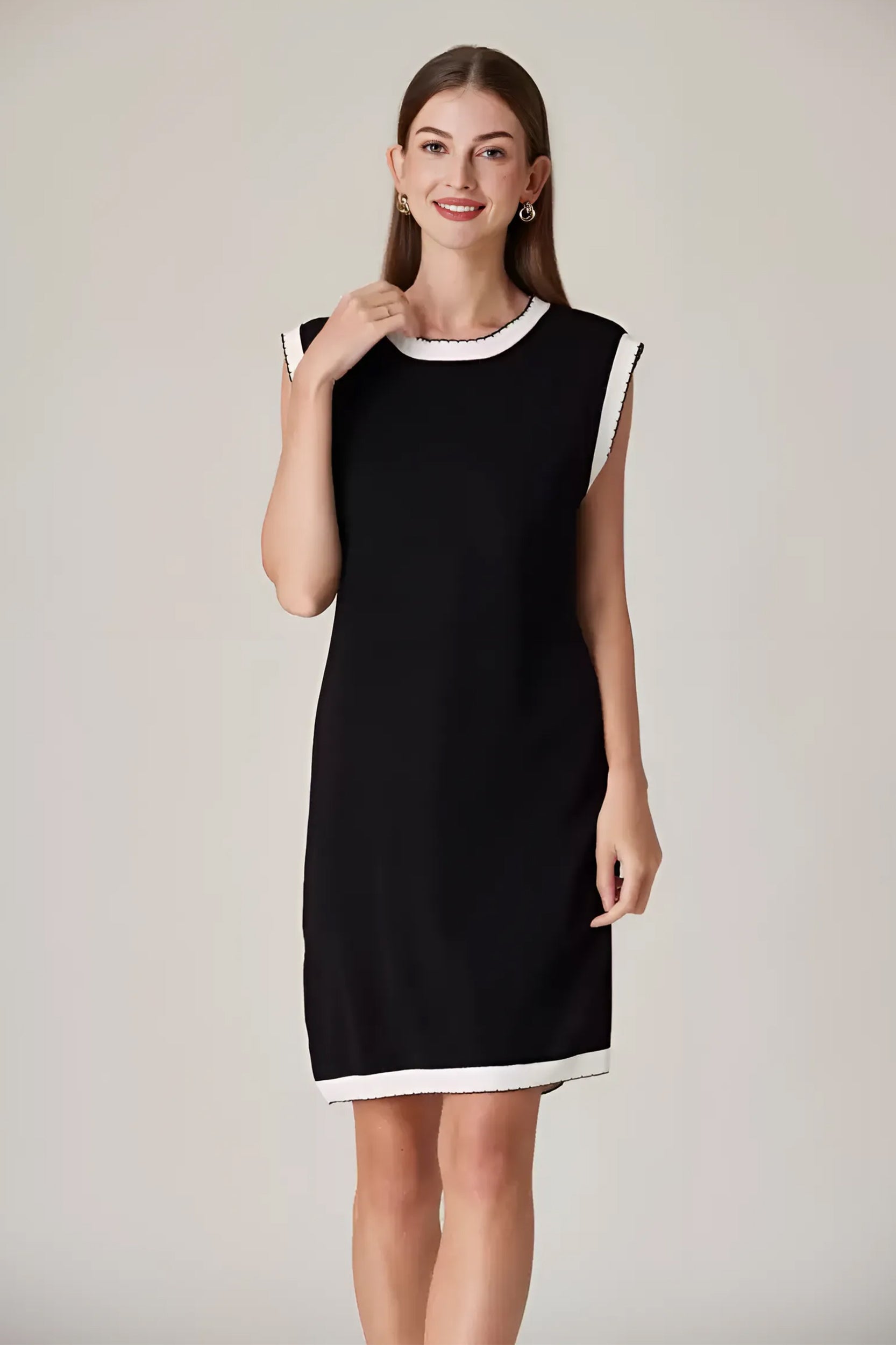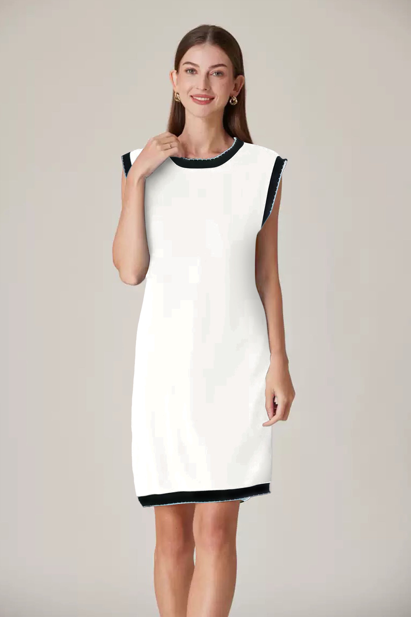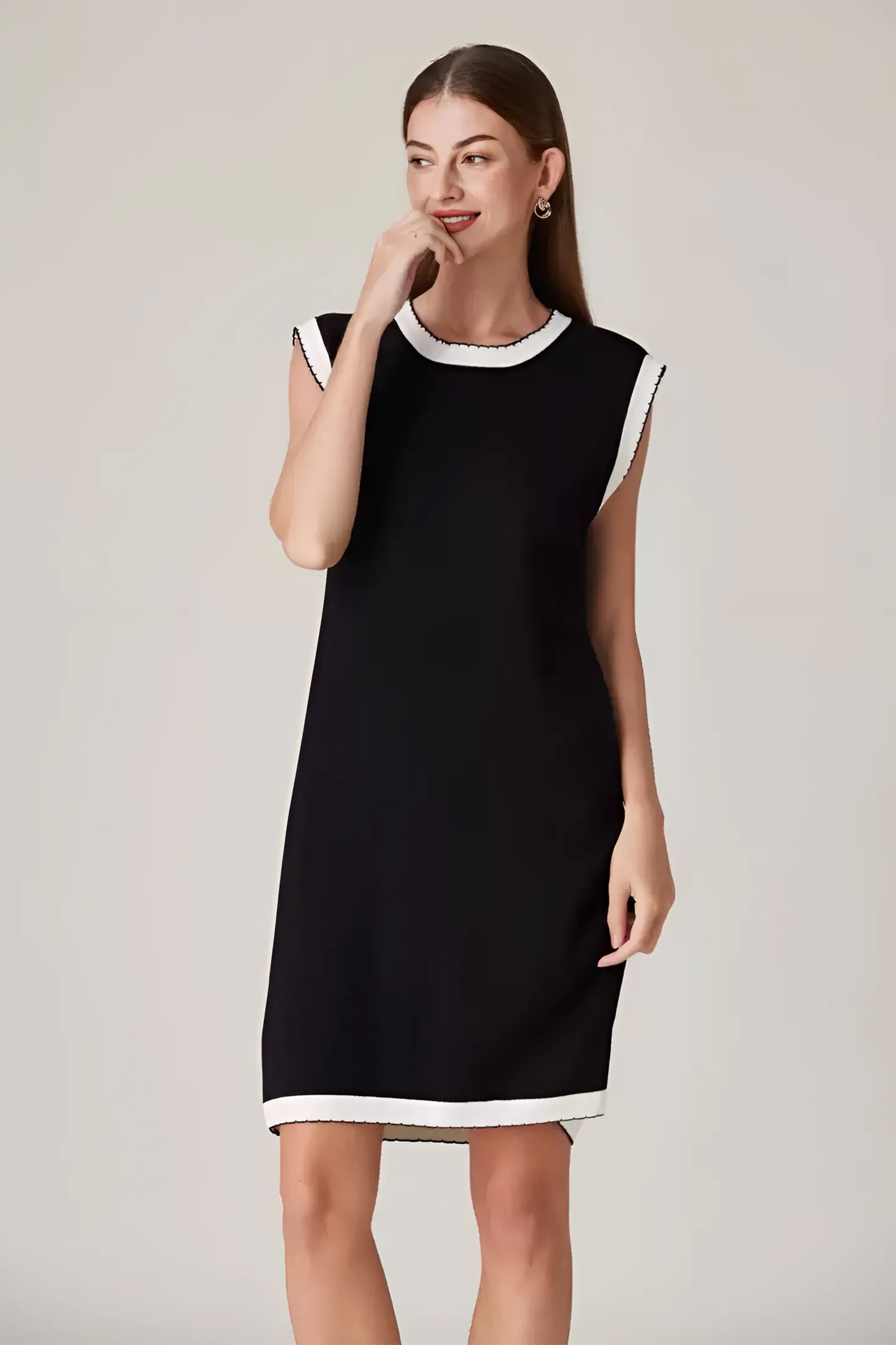 Experience refined sophistication and comfort with our dress. This dress offers a luxurious and comfortable fit with its stretch knit fabric while the classic contrast trim adds a touch of timeless charm.
