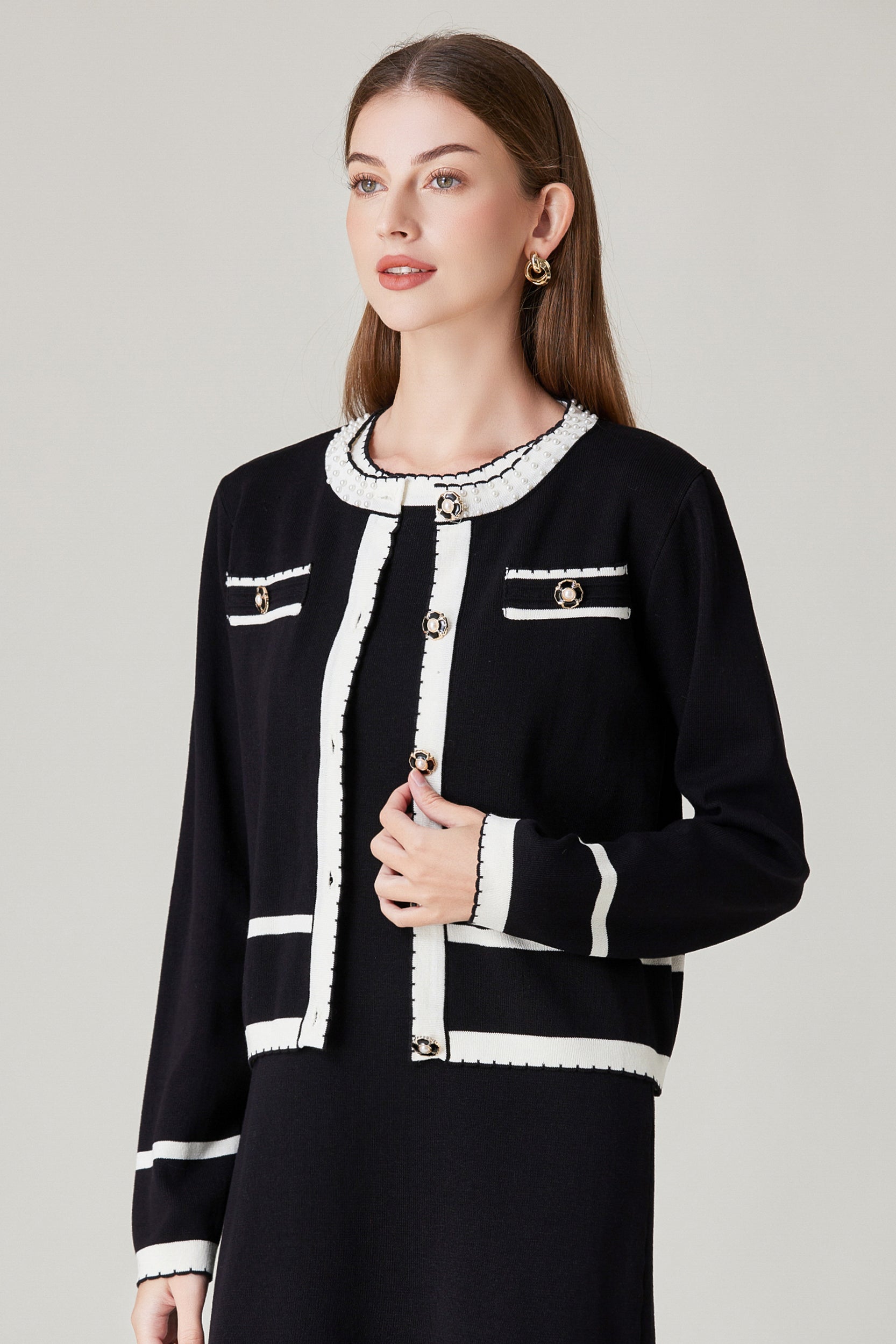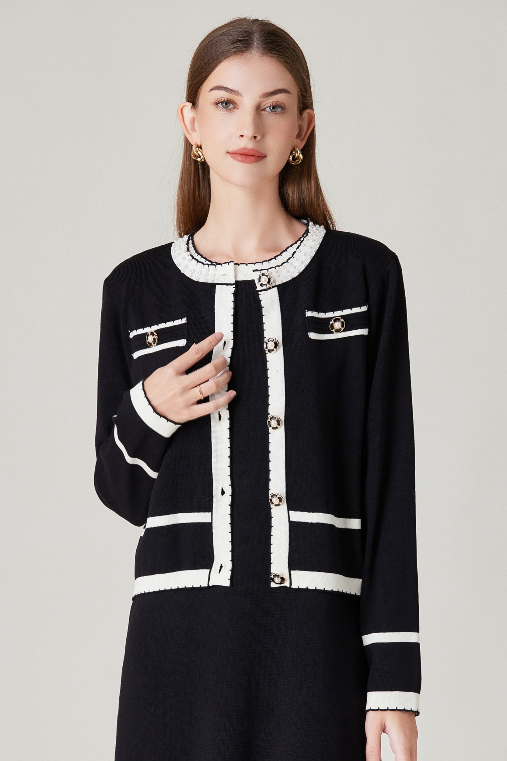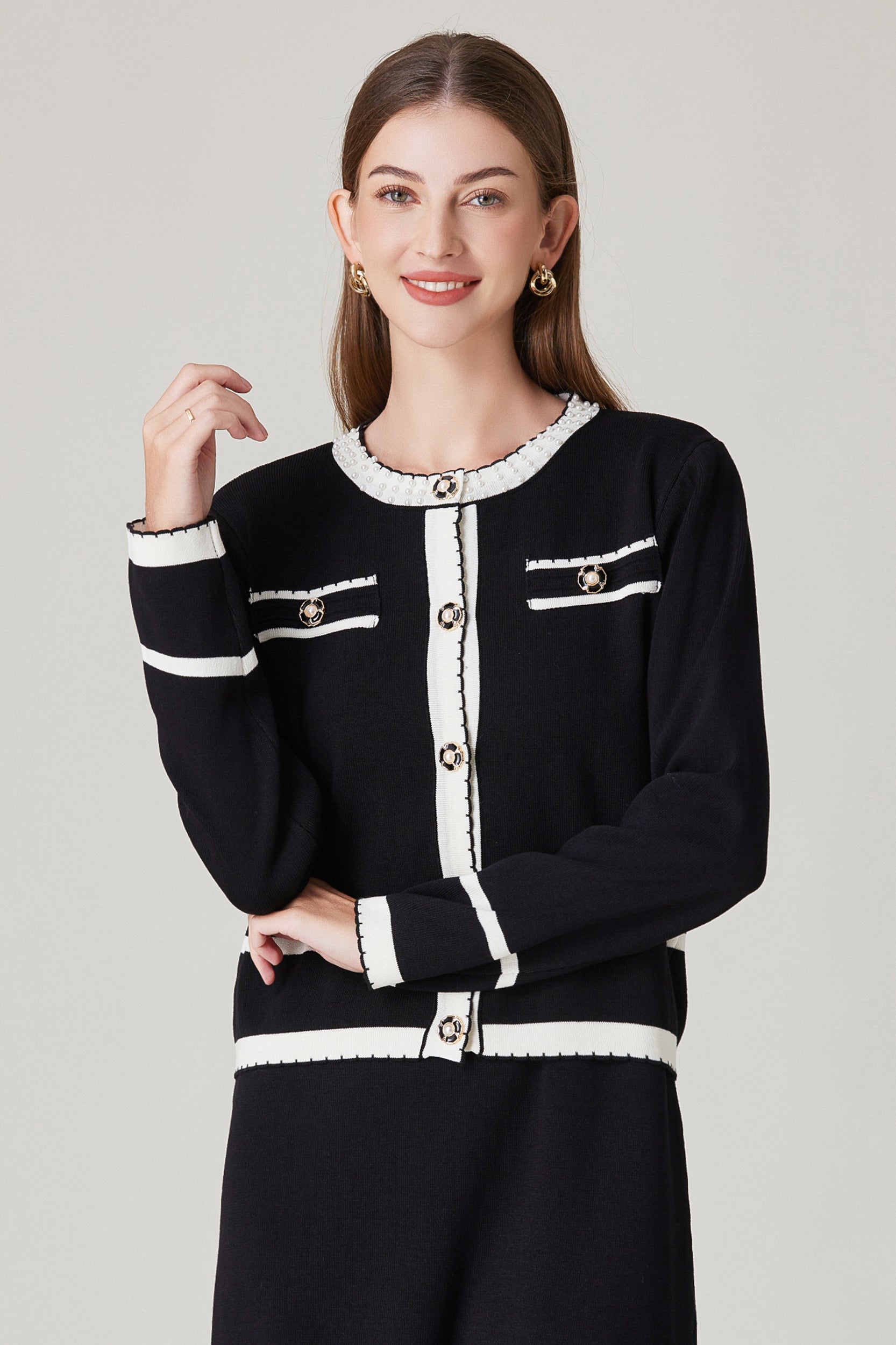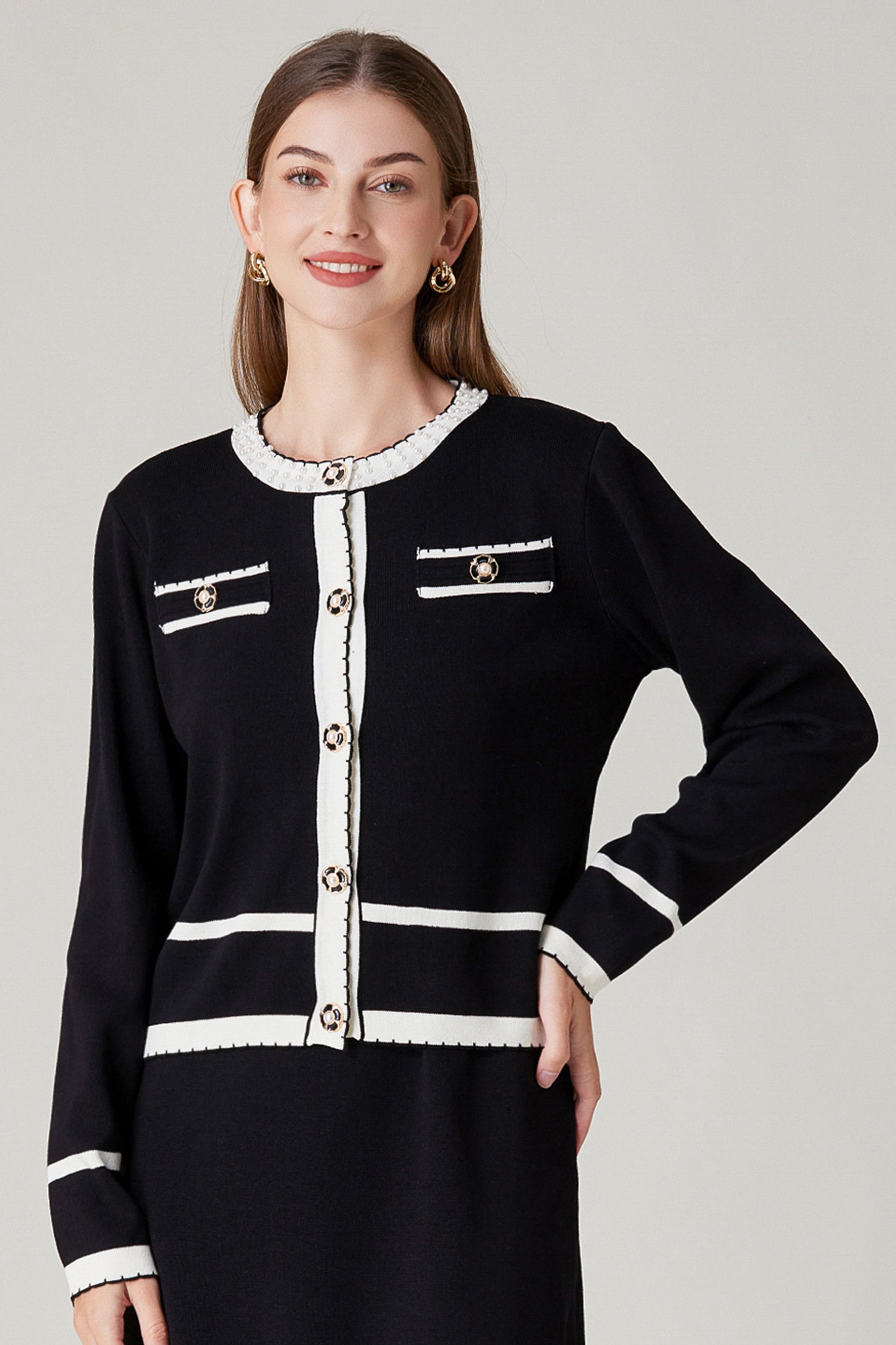Experience refined sophistication and comfort with our cardigan. This cardigan offers a luxurious and comfortable fit with its stretch knit fabric while the classic contrast trim and pearl embellishments adds a touch of timeless charm.