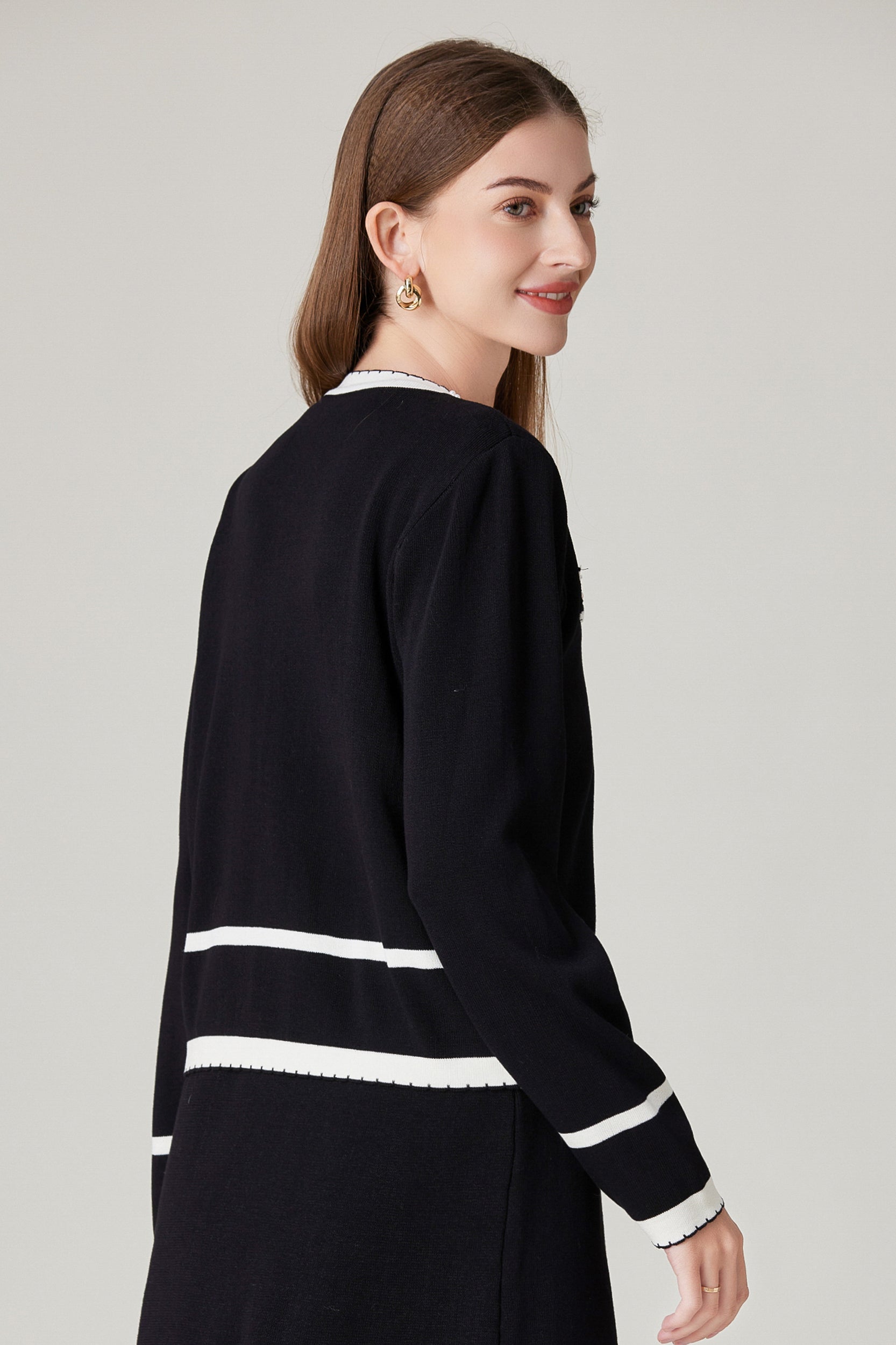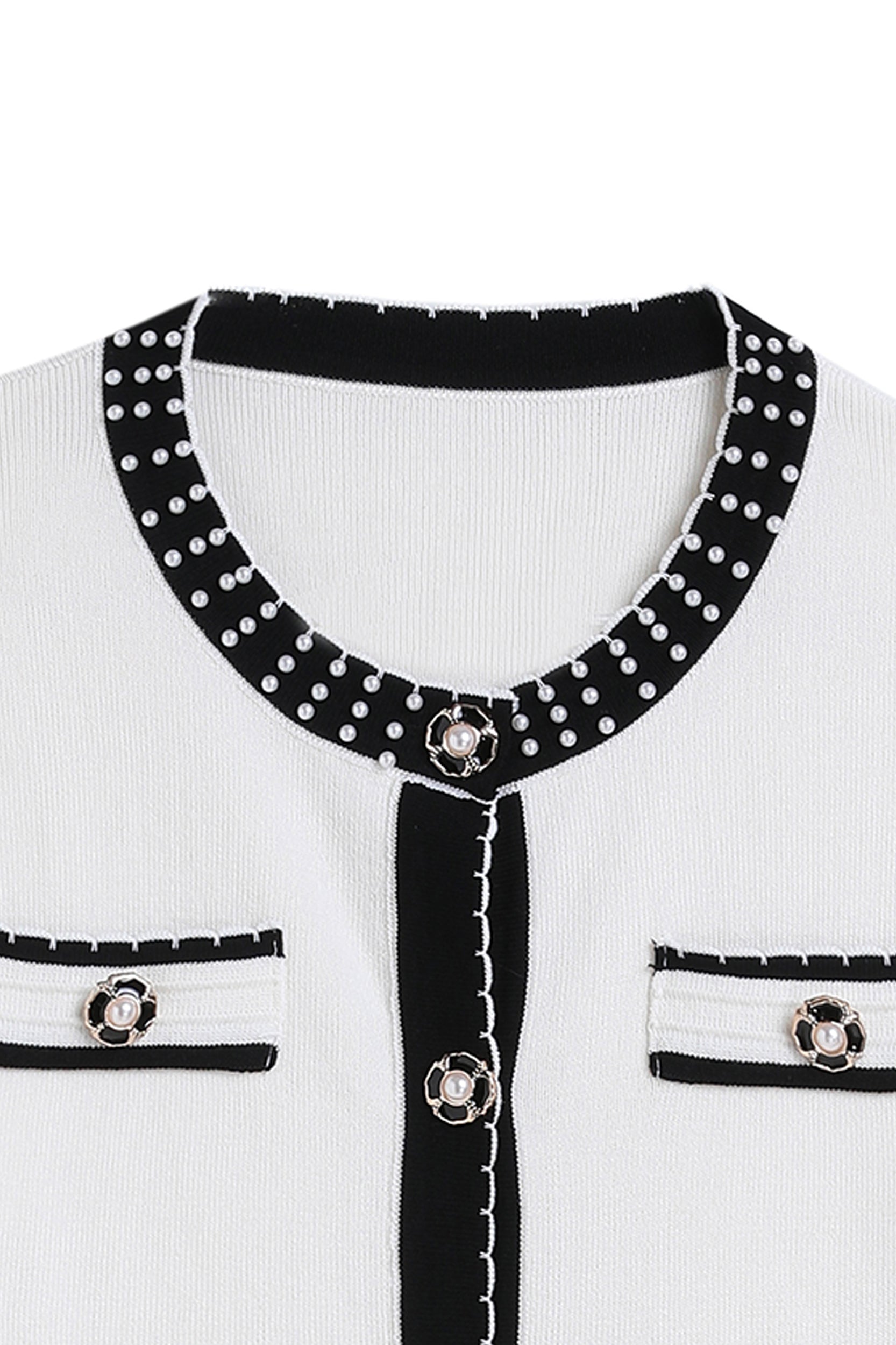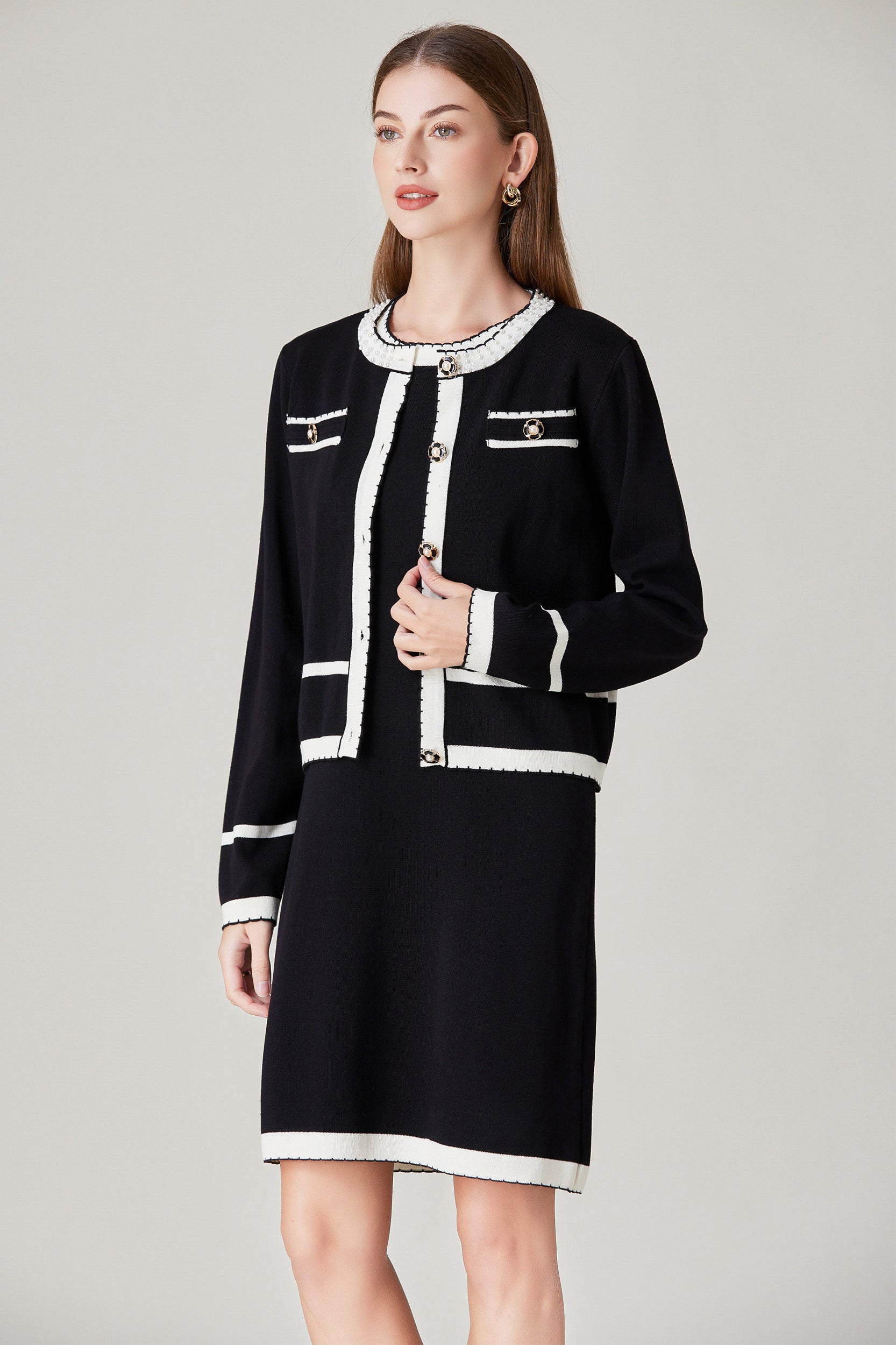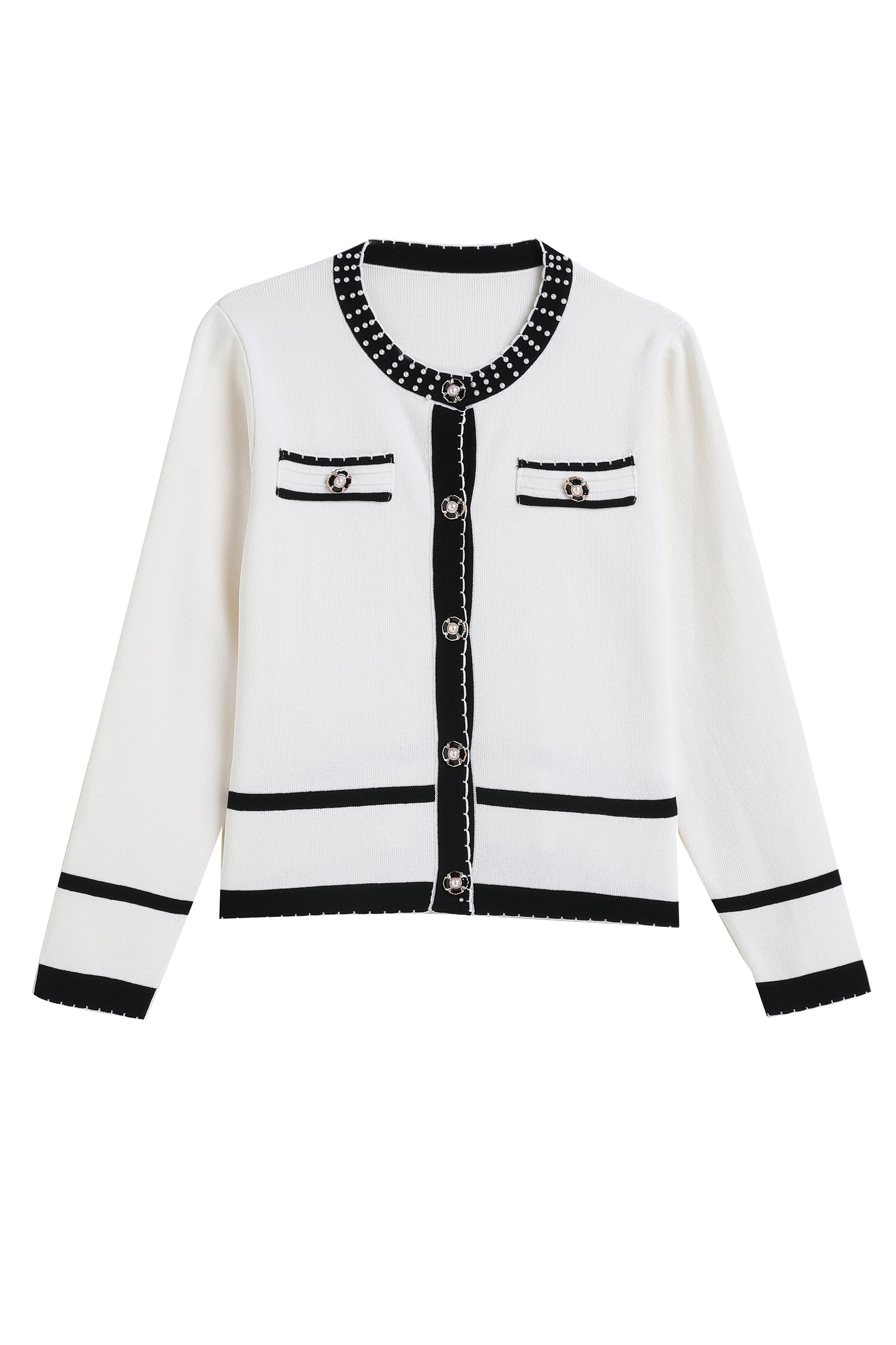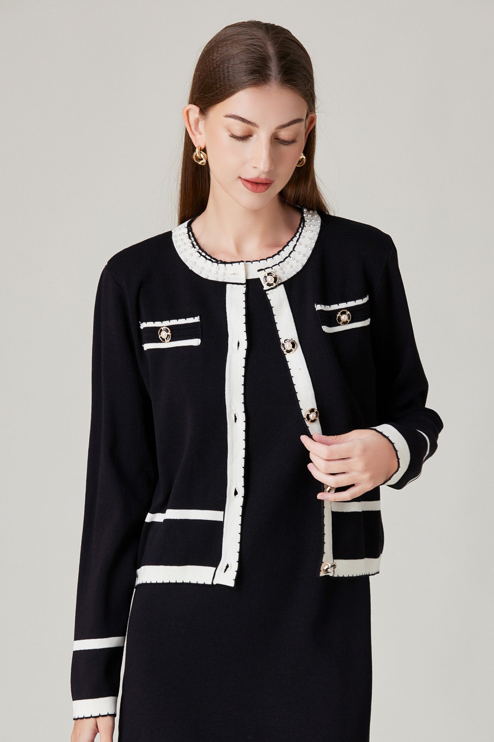 Experience refined sophistication and comfort with our cardigan. This cardigan offers a luxurious and comfortable fit with its stretch knit fabric while the classic contrast trim and pearl embellishments adds a touch of timeless charm.
