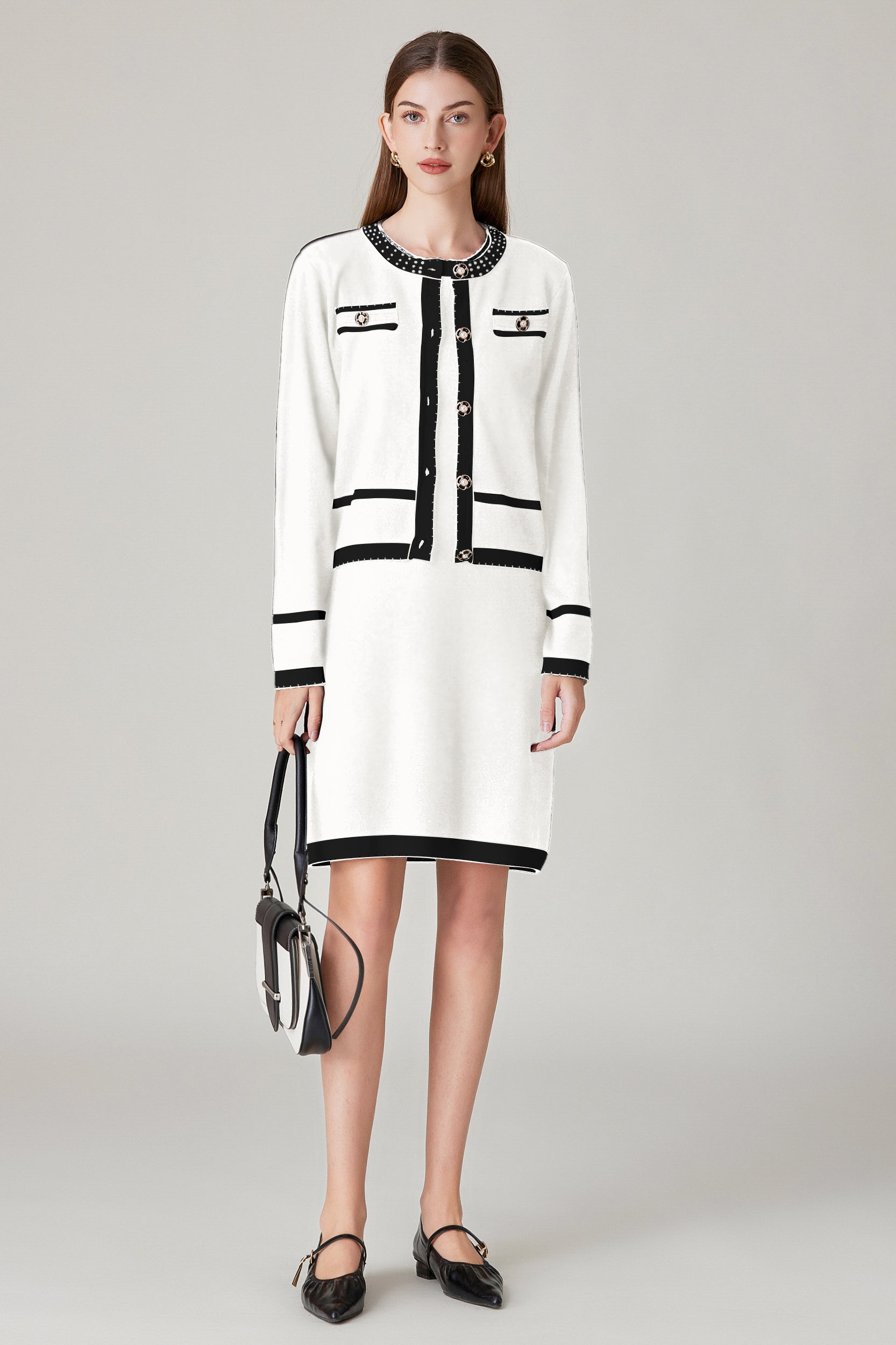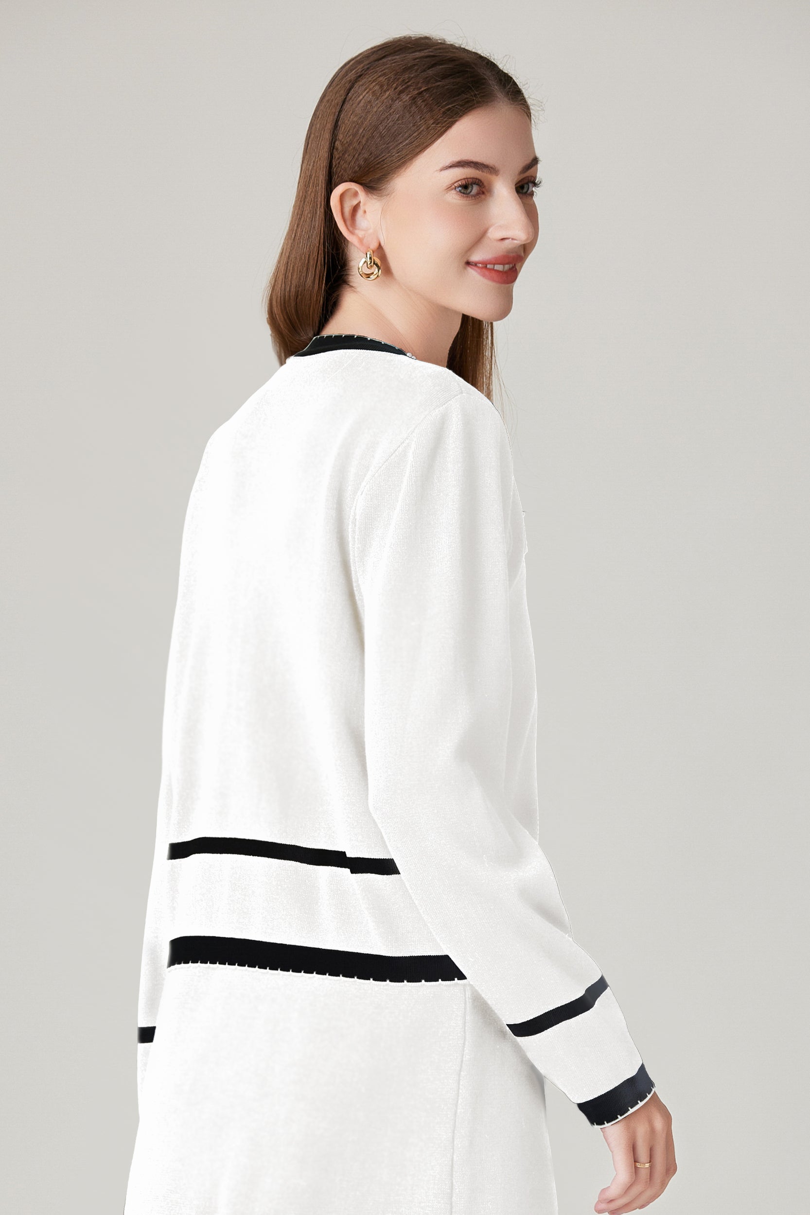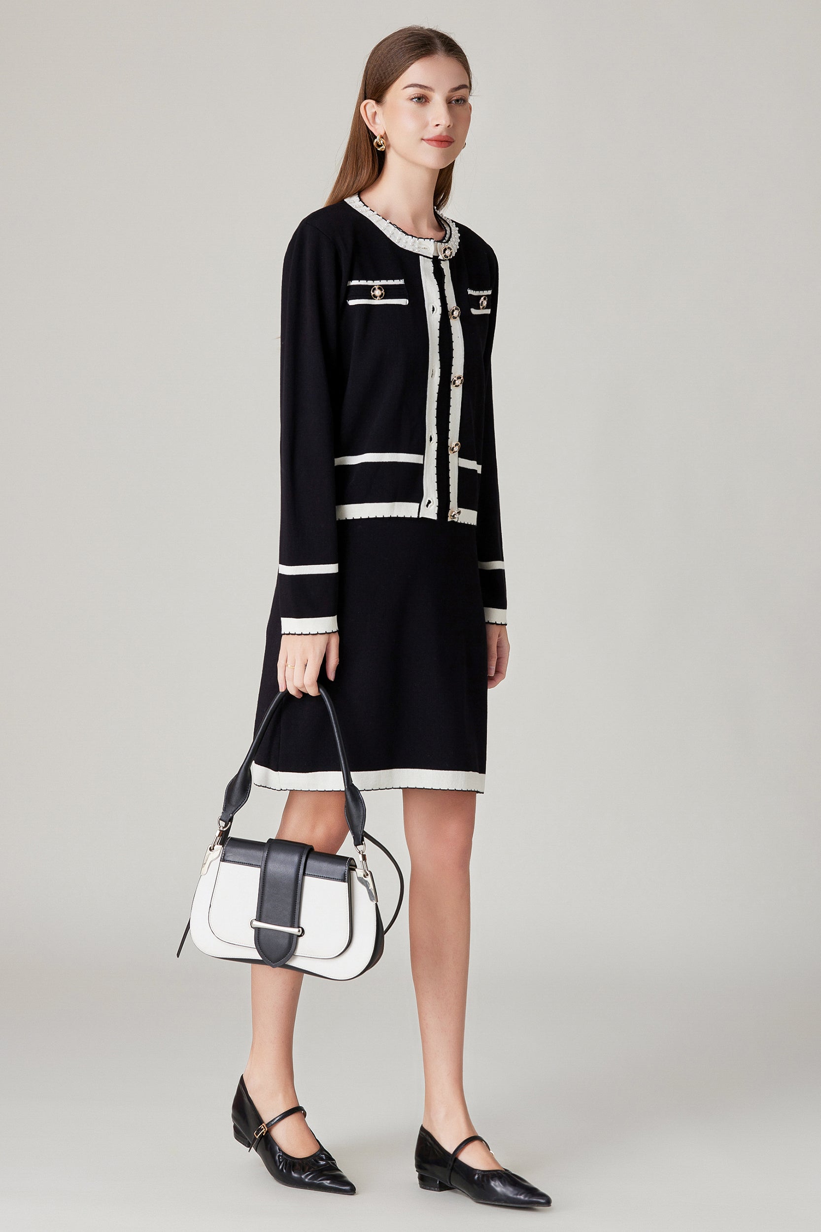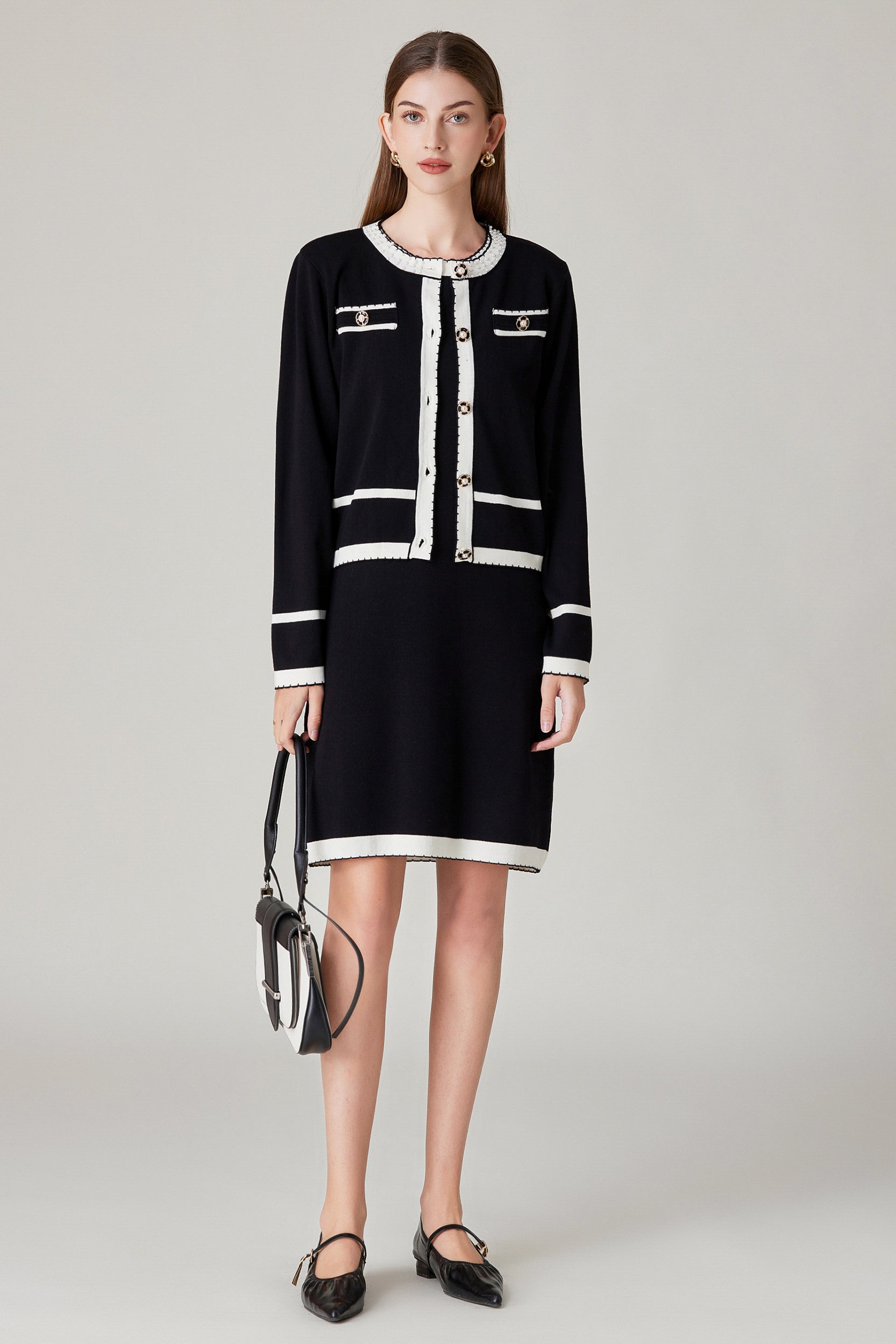 Experience refined sophistication and comfort with our cardigan. This cardigan offers a luxurious and comfortable fit with its stretch knit fabric while the classic contrast trim and pearl embellishments adds a touch of timeless charm.